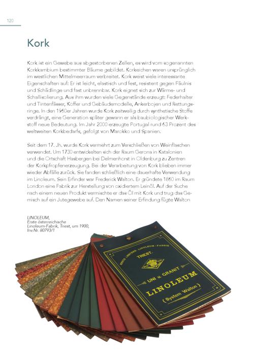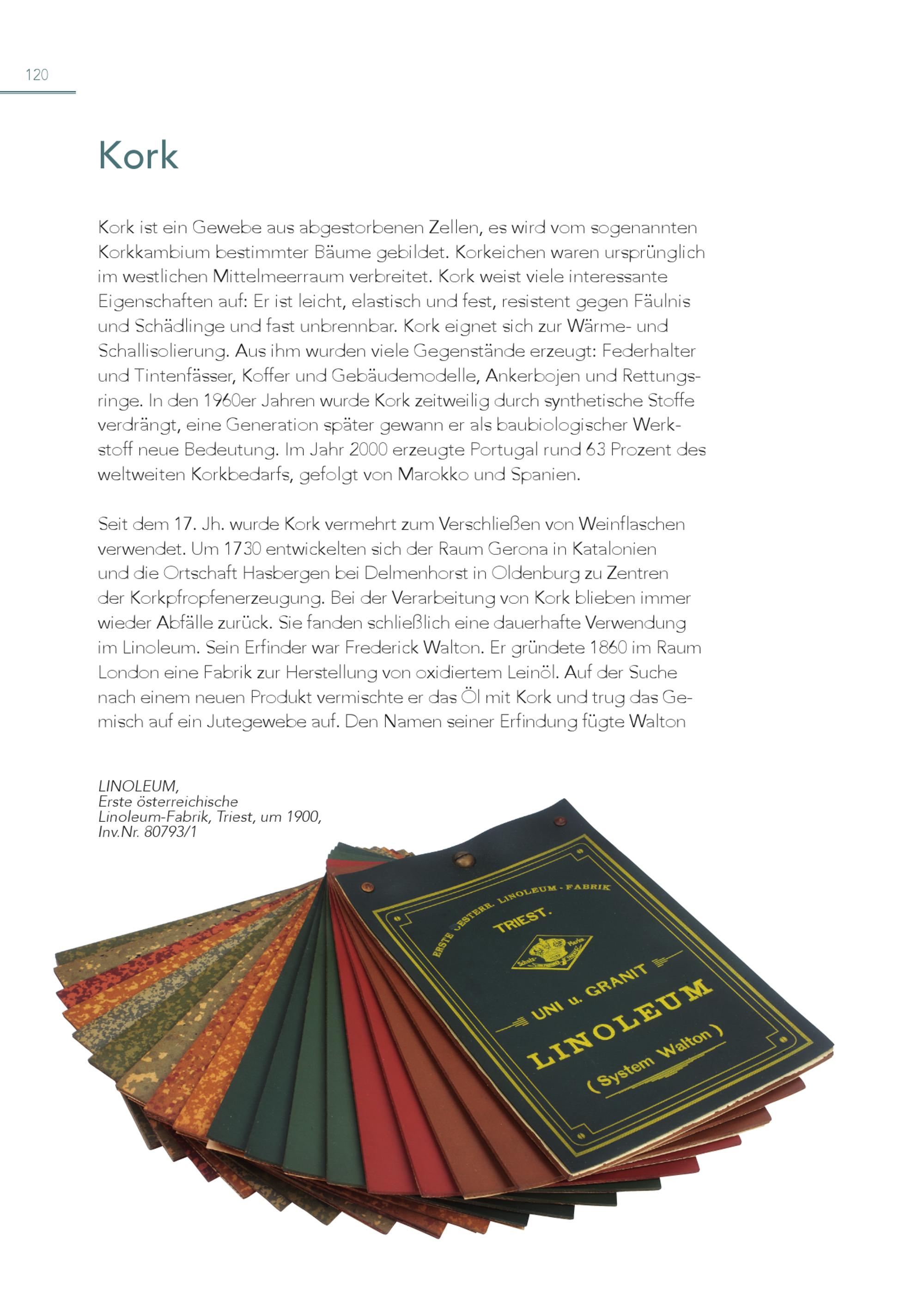 120 Kork Kork ist ein Gewebe aus abgestorbenen Zellen, es wird vom sogenannten Korkkambium bestimmter Bäume gebildet. Korkeichen waren ursprünglich im westlichen Mittelmeerraum verbreitet. Kork weist viele interessante Eigenschaften auf: Er ist leicht, elastisch und fest, resistent gegen Fäulnis und Schädlinge und fast unbrennbar. Kork eignet sich zur Wärme- und Schallisolierung. Aus ihm wurden viele Gegenstände erzeugt: Federhalter und Tintenfässer, Koffer und Gebäudemodelle, Ankerbojen und Rettungsringe. In den 1960er Jahren wurde Kork zeitweilig durch synthetische Stoffe verdrängt, eine Generation später gewann er als baubiologischer Werkstoff neue Bedeutung. Im Jahr 2000 erzeugte Portugal rund 63 Prozent des weltweiten Korkbedarfs, gefolgt von Marokko und Spanien. Seit dem 17. Jh. wurde Kork vermehrt zum Verschließen von Weinflaschen verwendet. Um 1730 entwickelten sich der Raum Gerona in Katalonien und die Ortschaft Hasbergen bei Delmenhorst in Oldenburg zu Zentren der Korkpfropfenerzeugung. Bei der Verarbeitung von Kork blieben immer wieder Abfälle zurück. Sie fanden schließlich eine dauerhafte Verwendung im Linoleum. Sein Erfinder war Frederick Walton. Er gründete 1860 im Raum London eine Fabrik zur Herstellung von oxidiertem Leinöl. Auf der Suche nach einem neuen Produkt vermischte er das Öl mit Kork und trug das Ge misch auf ein Jutegewebe auf. Den Namen seiner Erfindung fügte Walton LINOLEUM, Erste österreichische Linoleum-Fabrik, Triest, um 1900, Inv.Nr. 80793/1