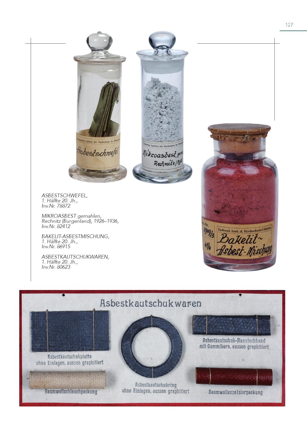 127 ASBESTSCHWEFEL, 1. Hälfte 20. Jh., Inv.Nr. 78872 MIKROASBEST gemahlen, Rechnitz(Burgenland), 1926–1936, Inv.Nr. 82412 BAKELIT-ASBESTMISCHUNG, 1. Hälfte 20. Jh., Inv.Nr. 86915 ASBESTKAUTSCHUKWAREN, 1. Hälfte 20. Jh., Inv.Nr. 80623