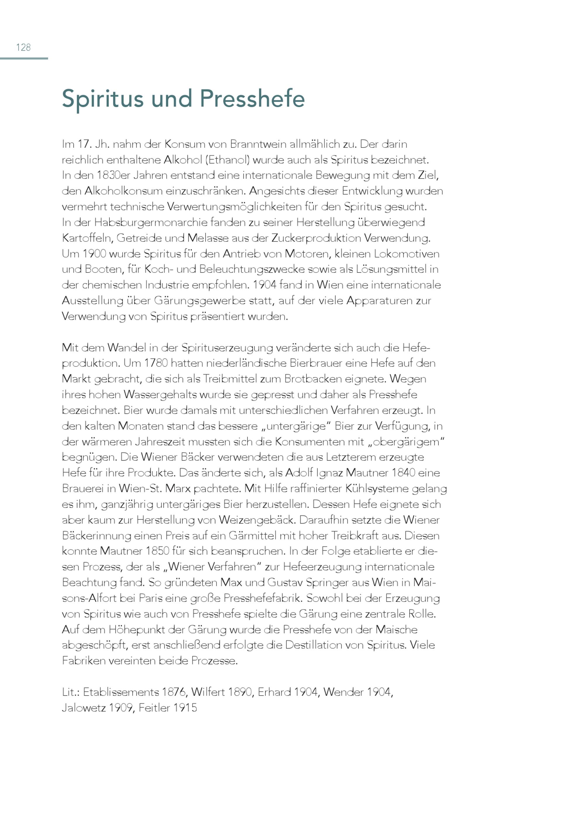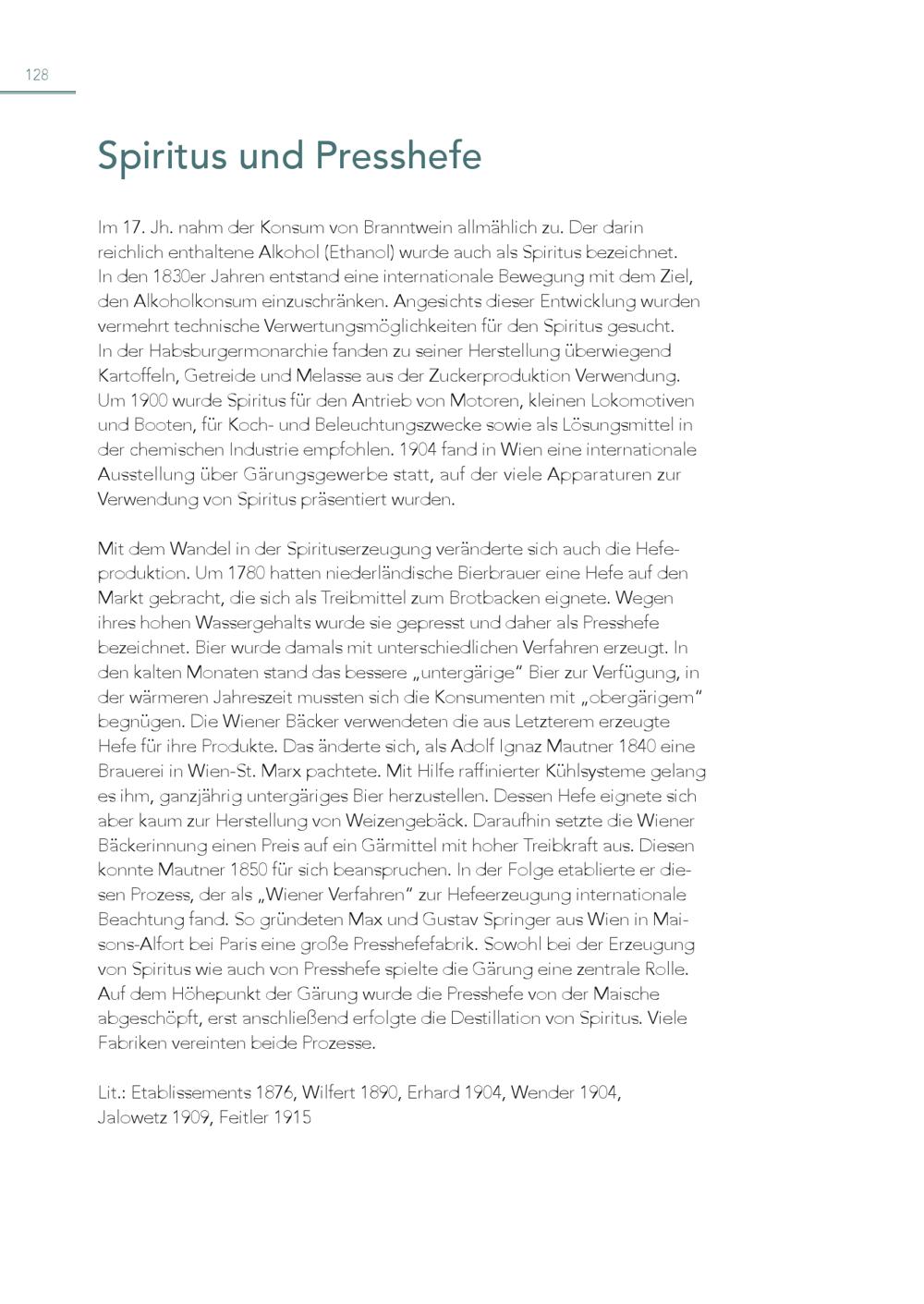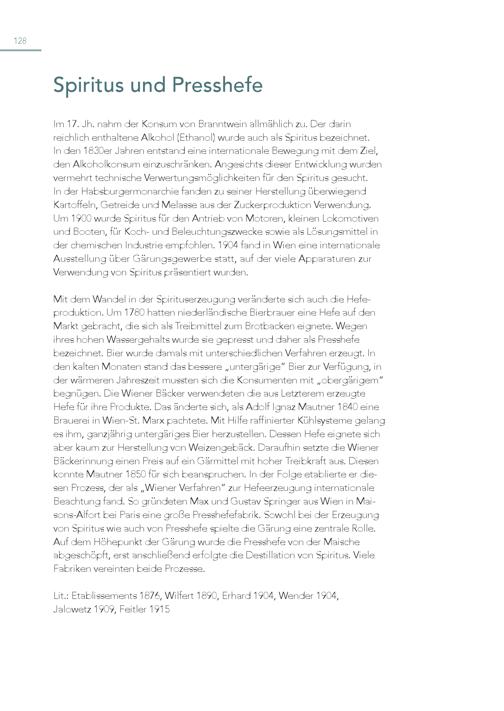 128 Spiritus und Presshefe Im 17. Jh. nahm der Konsum von Branntwein allmählich zu. Der darin reichlich enthaltene Alkohol(Ethanol) wurde auch als Spiritus bezeichnet. In den 1830er Jahren entstand eine internationale Bewegung mit dem Ziel, den Alkoholkonsum einzuschränken. Angesichts dieser Entwicklung wurden vermehrt technische Verwertungsmöglichkeiten für den Spiritus gesucht. In der Habsburgermonarchie fanden zu seiner Herstellung überwiegend Kartoffeln, Getreide und Melasse aus der Zuckerproduktion Verwendung. Um 1900 wurde Spiritus für den Antrieb von Motoren, kleinen Lokomotiven und Booten, für Koch- und Beleuchtungszwecke sowie als Lösungsmittel in der chemischen Industrie empfohlen. 1904 fand in Wien eine internationale Ausstellung über Gärungsgewerbe statt, auf der viele Apparaturen zur Verwendung von Spiritus präsentiert wurden. Mit dem Wandel in der Spirituserzeugung veränderte sich auch die Hefeproduktion. Um 1780 hatten niederländische Bierbrauer eine Hefe auf den Markt gebracht, die sich als Treibmittel zum Brotbacken eignete. Wegen ihres hohen Wassergehalts wurde sie gepresst und daher als Presshefe bezeichnet. Bier wurde damals mit unterschiedlichen Verfahren erzeugt. In den kalten Monaten stand das bessere„untergärige“ Bier zur Verfügung, in der wärmeren Jahreszeit mussten sich die Konsumenten mit„obergärigem“ begnügen. Die Wiener Bäcker verwendeten die aus Letzterem erzeugte Hefe für ihre Produkte. Das änderte sich, als Adolf Ignaz Mautner 1840 eine Brauerei in Wien-St. Marx pachtete. Mit Hilfe raffinierter Kühlsysteme gelang es ihm, ganzjährig untergäriges Bier herzustellen. Dessen Hefe eignete sich aber kaum zur Herstellung von Weizengebäck. Daraufhin setzte die Wiener Bäckerinnung einen Preis auf ein Gärmittel mit hoher Treibkraft aus. Diesen konnte Mautner 1850 für sich beanspruchen. In der Folge etablierte er die sen Prozess, der als„Wiener Verfahren“ zur Hefeerzeugung internationale Beachtung fand. So gründeten Max und Gustav Springer aus Wien in Maisons-Alfort bei Paris eine große Presshefefabrik. Sowohl bei der Erzeugung von Spiritus wie auch von Presshefe spielte die Gärung eine zentrale Rolle. Auf dem Höhepunkt der Gärung wurde die Presshefe von der Maische abgeschöpft, erst anschließend erfolgte die Destillation von Spiritus. Viele Fabriken vereinten beide Prozesse. Lit.: Etablissements 1876, Wilfert 1890, Erhard 1904, Wender 1904, Jalowetz 1909, Feitler 1915