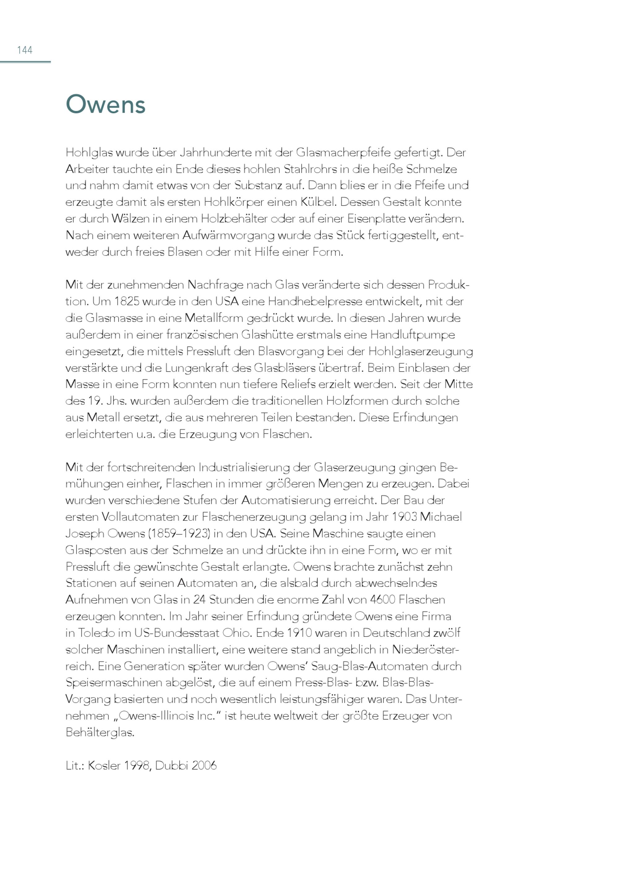 144 Owens Hohlglas wurde über Jahrhunderte mit der Glasmacherpfeife gefertigt. Der Arbeiter tauchte ein Ende dieses hohlen Stahlrohrs in die heiße Schmelze und nahm damit etwas von der Substanz auf. Dann blies er in die Pfeife und erzeugte damit als ersten Hohlkörper einen Külbel. Dessen Gestalt konnte er durch Wälzen in einem Holzbehälter oder auf einer Eisenplatte verändern. Nach einem weiteren Aufwärmvorgang wurde das Stück fertiggestellt, entweder durch freies Blasen oder mit Hilfe einer Form. Mit der zunehmenden Nachfrage nach Glas veränderte sich dessen Produktion. Um 1825 wurde in den USA eine Handhebelpresse entwickelt, mit der die Glasmasse in eine Metallform gedrückt wurde. In diesen Jahren wurde außerdem in einer französischen Glashütte erstmals eine Handluftpumpe eingesetzt, die mittels Pressluft den Blasvorgang bei der Hohlglaserzeugung verstärkte und die Lungenkraft des Glasbläsers übertraf. Beim Einblasen der Masse in eine Form konnten nun tiefere Reliefs erzielt werden. Seit der Mitte des 19. Jhs. wurden außerdem die traditionellen Holzformen durch solche aus Metall ersetzt, die aus mehreren Teilen bestanden. Diese Erfindungen erleichterten u.a. die Erzeugung von Flaschen. Mit der fortschreitenden Industrialisierung der Glaserzeugung gingen Bemühungen einher, Flaschen in immer größeren Mengen zu erzeugen. Dabei wurden verschiedene Stufen der Automatisierung erreicht. Der Bau der ersten Vollautomaten zur Flaschenerzeugung gelang im Jahr 1903 Michael Joseph Owens(1859–1923) in den USA. Seine Maschine saugte einen Glasposten aus der Schmelze an und drückte ihn in eine Form, wo er mit Pressluft die gewünschte Gestalt erlangte. Owens brachte zunächst zehn Stationen auf seinen Automaten an, die alsbald durch abwechselndes Aufnehmen von Glas in 24 Stunden die enorme Zahl von 4600 Flaschen erzeugen konnten. Im Jahr seiner Erfindung gründete Owens eine Firma in Toledo im US-Bundesstaat Ohio. Ende 1910 waren in Deutschland zwölf solcher Maschinen installiert, eine weitere stand angeblich in Niederösterreich. Eine Generation später wurden Owens‘ Saug-Blas-Automaten durch Speisermaschinen abgelöst, die auf einem Press-Blas- bzw. Blas-BlasVorgang basierten und noch wesentlich leistungsfähiger waren. Das Unternehmen„Owens-Illinois Inc.“ ist heute weltweit der größte Erzeuger von Behälterglas. Lit.: Kosler 1998, Dubbi 2006