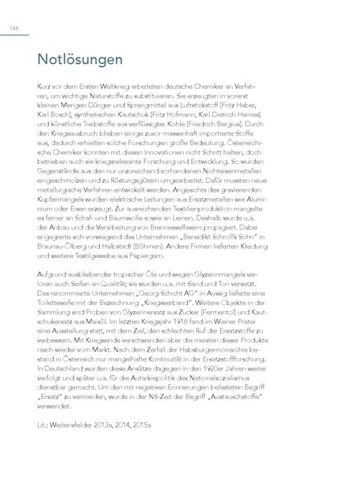 146 Notlösungen Kurz vor dem Ersten Weltkrieg arbeiteten deutsche Chemiker an Verfahren, um wichtige Naturstoffe zu substituieren. Sie erzeugten in vorerst kleinen Mengen Dünger und Sprengmittel aus Luftstickstoff(Fritz Haber, Karl Bosch), synthetischen Kautschuk(Fritz Hofmann, Karl Dietrich Harries) und künstliche Treibstoffe aus verflüssigter Kohle(Friedrich Bergius). Durch den Kriegsausbruch blieben einige zuvor massenhaft importierte Stoffe aus, dadurch erhielten solche Forschungen große Bedeutung. Österreichische Chemiker konnten mit diesen Innovationen nicht Schritt halten, doch betrieben auch sie kriegsrelevante Forschung und Entwicklung. So wurden Gegenstände aus den nur unzureichend vorhandenen Nichteisenmetallen eingeschmolzen und zu Rüstungsgütern umgearbeitet. Dafür mussten neue metallurgische Verfahren entwickelt werden. Angesichts des gravierenden Kupfermangels wurden elektrische Leitungen aus Ersatzmetallen wie Aluminium oder Eisen erzeugt. Zur ausreichenden Textilienproduktion mangelte es ferner an Schaf- und Baumwolle sowie an Leinen. Deshalb wurde u.a. der Anbau und die Verarbeitung von Brennesselfasern propagiert. Dabei engagierte sich vorwiegend das Unternehmen„Benedikt Schroll’s Sohn“ in Braunau-Ölberg und Halbstadt(Böhmen). Andere Firmen lieferten Kleidung und weitere Textilgewebe aus Papiergarn. Aufgrund ausbleibender tropischer Öle und wegen Glyzerinmangels verloren auch Seifen an Qualität; sie wurden u.a. mit Sand und Ton versetzt. Das renommierte Unternehmen„Georg Schicht AG“ in Aussig lieferte eine Toiletteseife mit der Bezeichnung„Kriegsverband“. Weitere Objekte in der Sammlung sind Proben von Glyzerinersatz aus Zucker(Fermentol) und Kautschukersatz aus Maisöl. Im letzten Kriegsjahr 1918 fand im Wiener Prater eine Ausstellung statt, mit dem Ziel, den schlechten Ruf der Ersatzstoffe zu verbessern. Mit Kriegsende verschwanden aber die meisten dieser Produkte rasch wieder vom Markt. Nach dem Zerfall der Habsburgermonarchie bestand in Österreich nur mangelhafte Kontinuität in der Ersatzstoffforschung. In Deutschland wurden diese Ansätze dagegen in den 1920er Jahren weiter verfolgt und später u.a. für die Autarkiepolitik des Nationalsozialismus dienstbar gemacht. Um den mit negativen Erinnerungen belasteten Begriff „Ersatz“ zu vermeiden, wurde in der NS-Zeit der Begriff„Austauschstoffe“ verwendet. Lit.: Weitensfelder 2013a, 2014, 2015a