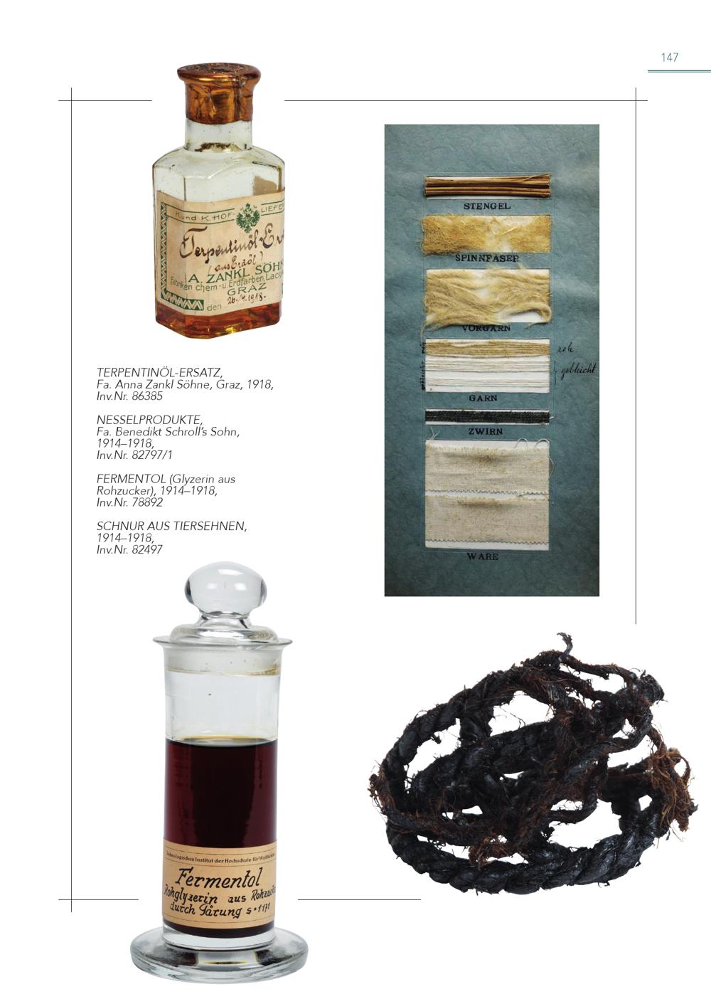 TERPENTINÖL-ERSATZ, Fa. Anna Zankl Söhne, Graz, 1918, Inv.Nr. 86385 NESSELPRODUKTE, Fa. Benedikt Schroll’s Sohn, 1914–1918, Inv.Nr. 82797/1 FERMENTOL(Glyzerin aus Rohzucker), 1914–1918, Inv.Nr. 78892 SCHNUR AUS TIERSEHNEN, 1914–1918, Inv.Nr. 82497 147