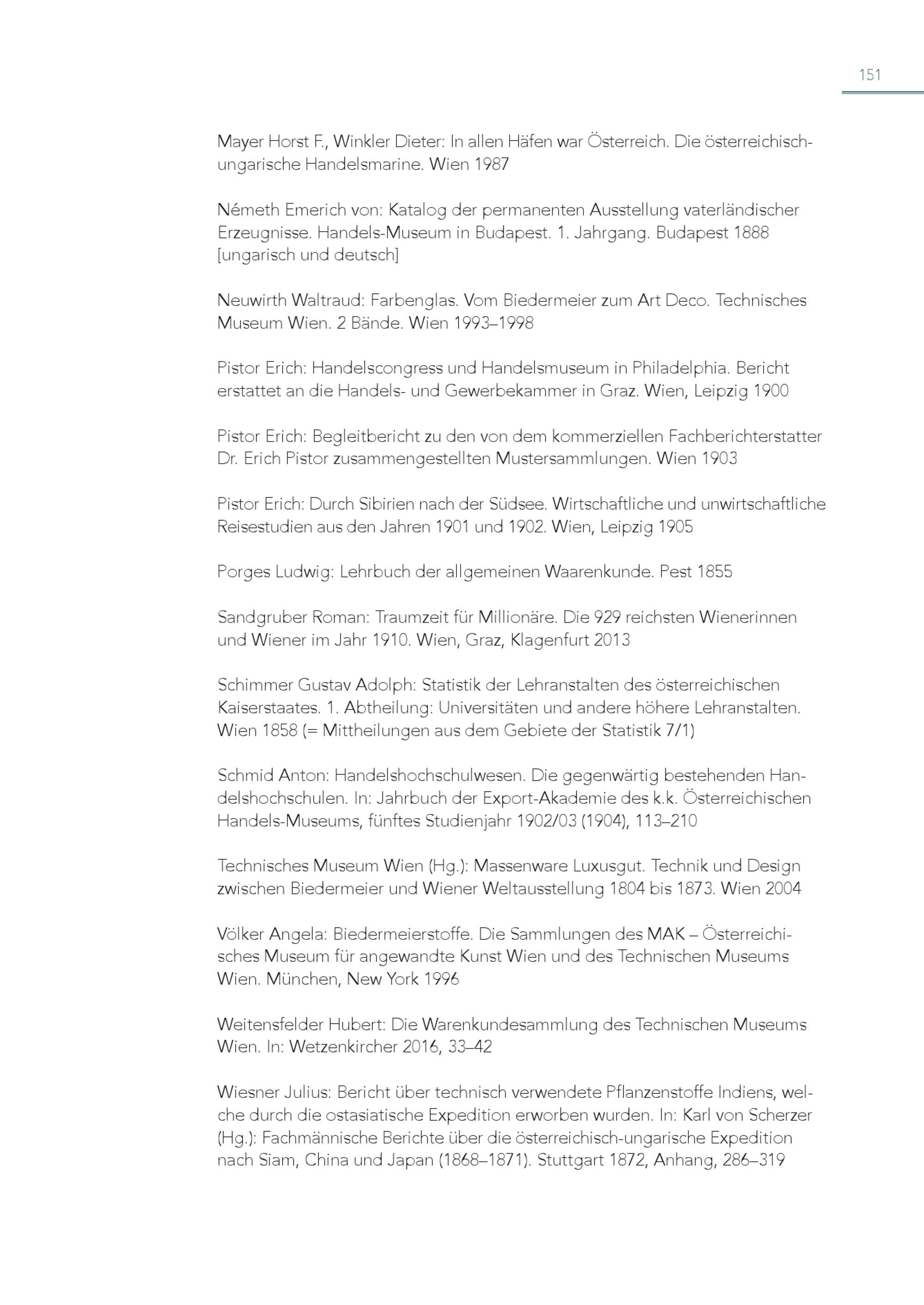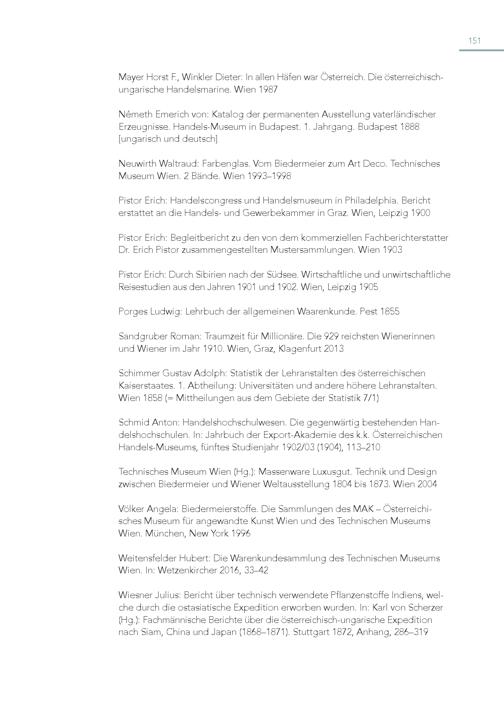 151 Mayer Horst F., Winkler Dieter: In allen Häfen war Österreich. Die österreichischungarische Handelsmarine. Wien 1987 Németh Emerich von: Katalog der permanenten Ausstellung vaterländischer Erzeugnisse. Handels-Museum in Budapest. 1. Jahrgang. Budapest 1888 [ungarisch und deutsch] Neuwirth Waltraud: Farbenglas. Vom Biedermeier zum Art Deco. Technisches Museum Wien. 2 Bände. Wien 1993–1998 Pistor Erich: Handelscongress und Handelsmuseum in Philadelphia. Bericht erstattet an die Handels- und Gewerbekammer in Graz. Wien, Leipzig 1900 Pistor Erich: Begleitbericht zu den von dem kommerziellen Fachberichterstatter Dr. Erich Pistor zusammengestellten Mustersammlungen. Wien 1903 Pistor Erich: Durch Sibirien nach der Südsee. Wirtschaftliche und unwirtschaftliche Reisestudien aus den Jahren 1901 und 1902. Wien, Leipzig 1905 Porges Ludwig: Lehrbuch der allgemeinen Waarenkunde. Pest 1855 Sandgruber Roman: Traumzeit für Millionäre. Die 929 reichsten Wienerinnen und Wiener im Jahr 1910. Wien, Graz, Klagenfurt 2013 Schimmer Gustav Adolph: Statistik der Lehranstalten des österreichischen Kaiserstaates. 1. Abtheilung: Universitäten und andere höhere Lehranstalten. Wien 1858(= Mittheilungen aus dem Gebiete der Statistik 7/1) Schmid Anton: Handelshochschulwesen. Die gegenwärtig bestehenden Handelshochschulen. In: Jahrbuch der Export-Akademie des k.k. Österreichischen Handels-Museums, fünftes Studienjahr 1902/03(1904), 113–210 Technisches Museum Wien(Hg.): Massenware Luxusgut. Technik und Design zwischen Biedermeier und Wiener Weltausstellung 1804 bis 1873. Wien 2004 Völker Angela: Biedermeierstoffe. Die Sammlungen des MAK – Österreichisches Museum für angewandte Kunst Wien und des Technischen Museums Wien. München, New York 1996 Weitensfelder Hubert: Die Warenkundesammlung des Technischen Museums Wien. In: Wetzenkircher 2016, 33–42 Wiesner Julius: Bericht über technisch verwendete Pflanzenstoffe Indiens, wel che durch die ostasiatische Expedition erworben wurden. In: Karl von Scherzer (Hg.): Fachmännische Berichte über die österreichisch-ungarische Expedition nach Siam, China und Japan(1868–1871). Stuttgart 1872, Anhang, 286–319