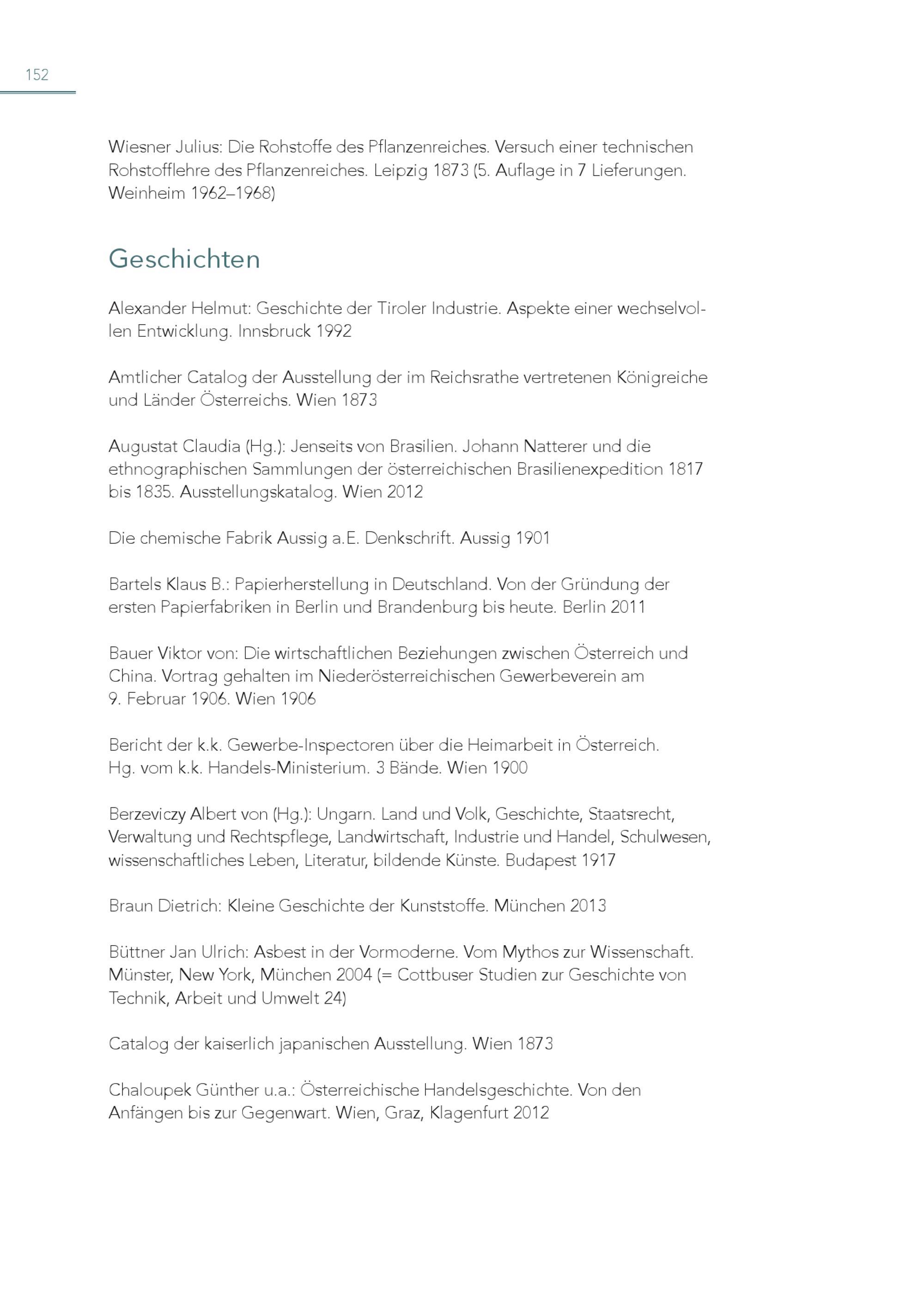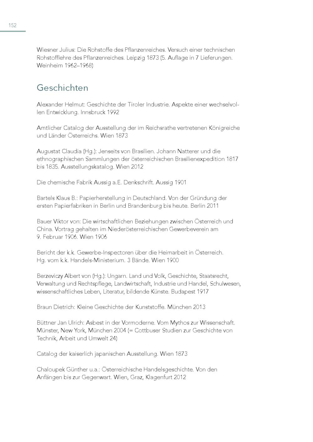 152 Wiesner Julius: Die Rohstoffe des Pflanzenreiches. Versuch einer technischen Rohstofflehre des Pflanzenreiches. Leipzig 1873(5. Auflage in 7 Lieferungen. Weinheim 1962–1968) Geschichten Alexander Helmut: Geschichte der Tiroler Industrie. Aspekte einer wechselvollen Entwicklung. Innsbruck 1992 Amtlicher Catalog der Ausstellung der im Reichsrathe vertretenen Königreiche und Länder Österreichs. Wien 1873 Augustat Claudia(Hg.): Jenseits von Brasilien. Johann Natterer und die ethnographischen Sammlungen der österreichischen Brasilienexpedition 1817 bis 1835. Ausstellungskatalog. Wien 2012 Die chemische Fabrik Aussig a.E. Denkschrift. Aussig 1901 Bartels Klaus B.: Papierherstellung in Deutschland. Von der Gründung der ersten Papierfabriken in Berlin und Brandenburg bis heute. Berlin 2011 Bauer Viktor von: Die wirtschaftlichen Beziehungen zwischen Österreich und China. Vortrag gehalten im Niederösterreichischen Gewerbeverein am 9. Februar 1906. Wien 1906 Bericht der k.k. Gewerbe-Inspectoren über die Heimarbeit in Österreich. Hg. vom k.k. Handels-Ministerium. 3 Bände. Wien 1900 Berzeviczy Albert von(Hg.): Ungarn. Land und Volk, Geschichte, Staatsrecht, Verwaltung und Rechtspflege, Landwirtschaft, Industrie und Handel, Schulwesen, wissenschaftliches Leben, Literatur, bildende Künste. Budapest 1917 Braun Dietrich: Kleine Geschichte der Kunststoffe. München 2013 Büttner Jan Ulrich: Asbest in der Vormoderne. Vom Mythos zur Wissenschaft. Münster, New York, München 2004(= Cottbuser Studien zur Geschichte von Technik, Arbeit und Umwelt 24) Catalog der kaiserlich japanischen Ausstellung. Wien 1873 Chaloupek Günther u.a.: Österreichische Handelsgeschichte. Von den Anfängen bis zur Gegenwart. Wien, Graz, Klagenfurt 2012