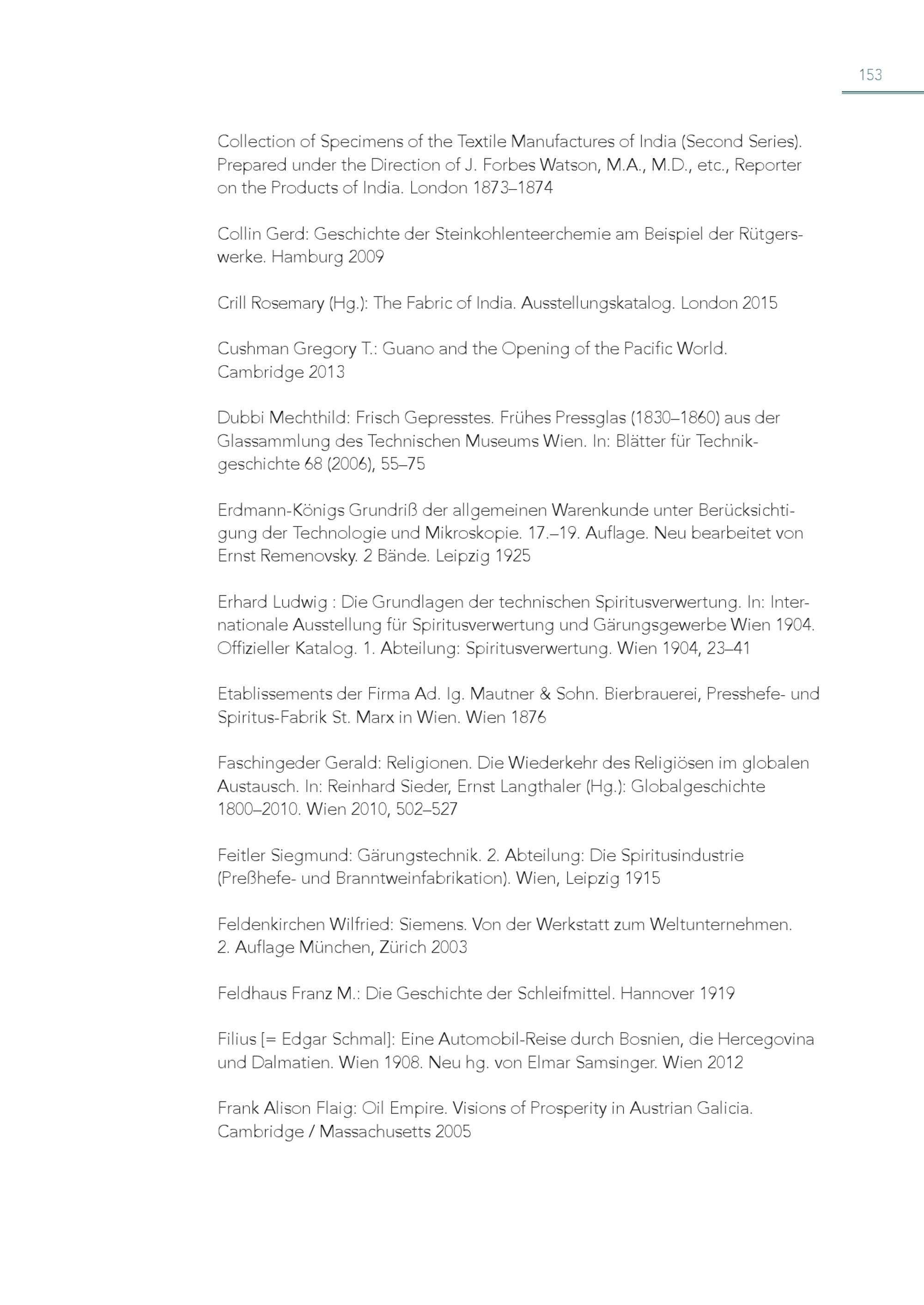 153 Collection of Specimens of the Textile Manufactures of India(Second Series). Prepared under the Direction of J. Forbes Watson, M.A., M.D., etc., Reporter on the Products of India. London 1873–1874 Collin Gerd: Geschichte der Steinkohlenteerchemie am Beispiel der Rütgerswerke. Hamburg 2009 Crill Rosemary(Hg.): The Fabric of India. Ausstellungskatalog. London 2015 Cushman Gregory T.: Guano and the Opening of the Pacific World. Cambridge 2013 Dubbi Mechthild: Frisch Gepresstes. Frühes Pressglas(1830–1860) aus der Glassammlung des Technischen Museums Wien. In: Blätter für Technikgeschichte 68(2006), 55–75 Erdmann-Königs Grundriß der allgemeinen Warenkunde unter Berücksichtigung der Technologie und Mikroskopie. 17.–19. Auflage. Neu bearbeitet von Ernst Remenovsky. 2 Bände. Leipzig 1925 Erhard Ludwig: Die Grundlagen der technischen Spiritusverwertung. In: Internationale Ausstellung für Spiritusverwertung und Gärungsgewerbe Wien 1904. Offizieller Katalog. 1. Abteilung: Spiritusverwertung. Wien 1904, 23–41 Etablissements der Firma Ad. Ig. Mautner& Sohn. Bierbrauerei, Presshefe- und Spiritus-Fabrik St. Marx in Wien. Wien 1876 Faschingeder Gerald: Religionen. Die Wiederkehr des Religiösen im globalen Austausch. In: Reinhard Sieder, Ernst Langthaler(Hg.): Globalgeschichte 1800–2010. Wien 2010, 502–527 Feitler Siegmund: Gärungstechnik. 2. Abteilung: Die Spiritusindustrie (Preßhefe- und Branntweinfabrikation). Wien, Leipzig 1915 Feldenkirchen Wilfried: Siemens. Von der Werkstatt zum Weltunternehmen. 2. Auflage München, Zürich 2003 Feldhaus Franz M.: Die Geschichte der Schleifmittel. Hannover 1919 Filius[= Edgar Schmal]: Eine Automobil-Reise durch Bosnien, die Hercegovina und Dalmatien. Wien 1908. Neu hg. von Elmar Samsinger. Wien 2012 Frank Alison Flaig: Oil Empire. Visions of Prosperity in Austrian Galicia. Cambridge/ Massachusetts 2005