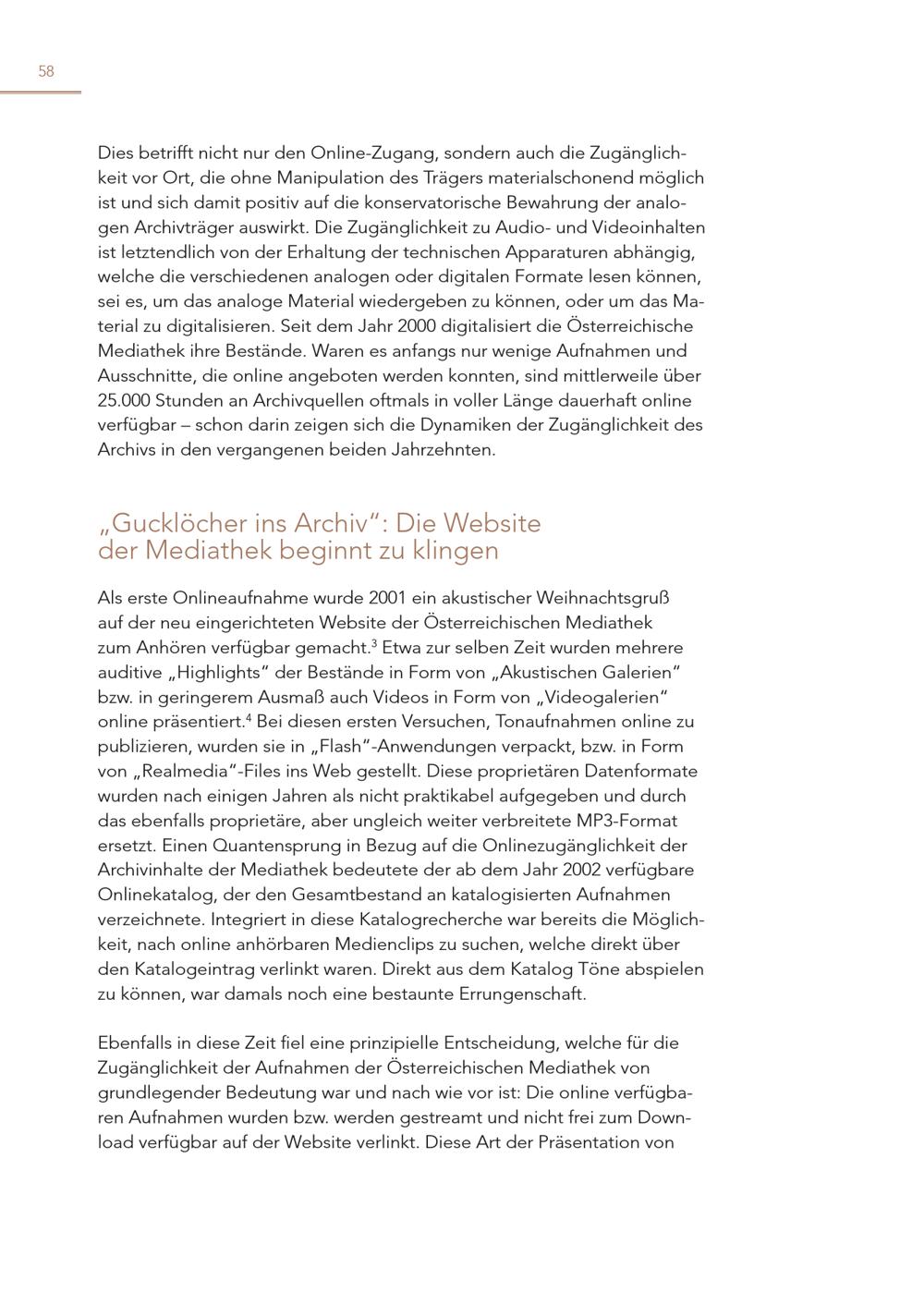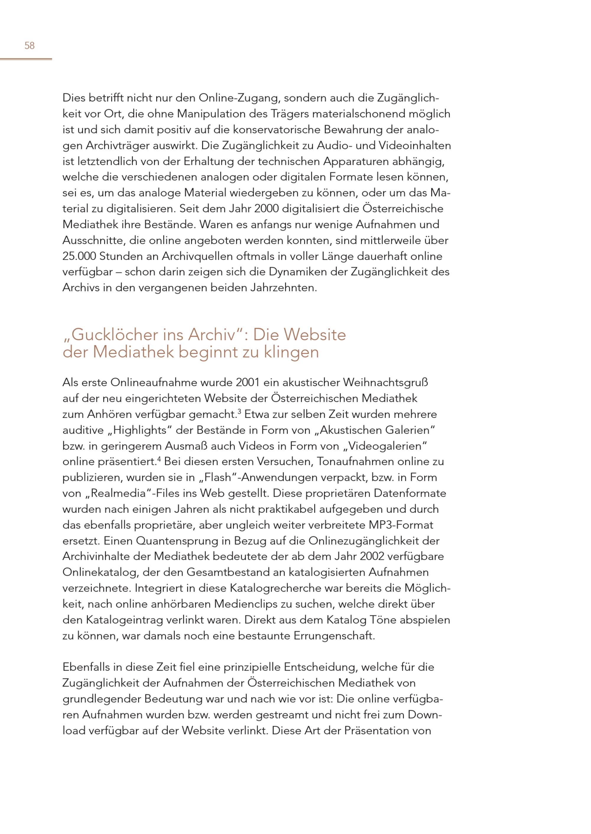 58 Dies betrifft nicht nur den Online-Zugang, sondern auch die Zugänglichkeit vor Ort, die ohne Manipulation des Trägers materialschonend möglich ist und sich damit positiv auf die konservatorische Bewahrung der analogen Archivträger auswirkt. Die Zugänglichkeit zu Audio- und Videoinhalten ist letztendlich von der Erhaltung der technischen Apparaturen abhängig, welche die verschiedenen analogen oder digitalen Formate lesen können, sei es, um das analoge Material wiedergeben zu können, oder um das Material zu digitalisieren. Seit dem Jahr 2000 digitalisiert die Österreichische Mediathek ihre Bestände. Waren es anfangs nur wenige Aufnahmen und Ausschnitte, die online angeboten werden konnten, sind mittlerweile über 25.000 Stunden an Archivquellen oftmals in voller Länge dauerhaft online verfügbar – schon darin zeigen sich die Dynamiken der Zugänglichkeit des Archivs in den vergangenen beiden Jahrzehnten. „Gucklöcher ins Archiv“: Die Website der Mediathek beginnt zu klingen Als erste Onlineaufnahme wurde 2001 ein akustischer Weihnachtsgruß auf der neu eingerichteten Website der Österreichischen Mediathek zum Anhören verfügbar gemacht. 3 Etwa zur selben Zeit wurden mehrere auditive„Highlights“ der Bestände in Form von„Akustischen Galerien“ bzw. in geringerem Ausmaß auch Videos in Form von„Videogalerien“ online präsentiert. 4 Bei diesen ersten Versuchen, Tonaufnahmen online zu publizieren, wurden sie in„Flash“-Anwendungen verpackt, bzw. in Form von„Realmedia“-Files ins Web gestellt. Diese proprietären Datenformate wurden nach einigen Jahren als nicht praktikabel aufgegeben und durch das ebenfalls proprietäre, aber ungleich weiter verbreitete MP3-Format ersetzt. Einen Quantensprung in Bezug auf die Onlinezugänglichkeit der Archivinhalte der Mediathek bedeutete der ab dem Jahr 2002 verfügbare Onlinekatalog, der den Gesamtbestand an katalogisierten Aufnahmen verzeichnete. Integriert in diese Katalogrecherche war bereits die Möglichkeit, nach online anhörbaren Medienclips zu suchen, welche direkt über den Katalogeintrag verlinkt waren. Direkt aus dem Katalog Töne abspielen zu können, war damals noch eine bestaunte Errungenschaft. Ebenfalls in diese Zeit fiel eine prinzipielle Entscheidung, welche für die Zugänglichkeit der Aufnahmen der Österreichischen Mediathek von grundlegender Bedeutung war und nach wie vor ist: Die online verfügbaren Aufnahmen wurden bzw. werden gestreamt und nicht frei zum Download verfügbar auf der Website verlinkt. Diese Art der Präsentation von