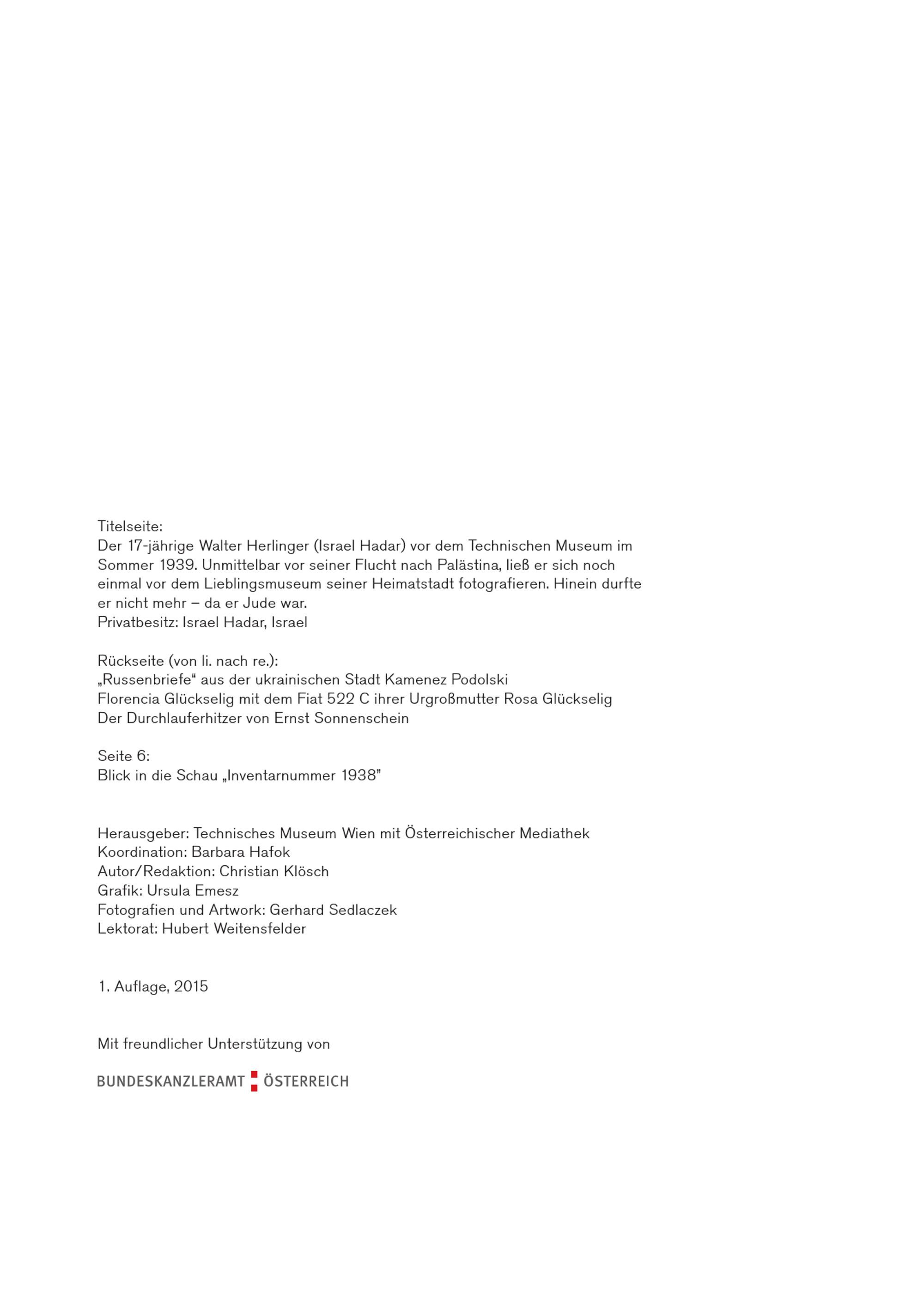 Titelseite: Der 17-jährige Walter Herlinger(Israel Hadar) vor dem Technischen Museum im Sommer 1939. Unmittelbar vor seiner Flucht nach Palästina, ließ er sich noch einmal vor dem Lieblingsmuseum seiner Heimatstadt fotografieren. Hinein durfte er nicht mehr – da er Jude war. Privatbesitz: Israel Hadar, Israel Rückseite(von li. nach re.): „Russenbriefe“ aus der ukrainischen Stadt Kamenez Podolski Florencia Glückselig mit dem Fiat 522 C ihrer Urgroßmutter Rosa Glückselig Der Durchlauferhitzer von Ernst Sonnenschein Seite 6: Blick in die Schau„Inventarnummer 1938” Herausgeber: Technisches Museum Wien mit Österreichischer Mediathek Koordination: Barbara Hafok Autor/Redaktion: Christian Klösch Grafik: Ursula Emesz Fotografien und Artwork: Gerhard Sedlaczek Lektorat: Hubert Weitensfelder 1. Auflage, 2015 Mit freundlicher Unterstützung von
