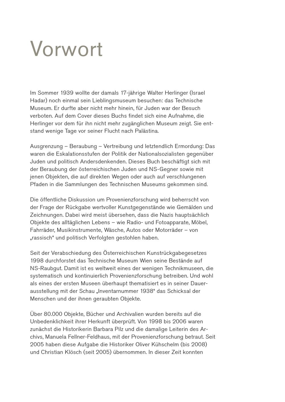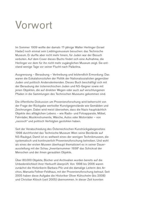 Vorwort Im Sommer 1939 wollte der damals 17-jährige Walter Herlinger(Israel Hadar) noch einmal sein Lieblingsmuseum besuchen: das Technische Museum. Er durfte aber nicht mehr hinein, für Juden war der Besuch verboten. Auf dem Cover dieses Buchs findet sich eine Aufnahme, die Herlinger vor dem für ihn nicht mehr zugänglichen Museum zeigt. Sie entstand wenige Tage vor seiner Flucht nach Palästina. Ausgrenzung – Beraubung – Vertreibung und letztendlich Ermordung: Das waren die Eskalationsstufen der Politik der Nationalsozialisten gegenüber Juden und politisch Andersdenkenden. Dieses Buch beschäftigt sich mit der Beraubung der österreichischen Juden und NS-Gegner sowie mit jenen Objekten, die auf direkten Wegen oder auch auf verschlungenen Pfaden in die Sammlungen des Technischen Museums gekommen sind. Die öffentliche Diskussion um Provenienzforschung wird beherrscht von der Frage der Rückgabe wertvoller Kunstgegenstände wie Gemälden und Zeichnungen. Dabei wird meist übersehen, dass die Nazis hauptsächlich Objekte des alltäglichen Lebens – wie Radio- und Fotoapparate, Möbel, Fahrräder, Musikinstrumente, Wäsche, Autos oder Motorräder – von „rassisch“ und politisch Verfolgten gestohlen haben. Seit der Verabschiedung des Österreichischen Kunstrückgabegesetzes 1998 durchforstet das Technische Museum Wien seine Bestände auf NS-Raubgut. Damit ist es weltweit eines der wenigen Technikmuseen, die systematisch und kontinuierlich Provenienzforschung betreiben. Und wohl als eines der ersten Museen überhaupt thematisiert es in seiner Dauerausstellung mit der Schau„Inventarnummer 1938“ das Schicksal der Menschen und der ihnen geraubten Objekte. Über 80.000 Objekte, Bücher und Archivalien wurden bereits auf die Unbedenklichkeit ihrer Herkunft überprüft. Von 1998 bis 2006 waren zunächst die Historikerin Barbara Pilz und die damalige Leiterin des Archivs, Manuela Fellner-Feldhaus, mit der Provenienzforschung betraut. Seit 2005 haben diese Aufgabe die Historiker Oliver Kühschelm(bis 2008) und Christian Klösch(seit 2005) übernommen. In dieser Zeit konnten