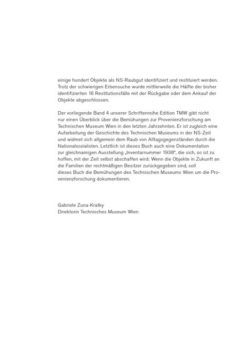 einige hundert Objekte als NS-Raubgut identifiziert und restituiert werden. Trotz der schwierigen Erbensuche wurde mittlerweile die Hälfte der bisher identifizierten 16 Restitutionsfälle mit der Rückgabe oder dem Ankauf der Objekte abgeschlossen. Der vorliegende Band 4 unserer Schriftenreihe Edition TMW gibt nicht nur einen Überblick über die Bemühungen zur Provenienzforschung am Technischen Museum Wien in den letzten Jahrzehnten. Er ist zugleich eine Aufarbeitung der Geschichte des Technischen Museums in der NS-Zeit und widmet sich allgemein dem Raub von Alltagsgegenständen durch die Nationalsozialisten. Letztlich ist dieses Buch auch eine Dokumentation zur gleichnamigen Ausstellung„Inventarnummer 1938“, die sich, so ist zu hoffen, mit der Zeit selbst abschaffen wird: Wenn die Objekte in Zukunft an die Familien der rechtmäßigen Besitzer zurückgegeben sind, soll dieses Buch die Bemühungen des Technischen Museums Wien um die Provenienzforschung dokumentieren. Gabriele Zuna-Kratky Direktorin Technisches Museum Wien