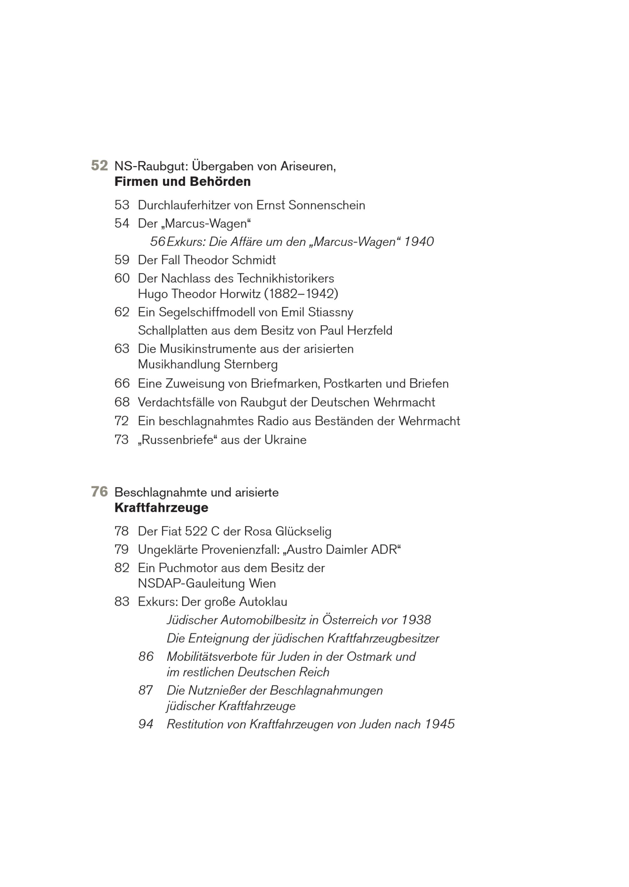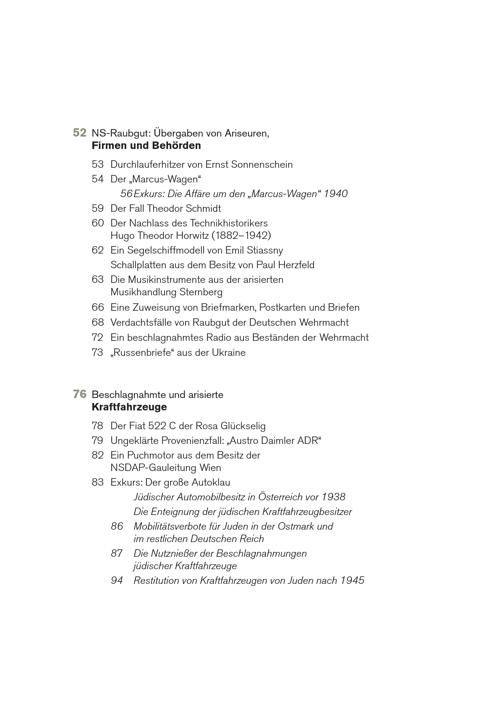 52 NS-Raubgut: Übergaben von Ariseuren, Firmen und Behörden 53 Durchlauferhitzer von Ernst Sonnenschein 54 Der„Marcus-Wagen“ 56 Exkurs: Die Affäre um den„Marcus-Wagen“ 1940 59 Der Fall Theodor Schmidt 60 Der Nachlass des Technikhistorikers Hugo Theodor Horwitz(1882–1942) 62 Ein Segelschiffmodell von Emil Stiassny Schallplatten aus dem Besitz von Paul Herzfeld 63 Die Musikinstrumente aus der arisierten Musikhandlung Sternberg 66 Eine Zuweisung von Briefmarken, Postkarten und Briefen 68 Verdachtsfälle von Raubgut der Deutschen Wehrmacht 72 Ein beschlagnahmtes Radio aus Beständen der Wehrmacht 73 „Russenbriefe“ aus der Ukraine 76 Beschlagnahmte und arisierte Kraftfahrzeuge 78 Der Fiat 522 C der Rosa Glückselig 79 Ungeklärte Provenienzfall:„Austro Daimler ADR“ 82 Ein Puchmotor aus dem Besitz der NSDAP-Gauleitung Wien 83 Exkurs: Der große Autoklau Jüdischer Automobilbesitz in Österreich vor 1938 Die Enteignung der jüdischen Kraftfahrzeugbesitzer 86 Mobilitätsverbote für Juden in der Ostmark und im restlichen Deutschen Reich 87 Die Nutznießer der Beschlagnahmungen jüdischer Kraftfahrzeuge 94 Restitution von Kraftfahrzeugen von Juden nach 1945