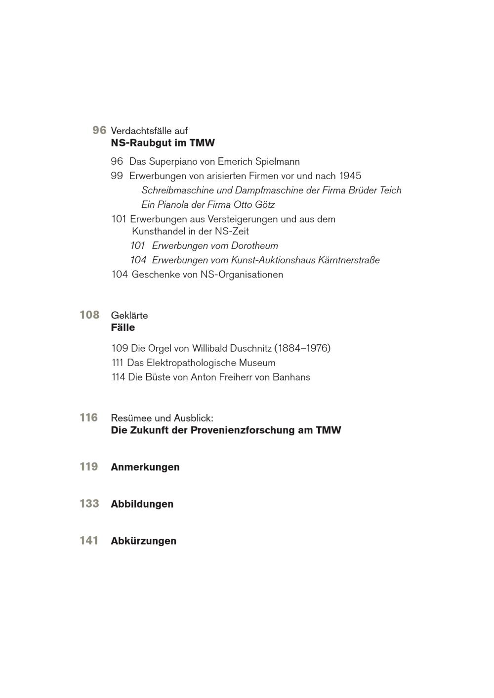 96 Verdachtsfälle auf NS-Raubgut im TMW 96 Das Superpiano von Emerich Spielmann 99 Erwerbungen von arisierten Firmen vor und nach 1945 Schreibmaschine und Dampfmaschine der Firma Brüder Teich Ein Pianola der Firma Otto Götz 101 Erwerbungen aus Versteigerungen und aus dem Kunsthandel in der NS-Zeit 101 Erwerbungen vom Dorotheum 104 Erwerbungen vom Kunst-Auktionshaus Kärntnerstraße 104 Geschenke von NS-Organisationen 108 Geklärte Fälle 109 Die Orgel von Willibald Duschnitz(1884–1976) 111 Das Elektropathologische Museum 114 Die Büste von Anton Freiherr von Banhans 116 Resümee und Ausblick: Die Zukunft der Provenienzforschung am TMW 119 Anmerkungen 133 Abbildungen 141 Abkürzungen