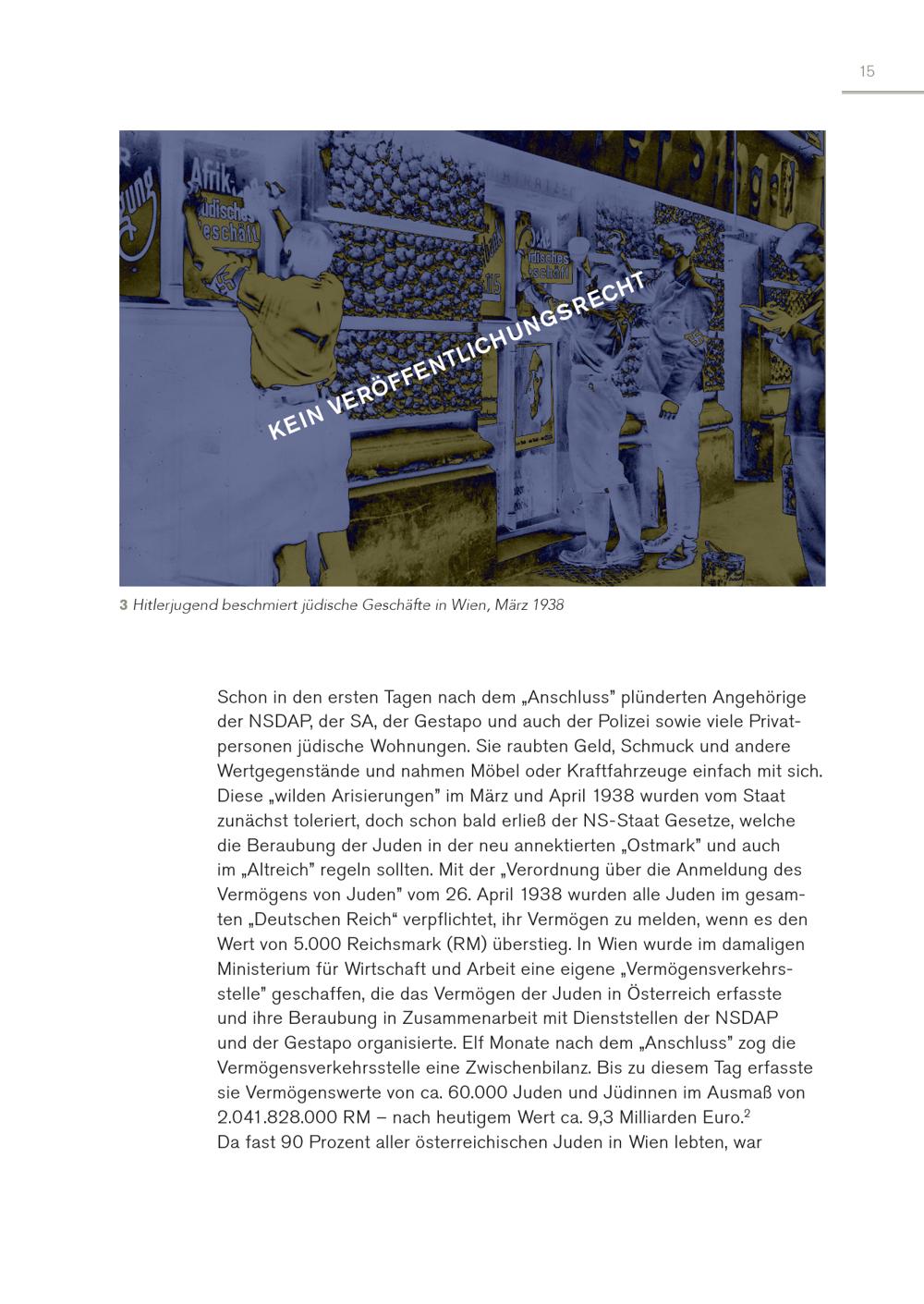 15 KEIN VERÖFFENTLICHUNGSRECHT 3 Hitlerjugend beschmiert jüdische Geschäfte in Wien, März 1938 Schon in den ersten Tagen nach dem„Anschluss” plünderten Angehörige der NSDAP, der SA, der Gestapo und auch der Polizei sowie viele Privatpersonen jüdische Wohnungen. Sie raubten Geld, Schmuck und andere Wertgegenstände und nahmen Möbel oder Kraftfahrzeuge einfach mit sich. Diese„wilden Arisierungen” im März und April 1938 wurden vom Staat zunächst toleriert, doch schon bald erließ der NS-Staat Gesetze, welche die Beraubung der Juden in der neu annektierten„Ostmark” und auch im„Altreich” regeln sollten. Mit der„Verordnung über die Anmeldung des Vermögens von Juden” vom 26. April 1938 wurden alle Juden im gesamten„Deutschen Reich“ verpflichtet, ihr Vermögen zu melden, wenn es den Wert von 5.000 Reichsmark(RM) überstieg. In Wien wurde im damaligen Ministerium für Wirtschaft und Arbeit eine eigene„Vermögensverkehrsstelle” geschaffen, die das Vermögen der Juden in Österreich erfasste und ihre Beraubung in Zusammenarbeit mit Dienststellen der NSDAP und der Gestapo organisierte. Elf Monate nach dem„Anschluss” zog die Vermögensverkehrsstelle eine Zwischenbilanz. Bis zu diesem Tag erfasste sie Vermögenswerte von ca. 60.000 Juden und Jüdinnen im Ausmaß von 2.041.828.000 RM – nach heutigem Wert ca. 9,3 Milliarden Euro. 2 Da fast 90 Prozent aller österreichischen Juden in Wien lebten, war