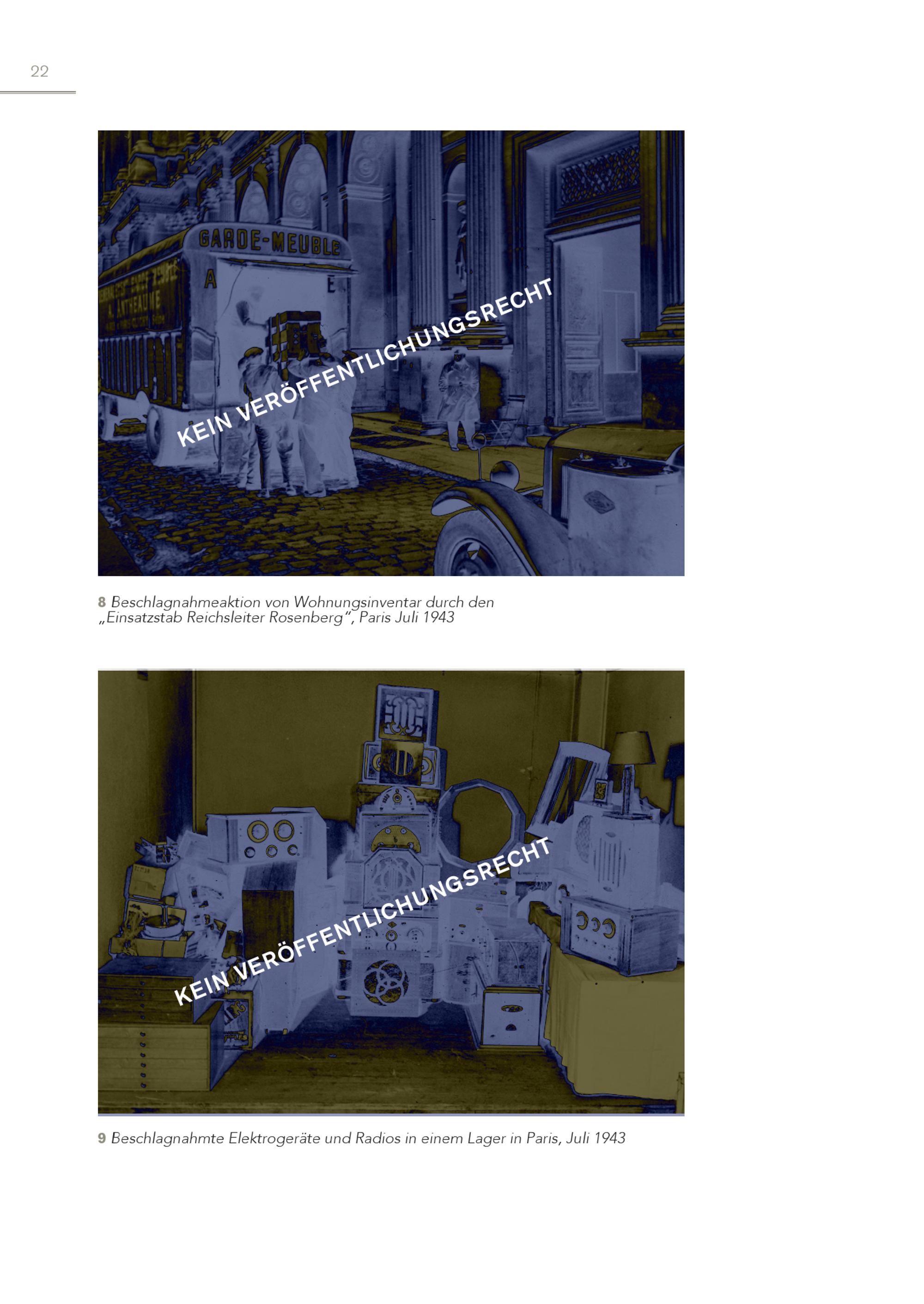 22 KEIN VERÖFFENTLICHUNGSRECHT 8 Beschlagnahmeaktion von Wohnungsinventar durch den „Einsatzstab Reichsleiter Rosenberg“, Paris Juli 1943 KEIN VERÖFFENTLICHUNGSRECHT 9 Beschlagnahmte Elektrogeräte und Radios in einem Lager in Paris, Juli 1943