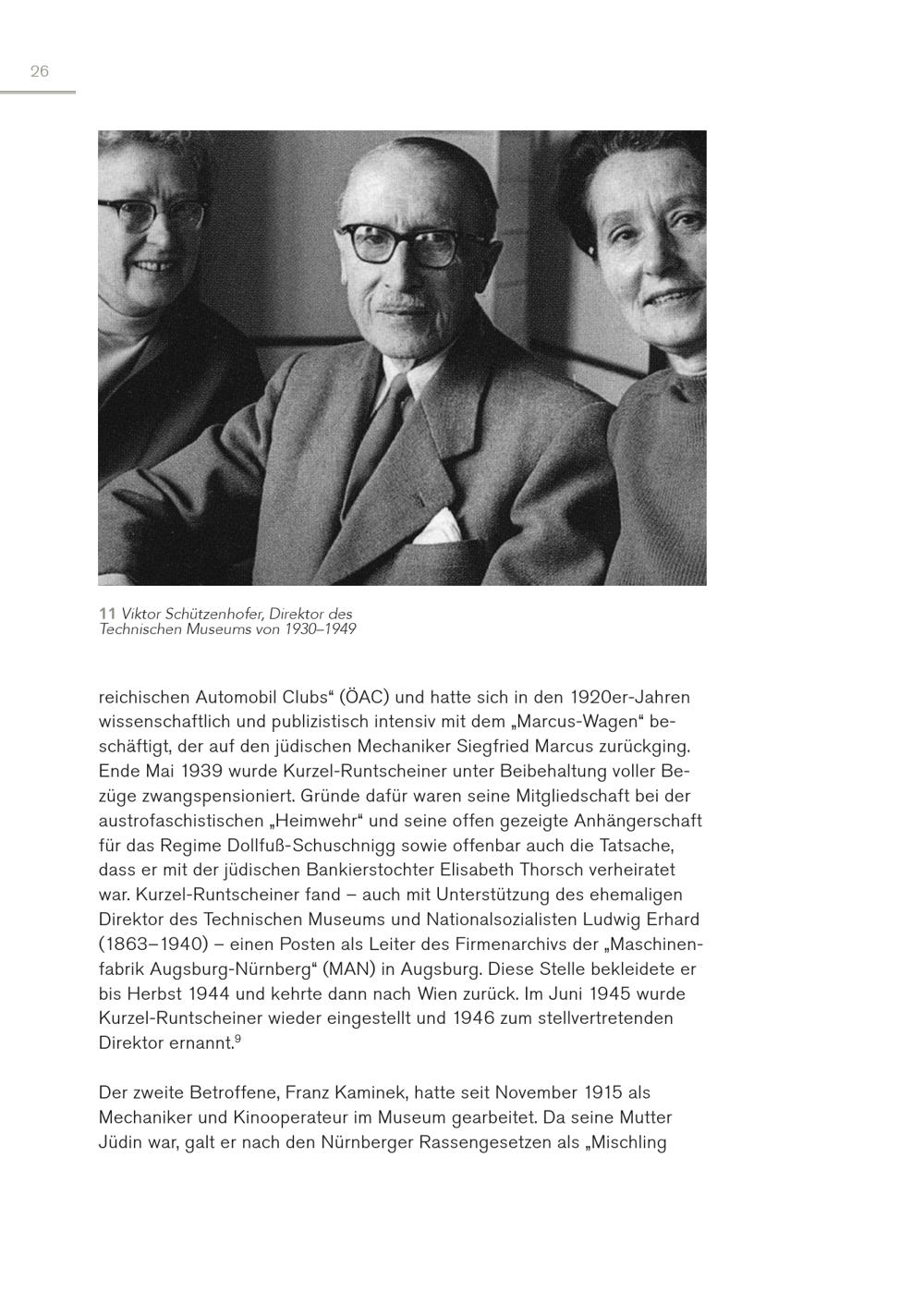 26 1 Te 1 cVhnikitsocrhSecnhMütuzseenuhmofsevr,oDnir1e9k3t0o–r1d9e4s9 reichischen Automobil Clubs“(ÖAC) und hatte sich in den 1920er-Jahren wissenschaftlich und publizistisch intensiv mit dem„Marcus-Wagen“ beschäftigt, der auf den jüdischen Mechaniker Siegfried Marcus zurückging. Ende Mai 1939 wurde Kurzel-Runtscheiner unter Beibehaltung voller Bezüge zwangspensioniert. Gründe dafür waren seine Mitgliedschaft bei der austrofaschistischen„Heimwehr“ und seine offen gezeigte Anhängerschaft für das Regime Dollfuß-Schuschnigg sowie offenbar auch die Tatsache, dass er mit der jüdischen Bankierstochter Elisabeth Thorsch verheiratet war. Kurzel-Runtscheiner fand – auch mit Unterstützung des ehemaligen Direktor des Technischen Museums und Nationalsozialisten Ludwig Erhard (1863–1940) – einen Posten als Leiter des Firmenarchivs der„Maschinenfabrik Augsburg-Nürnberg“(MAN) in Augsburg. Diese Stelle bekleidete er bis Herbst 1944 und kehrte dann nach Wien zurück. Im Juni 1945 wurde Kurzel-Runtscheiner wieder eingestellt und 1946 zum stellvertretenden Direktor ernannt. 9 Der zweite Betroffene, Franz Kaminek, hatte seit November 1915 als Mechaniker und Kinooperateur im Museum gearbeitet. Da seine Mutter Jüdin war, galt er nach den Nürnberger Rassengesetzen als„Mischling