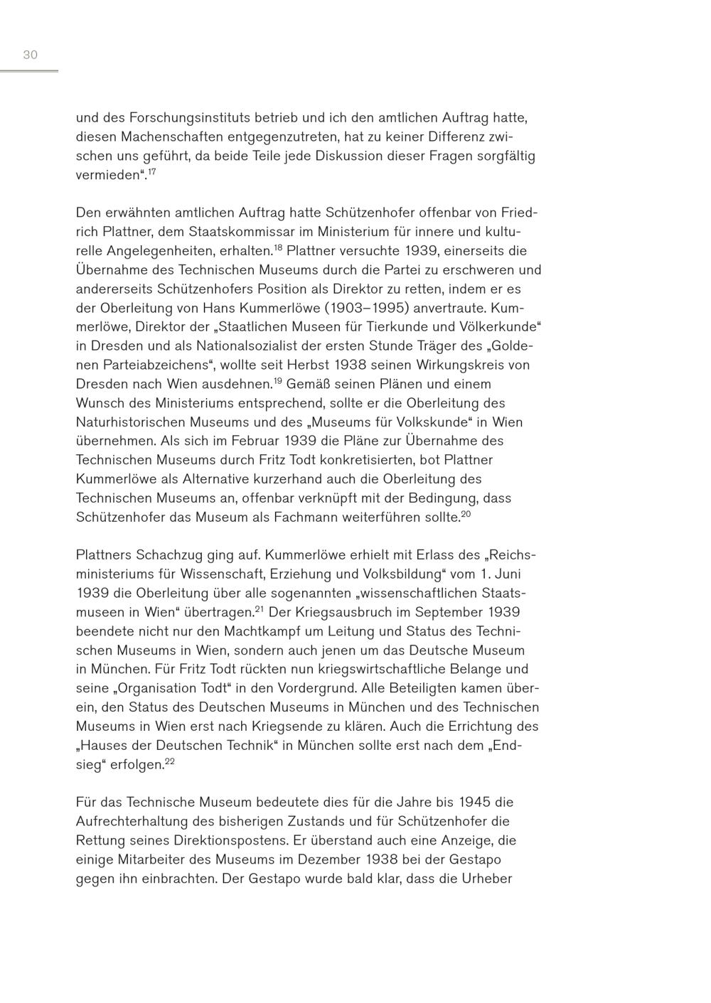 30 und des Forschungsinstituts betrieb und ich den amtlichen Auftrag hatte, diesen Machenschaften entgegenzutreten, hat zu keiner Differenz zwischen uns geführt, da beide Teile jede Diskussion dieser Fragen sorgfältig vermieden“. 17 Den erwähnten amtlichen Auftrag hatte Schützenhofer offenbar von Friedrich Plattner, dem Staatskommissar im Ministerium für innere und kulturelle Angelegenheiten, erhalten. 18 Plattner versuchte 1939, einerseits die Übernahme des Technischen Museums durch die Partei zu erschweren und andererseits Schützenhofers Position als Direktor zu retten, indem er es der Oberleitung von Hans Kummerlöwe(1903–1995) anvertraute. Kummerlöwe, Direktor der„Staatlichen Museen für Tierkunde und Völkerkunde“ in Dresden und als Nationalsozialist der ersten Stunde Träger des„Goldenen Parteiabzeichens“, wollte seit Herbst 1938 seinen Wirkungskreis von Dresden nach Wien ausdehnen. 19 Gemäß seinen Plänen und einem Wunsch des Ministeriums entsprechend, sollte er die Oberleitung des Naturhistorischen Museums und des„Museums für Volkskunde“ in Wien übernehmen. Als sich im Februar 1939 die Pläne zur Übernahme des Technischen Museums durch Fritz Todt konkretisierten, bot Plattner Kummerlöwe als Alternative kurzerhand auch die Oberleitung des Technischen Museums an, offenbar verknüpft mit der Bedingung, dass Schützenhofer das Museum als Fachmann weiterführen sollte. 20 Plattners Schachzug ging auf. Kummerlöwe erhielt mit Erlass des„Reichsministeriums für Wissenschaft, Erziehung und Volksbildung“ vom 1. Juni 1939 die Oberleitung über alle sogenannten„wissenschaftlichen Staatsmuseen in Wien“ übertragen. 21 Der Kriegsausbruch im September 1939 beendete nicht nur den Machtkampf um Leitung und Status des Technischen Museums in Wien, sondern auch jenen um das Deutsche Museum in München. Für Fritz Todt rückten nun kriegswirtschaftliche Belange und seine„Organisation Todt“ in den Vordergrund. Alle Beteiligten kamen überein, den Status des Deutschen Museums in München und des Technischen Museums in Wien erst nach Kriegsende zu klären. Auch die Errichtung des „Hauses der Deutschen Technik“ in München sollte erst nach dem„Endsieg“ erfolgen. 22 Für das Technische Museum bedeutete dies für die Jahre bis 1945 die Aufrechterhaltung des bisherigen Zustands und für Schützenhofer die Rettung seines Direktionspostens. Er überstand auch eine Anzeige, die einige Mitarbeiter des Museums im Dezember 1938 bei der Gestapo gegen ihn einbrachten. Der Gestapo wurde bald klar, dass die Urheber