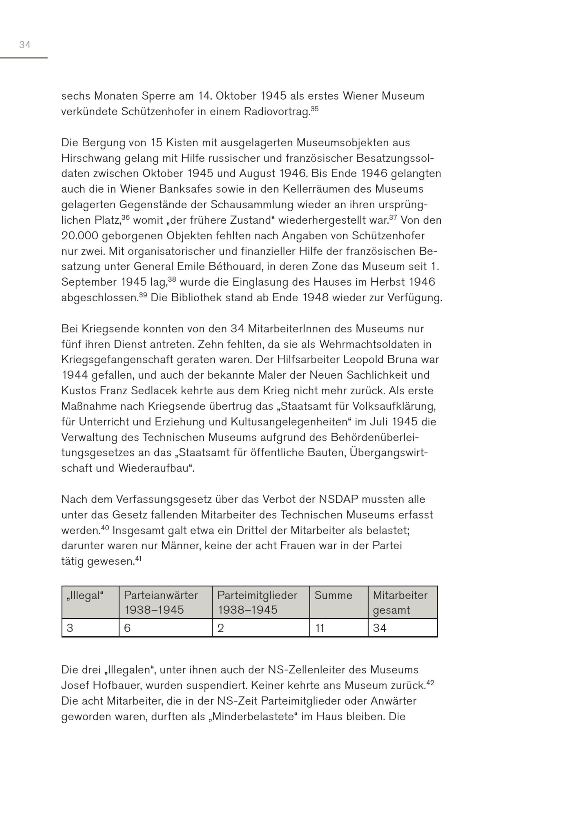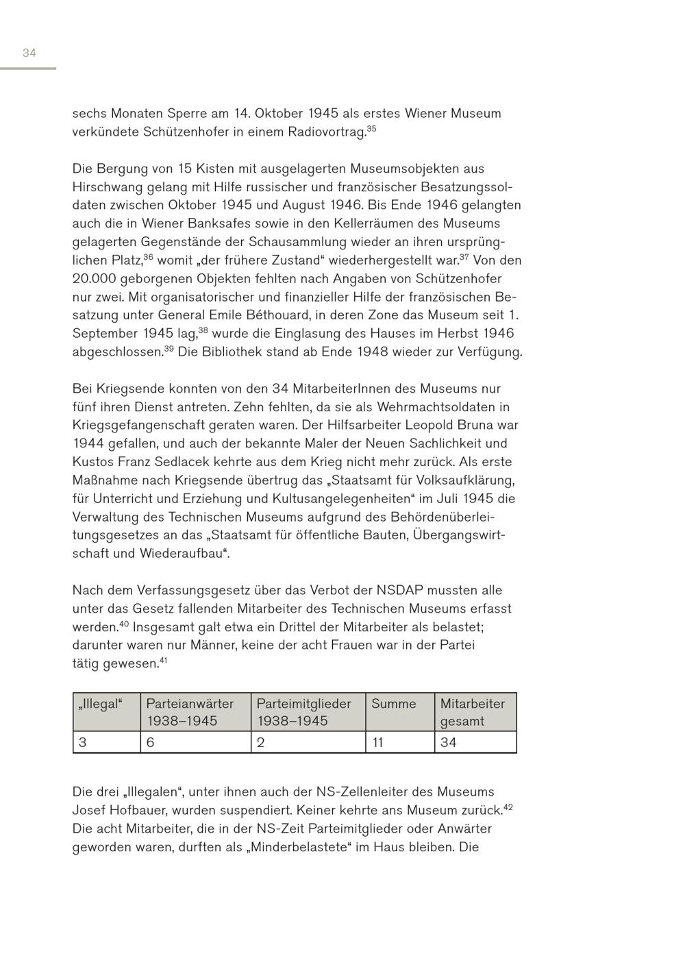 34 sechs Monaten Sperre am 14. Oktober 1945 als erstes Wiener Museum verkündete Schützenhofer in einem Radiovortrag. 35 Die Bergung von 15 Kisten mit ausgelagerten Museumsobjekten aus Hirschwang gelang mit Hilfe russischer und französischer Besatzungssoldaten zwischen Oktober 1945 und August 1946. Bis Ende 1946 gelangten auch die in Wiener Banksafes sowie in den Kellerräumen des Museums gelagerten Gegenstände der Schausammlung wieder an ihren ursprünglichen Platz, 36 womit„der frühere Zustand“ wiederhergestellt war. 37 Von den 20.000 geborgenen Objekten fehlten nach Angaben von Schützenhofer nur zwei. Mit organisatorischer und finanzieller Hilfe der französischen Besatzung unter General Emile Béthouard, in deren Zone das Museum seit 1. September 1945 lag, 38 wurde die Einglasung des Hauses im Herbst 1946 abgeschlossen. 39 Die Bibliothek stand ab Ende 1948 wieder zur Verfügung. Bei Kriegsende konnten von den 34 MitarbeiterInnen des Museums nur fünf ihren Dienst antreten. Zehn fehlten, da sie als Wehrmachtsoldaten in Kriegsgefangenschaft geraten waren. Der Hilfsarbeiter Leopold Bruna war 1944 gefallen, und auch der bekannte Maler der Neuen Sachlichkeit und Kustos Franz Sedlacek kehrte aus dem Krieg nicht mehr zurück. Als erste Maßnahme nach Kriegsende übertrug das„Staatsamt für Volksaufklärung, für Unterricht und Erziehung und Kultusangelegenheiten“ im Juli 1945 die Verwaltung des Technischen Museums aufgrund des Behördenüberleitungsgesetzes an das„Staatsamt für öffentliche Bauten, Übergangswirtschaft und Wiederaufbau“. Nach dem Verfassungsgesetz über das Verbot der NSDAP mussten alle unter das Gesetz fallenden Mitarbeiter des Technischen Museums erfasst werden. 40 Insgesamt galt etwa ein Drittel der Mitarbeiter als belastet; darunter waren nur Männer, keine der acht Frauen war in der Partei tätig gewesen. 41 „Illegal“ 3 Parteianwärter 1938–1945 6 Parteimitglieder 1938–1945 2 Summe 11 Mitarbeiter gesamt 34 Die drei„Illegalen“, unter ihnen auch der NS-Zellenleiter des Museums Josef Hofbauer, wurden suspendiert. Keiner kehrte ans Museum zurück. 42 Die acht Mitarbeiter, die in der NS-Zeit Parteimitglieder oder Anwärter geworden waren, durften als„Minderbelastete“ im Haus bleiben. Die
