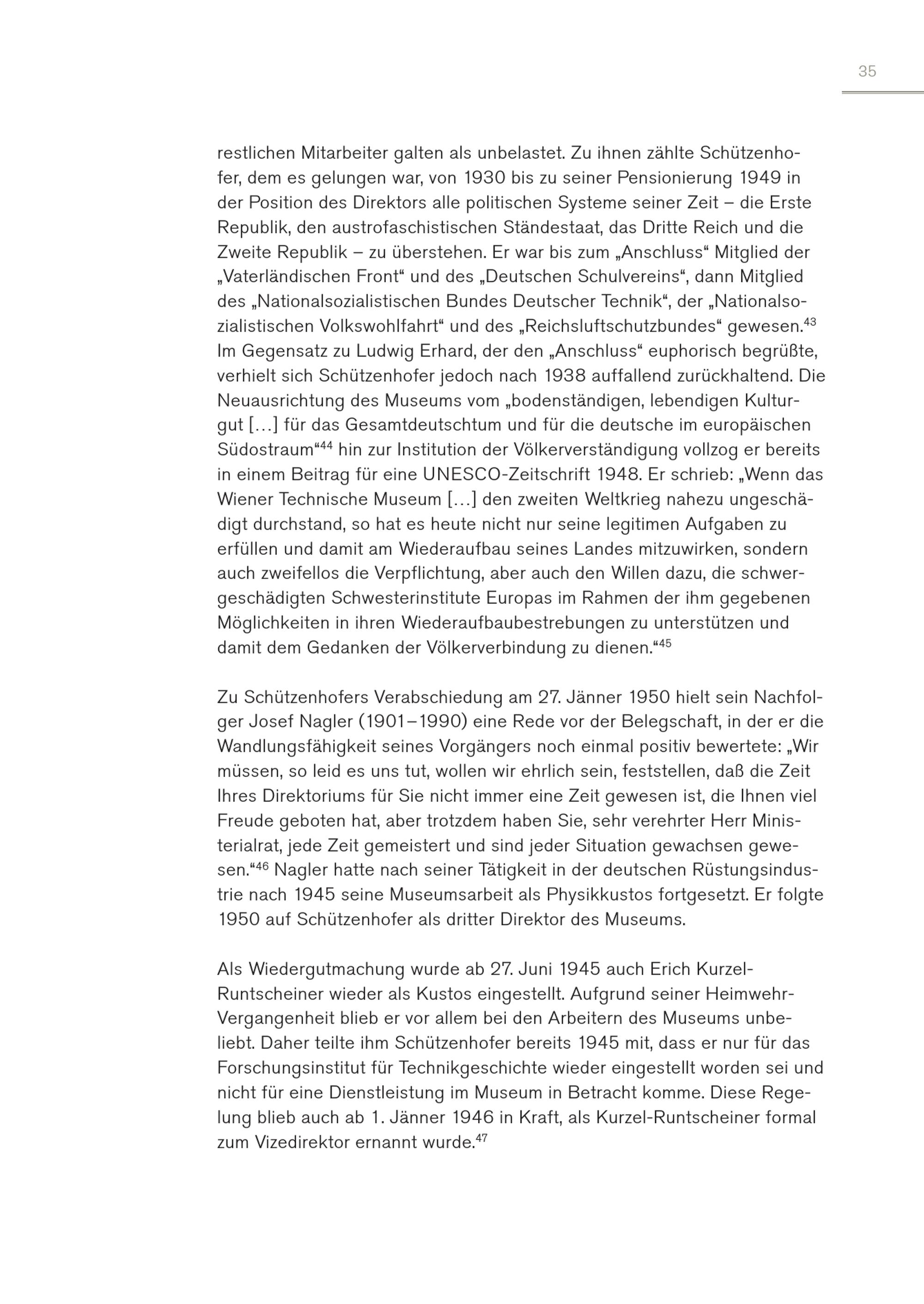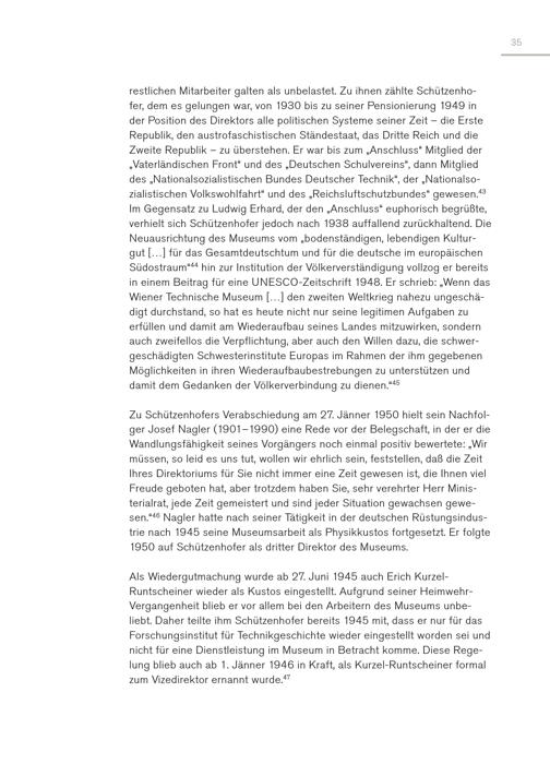 35 restlichen Mitarbeiter galten als unbelastet. Zu ihnen zählte Schützenhofer, dem es gelungen war, von 1930 bis zu seiner Pensionierung 1949 in der Position des Direktors alle politischen Systeme seiner Zeit – die Erste Republik, den austrofaschistischen Ständestaat, das Dritte Reich und die Zweite Republik – zu überstehen. Er war bis zum„Anschluss“ Mitglied der „Vaterländischen Front“ und des„Deutschen Schulvereins“, dann Mitglied des„Nationalsozialistischen Bundes Deutscher Technik“, der„Nationalsozialistischen Volkswohlfahrt“ und des„Reichsluftschutzbundes“ gewesen. 43 Im Gegensatz zu Ludwig Erhard, der den„Anschluss“ euphorisch begrüßte, verhielt sich Schützenhofer jedoch nach 1938 auffallend zurückhaltend. Die Neuausrichtung des Museums vom„bodenständigen, lebendigen Kulturgut[…] für das Gesamtdeutschtum und für die deutsche im europäischen Südostraum“ 44 hin zur Institution der Völkerverständigung vollzog er bereits in einem Beitrag für eine UNESCO-Zeitschrift 1948. Er schrieb:„Wenn das Wiener Technische Museum[…] den zweiten Weltkrieg nahezu ungeschädigt durchstand, so hat es heute nicht nur seine legitimen Aufgaben zu erfüllen und damit am Wiederaufbau seines Landes mitzuwirken, sondern auch zweifellos die Verpflichtung, aber auch den Willen dazu, die schwergeschädigten Schwesterinstitute Europas im Rahmen der ihm gegebenen Möglichkeiten in ihren Wiederaufbaubestrebungen zu unterstützen und damit dem Gedanken der Völkerverbindung zu dienen.“ 45 Zu Schützenhofers Verabschiedung am 27. Jänner 1950 hielt sein Nachfolger Josef Nagler(1901–1990) eine Rede vor der Belegschaft, in der er die Wandlungsfähigkeit seines Vorgängers noch einmal positiv bewertete:„Wir müssen, so leid es uns tut, wollen wir ehrlich sein, feststellen, daß die Zeit Ihres Direktoriums für Sie nicht immer eine Zeit gewesen ist, die Ihnen viel Freude geboten hat, aber trotzdem haben Sie, sehr verehrter Herr Ministerialrat, jede Zeit gemeistert und sind jeder Situation gewachsen gewesen.“ 46 Nagler hatte nach seiner Tätigkeit in der deutschen Rüstungsindustrie nach 1945 seine Museumsarbeit als Physikkustos fortgesetzt. Er folgte 1950 auf Schützenhofer als dritter Direktor des Museums. Als Wiedergutmachung wurde ab 27. Juni 1945 auch Erich KurzelRuntscheiner wieder als Kustos eingestellt. Aufgrund seiner HeimwehrVergangenheit blieb er vor allem bei den Arbeitern des Museums unbeliebt. Daher teilte ihm Schützenhofer bereits 1945 mit, dass er nur für das Forschungsinstitut für Technikgeschichte wieder eingestellt worden sei und nicht für eine Dienstleistung im Museum in Betracht komme. Diese Regelung blieb auch ab 1. Jänner 1946 in Kraft, als Kurzel-Runtscheiner formal zum Vizedirektor ernannt wurde. 47
