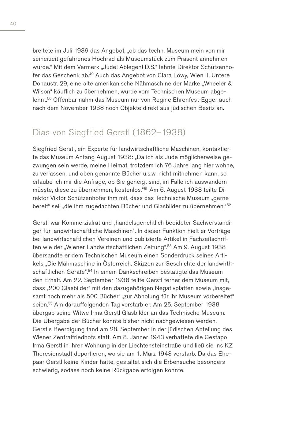 40 breitete im Juli 1939 das Angebot,„ob das techn. Museum mein von mir seinerzeit gefahrenes Hochrad als Museumstück zum Präsent annehmen würde.“ Mit dem Vermerk„Jude! Ablegen! D.S.“ lehnte Direktor Schützenhofer das Geschenk ab. 49 Auch das Angebot von Clara Löwy, Wien II, Untere Donaustr. 29, eine alte amerikanische Nähmaschine der Marke„Wheeler& Wilson“ käuflich zu übernehmen, wurde vom Technischen Museum abgelehnt. 50 Offenbar nahm das Museum nur von Regine Ehrenfest-Egger auch nach dem November 1938 noch Objekte direkt aus jüdischen Besitz an. Dias von Siegfried Gerstl(1862–1938) Siegfried Gerstl, ein Experte für landwirtschaftliche Maschinen, kontaktierte das Museum Anfang August 1938:„Da ich als Jude möglicherweise gezwungen sein werde, meine Heimat, trotzdem ich 76 Jahre lang hier wohne, zu verlassen, und oben genannte Bücher u.s.w. nicht mitnehmen kann, so erlaube ich mir die Anfrage, ob Sie geneigt sind, im Falle ich auswandern müsste, diese zu übernehmen, kostenlos.“ 51 Am 6. August 1938 teilte Direktor Viktor Schützenhofer ihm mit, dass das Technische Museum„gerne bereit“ sei,„die ihm zugedachten Bücher und Glasbilder zu übernehmen.“ 52 Gerstl war Kommerzialrat und„handelsgerichtlich beeideter Sachverständiger für landwirtschaftliche Maschinen“. In dieser Funktion hielt er Vorträge bei landwirtschaftlichen Vereinen und publizierte Artikel in Fachzeitschriften wie der„Wiener Landwirtschaftlichen Zeitung“. 53 Am 9. August 1938 übersandte er dem Technischen Museum einen Sonderdruck seines Artikels„Die Mähmaschine in Österreich. Skizzen zur Geschichte der landwirthschaftlichen Geräte“. 54 In einem Dankschreiben bestätigte das Museum den Erhalt. Am 22. September 1938 teilte Gerstl ferner dem Museum mit, dass„200 Glasbilder“ mit den dazugehörigen Negativplatten sowie„insgesamt noch mehr als 500 Bücher“„zur Abholung für Ihr Museum vorbereitet“ seien. 55 Am darauffolgenden Tag verstarb er. Am 25. September 1938 übergab seine Witwe Irma Gerstl Glasbilder an das Technische Museum. Die Übergabe der Bücher konnte bisher nicht nachgewiesen werden. Gerstls Beerdigung fand am 28. September in der jüdischen Abteilung des Wiener Zentralfriedhofs statt. Am 8. Jänner 1943 verhaftete die Gestapo Irma Gerstl in ihrer Wohnung in der Liechtensteinstraße und ließ sie ins KZ Theresienstadt deportieren, wo sie am 1. März 1943 verstarb. Da das Ehepaar Gerstl keine Kinder hatte, gestaltet sich die Erbensuche besonders schwierig, sodass noch keine Rückgabe erfolgen konnte.