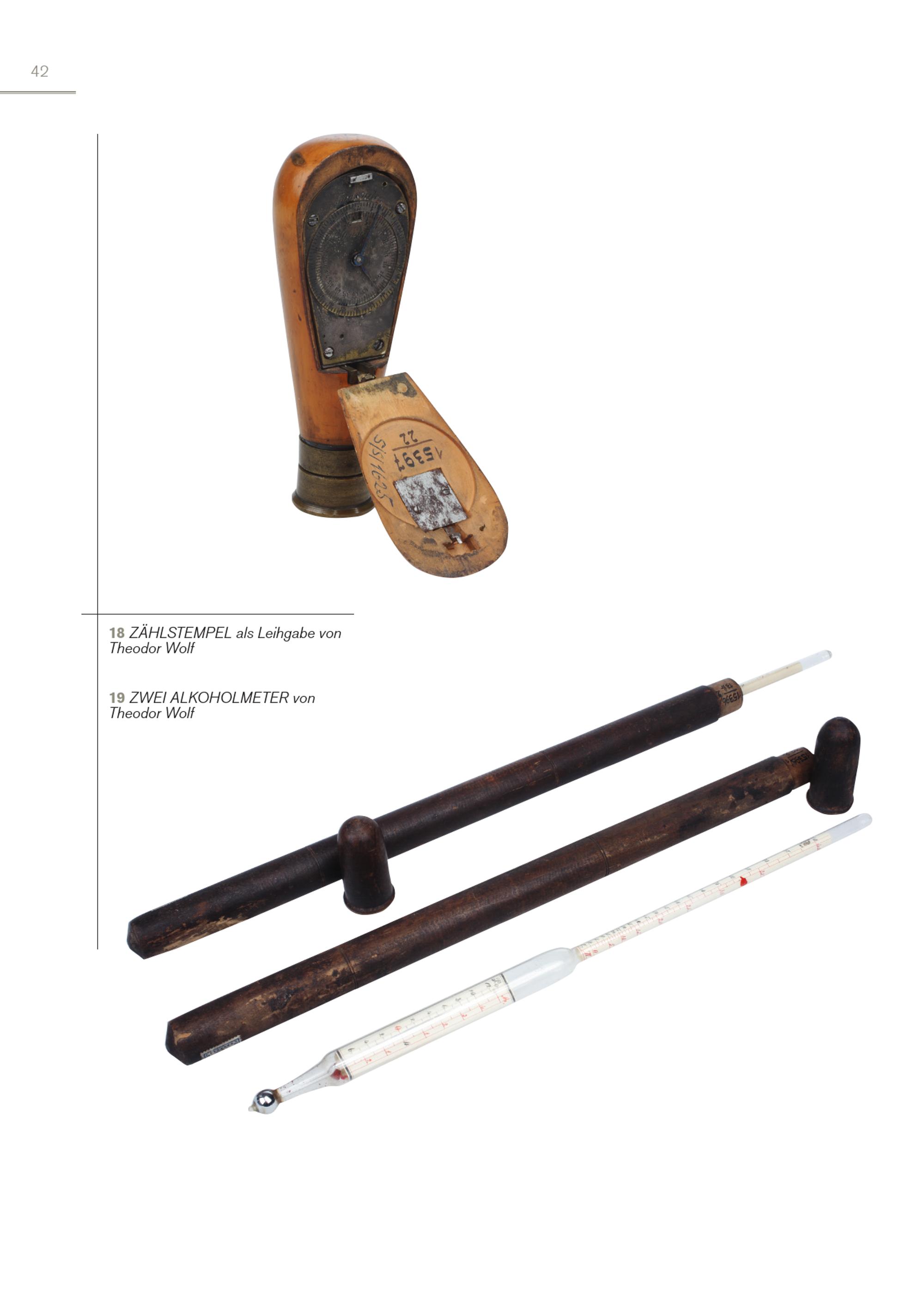 42 18 ZÄHLSTEMPEL als Leihgabe von Theodor Wolf 19 ZWEI ALKOHOLMETER von Theodor Wolf