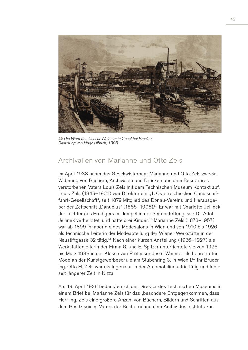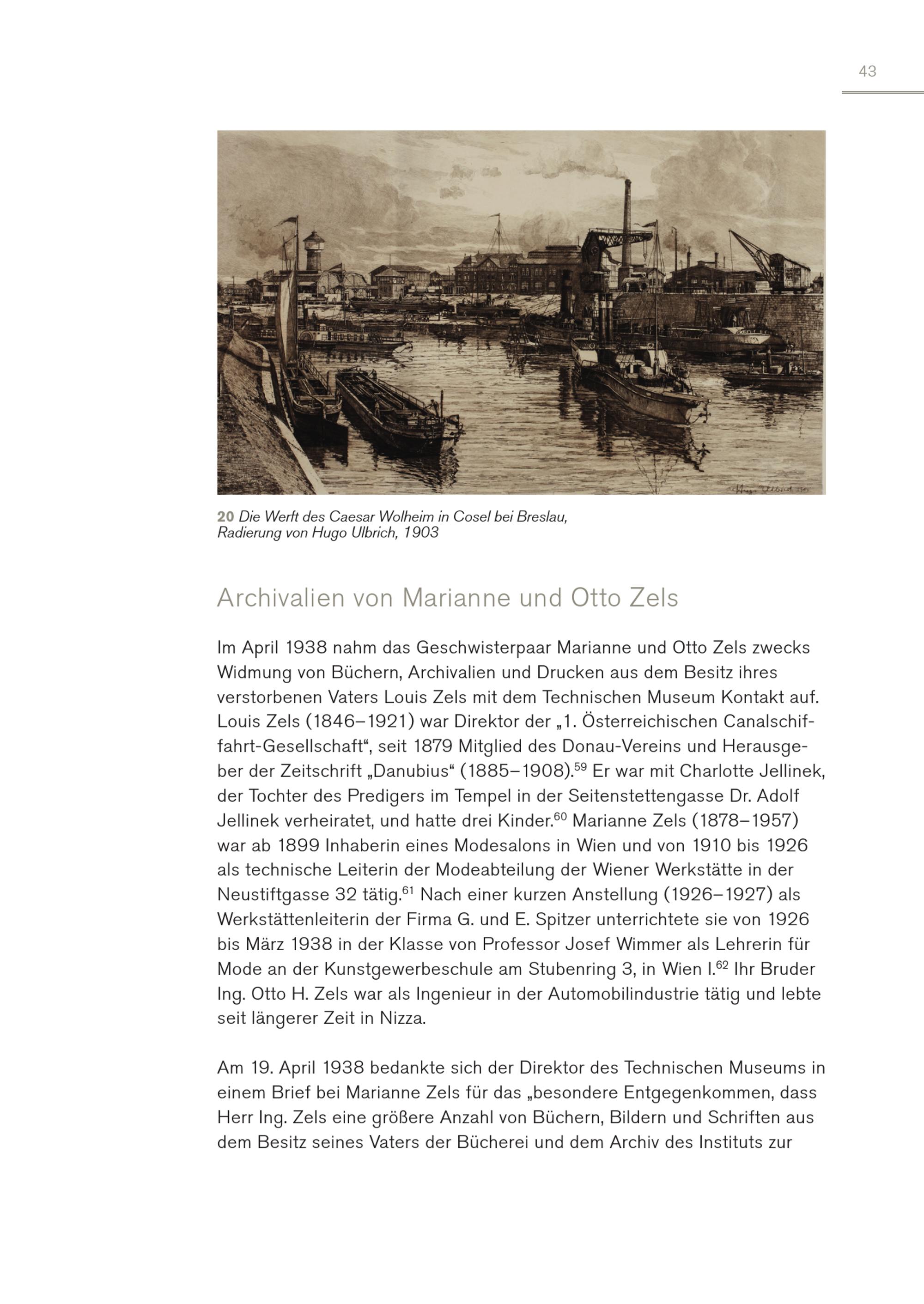 43 20 Die Werft des Caesar Wolheim in Cosel bei Breslau, Radierung von Hugo Ulbrich, 1903 Archivalien von Marianne und Otto Zels Im April 1938 nahm das Geschwisterpaar Marianne und Otto Zels zwecks Widmung von Büchern, Archivalien und Drucken aus dem Besitz ihres verstorbenen Vaters Louis Zels mit dem Technischen Museum Kontakt auf. Louis Zels(1846–1921) war Direktor der„1. Österreichischen Canalschiffahrt-Gesellschaft“, seit 1879 Mitglied des Donau-Vereins und Herausgeber der Zeitschrift„Danubius“(1885–1908). 59 Er war mit Charlotte Jellinek, der Tochter des Predigers im Tempel in der Seitenstettengasse Dr. Adolf Jellinek verheiratet, und hatte drei Kinder. 60 Marianne Zels(1878–1957) war ab 1899 Inhaberin eines Modesalons in Wien und von 1910 bis 1926 als technische Leiterin der Modeabteilung der Wiener Werkstätte in der Neustiftgasse 32 tätig. 61 Nach einer kurzen Anstellung(1926–1927) als Werkstättenleiterin der Firma G. und E. Spitzer unterrichtete sie von 1926 bis März 1938 in der Klasse von Professor Josef Wimmer als Lehrerin für Mode an der Kunstgewerbeschule am Stubenring 3, in Wien I. 62 Ihr Bruder Ing. Otto H. Zels war als Ingenieur in der Automobilindustrie tätig und lebte seit längerer Zeit in Nizza. Am 19. April 1938 bedankte sich der Direktor des Technischen Museums in einem Brief bei Marianne Zels für das„besondere Entgegenkommen, dass Herr Ing. Zels eine größere Anzahl von Büchern, Bildern und Schriften aus dem Besitz seines Vaters der Bücherei und dem Archiv des Instituts zur
