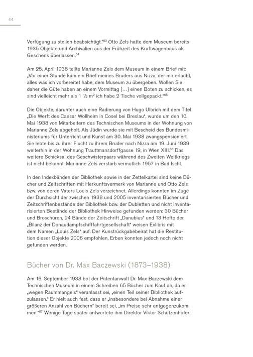 44 Verfügung zu stellen beabsichtigt.“ 63 Otto Zels hatte dem Museum bereits 1935 Objekte und Archivalien aus der Frühzeit des Kraftwagenbaus als Geschenk überlassen. 64 Am 25. April 1938 teilte Marianne Zels dem Museum in einem Brief mit: „Vor einer Stunde kam ein Brief meines Bruders aus Nizza, der mir erlaubt, alles was ich vorbereitet habe, dem Museum zu übergeben. Wollen Sie daher die Güte haben an einem Vormittag[…] einen Boten zu schicken, es sind vielleicht mehr als 1 ½ m 2 ich habe 2 Tische vollgepackt.“ 65 Die Objekte, darunter auch eine Radierung von Hugo Ulbrich mit dem Titel „Die Werft des Caesar Wollheim in Cosel bei Breslau“, wurde um den 10. Mai 1938 von Mitarbeitern des Technischen Museums in der Wohnung von Marianne Zels abgeholt. Als Jüdin wurde sie mit Bescheid des Bundesministeriums für Unterricht und Kunst am 30. Mai 1938 zwangspensioniert. Sie lebte bis zu ihrer Flucht zu ihrem Bruder nach Nizza am 19. Juni 1939 weiterhin in der Wohnung Trauttmansdorffgasse 19, in Wien XIII. 66 Das weitere Schicksal des Geschwisterpaars während des Zweiten Weltkriegs ist nicht bekannt. Marianne Zels verstarb vermutlich 1957 in Bad Ischl. In den Indexbänden der Bibliothek sowie in der Zettelkartei sind keine Bücher und Zeitschriften mit Herkunftsvermerk von Marianne und Otto Zels bzw. von deren Vaters Louis Zels verzeichnet. Allerdings konnten im Zuge der Durchsicht der zwischen 1938 und 2005 inventarisierten Bücher und Zeitschriftenbestände der Bibliothek bzw. der Dubletten und nicht inventarisierten Bestände der Bibliothek Hinweise gefunden werden: 30 Bücher und Broschüren, 24 Bände der Zeitschrift„Danubius“ und 13 Hefte der „Bilanz der Donaudampfschifffahrtgesellschaft“ weisen Exlibris mit dem Namen„Louis Zels“ auf. Der Kunstrückgabebeirat hat die Restitution dieser Objekte 2006 empfohlen, Erben konnten jedoch noch nicht gefunden werden. Bücher von Dr. Max Baczewski(1873–1938) Am 16. September 1938 bot der Patentanwalt Dr. Max Baczewski dem Technischen Museum in einem Schreiben 65 Bücher zum Kauf an, da er „wegen Raummangels“ veranlasst sei,„einen Teil seiner Bibliothek aufzulassen.“ Er hielt auch fest, dass er„insbesondere bei Abnahme einer größeren Anzahl von Büchern“ bereit sei,„im Preise sehr entgegenzukommen.“ 67 Wenige Tage später antwortete ihm Direktor Viktor Schützenhofer: