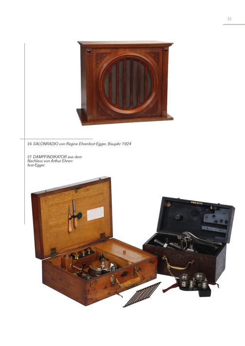 51 26 SALONRADIO von Regine Ehrenfest-Egger, Baujahr 1924 27 DAMPFINDIKATOR aus dem Nachlass von Arthur Ehrenfest-Egger