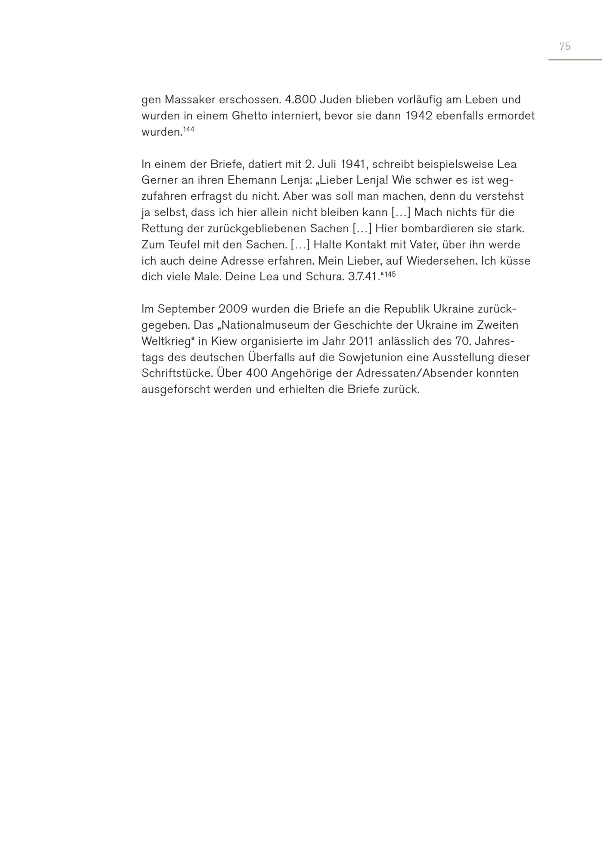 75 gen Massaker erschossen. 4.800 Juden blieben vorläufig am Leben und wurden in einem Ghetto interniert, bevor sie dann 1942 ebenfalls ermordet wurden. 144 In einem der Briefe, datiert mit 2. Juli 1941, schreibt beispielsweise Lea Gerner an ihren Ehemann Lenja:„Lieber Lenja! Wie schwer es ist wegzufahren erfragst du nicht. Aber was soll man machen, denn du verstehst ja selbst, dass ich hier allein nicht bleiben kann[…] Mach nichts für die Rettung der zurückgebliebenen Sachen[…] Hier bombardieren sie stark. Zum Teufel mit den Sachen.[…] Halte Kontakt mit Vater, über ihn werde ich auch deine Adresse erfahren. Mein Lieber, auf Wiedersehen. Ich küsse dich viele Male. Deine Lea und Schura. 3.7.41.“ 145 Im September 2009 wurden die Briefe an die Republik Ukraine zurückgegeben. Das„Nationalmuseum der Geschichte der Ukraine im Zweiten Weltkrieg“ in Kiew organisierte im Jahr 2011 anlässlich des 70. Jahrestags des deutschen Überfalls auf die Sowjetunion eine Ausstellung dieser Schriftstücke. Über 400 Angehörige der Adressaten/Absender konnten ausgeforscht werden und erhielten die Briefe zurück.
