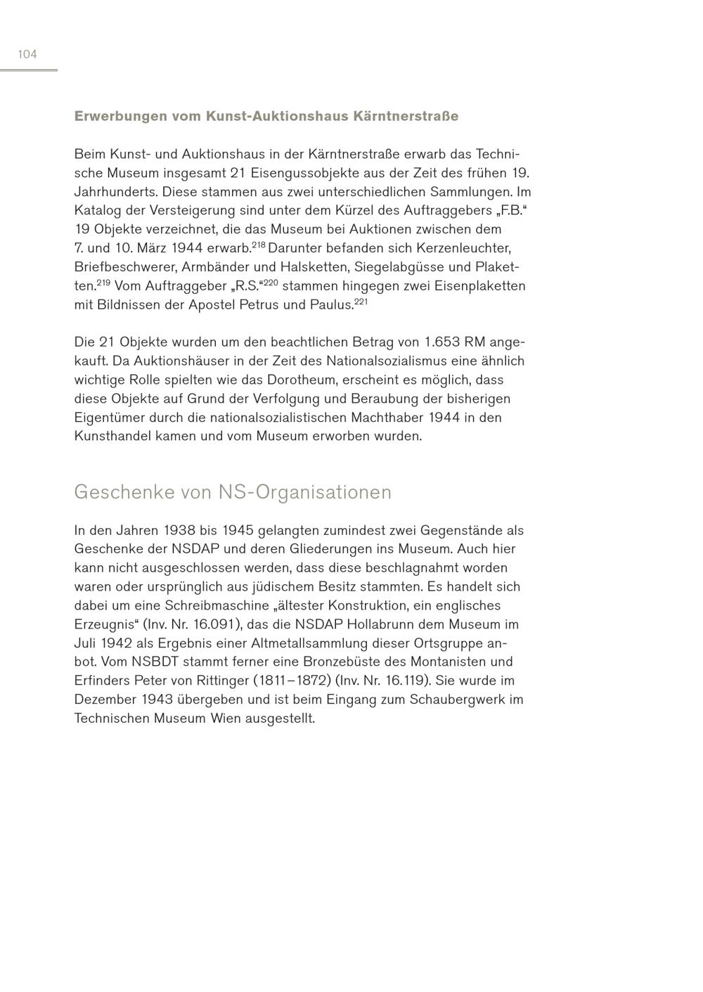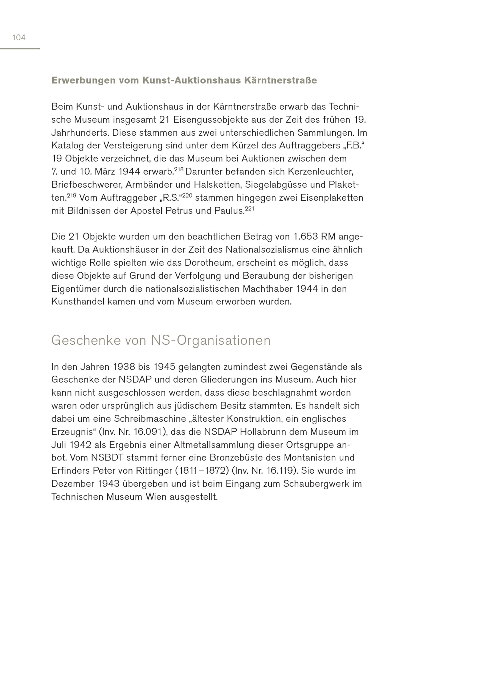 104 Erwerbungen vom Kunst-Auktionshaus Kärntnerstraße Beim Kunst- und Auktionshaus in der Kärntnerstraße erwarb das Technische Museum insgesamt 21 Eisengussobjekte aus der Zeit des frühen 19. Jahrhunderts. Diese stammen aus zwei unterschiedlichen Sammlungen. Im Katalog der Versteigerung sind unter dem Kürzel des Auftraggebers„F.B.“ 19 Objekte verzeichnet, die das Museum bei Auktionen zwischen dem 7. und 10. März 1944 erwarb. 218 Darunter befanden sich Kerzenleuchter, Briefbeschwerer, Armbänder und Halsketten, Siegelabgüsse und Plaketten. 219 Vom Auftraggeber„R.S.“ 220 stammen hingegen zwei Eisenplaketten mit Bildnissen der Apostel Petrus und Paulus. 221 Die 21 Objekte wurden um den beachtlichen Betrag von 1.653 RM angekauft. Da Auktionshäuser in der Zeit des Nationalsozialismus eine ähnlich wichtige Rolle spielten wie das Dorotheum, erscheint es möglich, dass diese Objekte auf Grund der Verfolgung und Beraubung der bisherigen Eigentümer durch die nationalsozialistischen Machthaber 1944 in den Kunsthandel kamen und vom Museum erworben wurden. Geschenke von NS-Organisationen In den Jahren 1938 bis 1945 gelangten zumindest zwei Gegenstände als Geschenke der NSDAP und deren Gliederungen ins Museum. Auch hier kann nicht ausgeschlossen werden, dass diese beschlagnahmt worden waren oder ursprünglich aus jüdischem Besitz stammten. Es handelt sich dabei um eine Schreibmaschine„ältester Konstruktion, ein englisches Erzeugnis“(Inv. Nr. 16.091), das die NSDAP Hollabrunn dem Museum im Juli 1942 als Ergebnis einer Altmetallsammlung dieser Ortsgruppe anbot. Vom NSBDT stammt ferner eine Bronzebüste des Montanisten und Erfinders Peter von Rittinger(1811–1872)(Inv. Nr. 16.119). Sie wurde im Dezember 1943 übergeben und ist beim Eingang zum Schaubergwerk im Technischen Museum Wien ausgestellt.