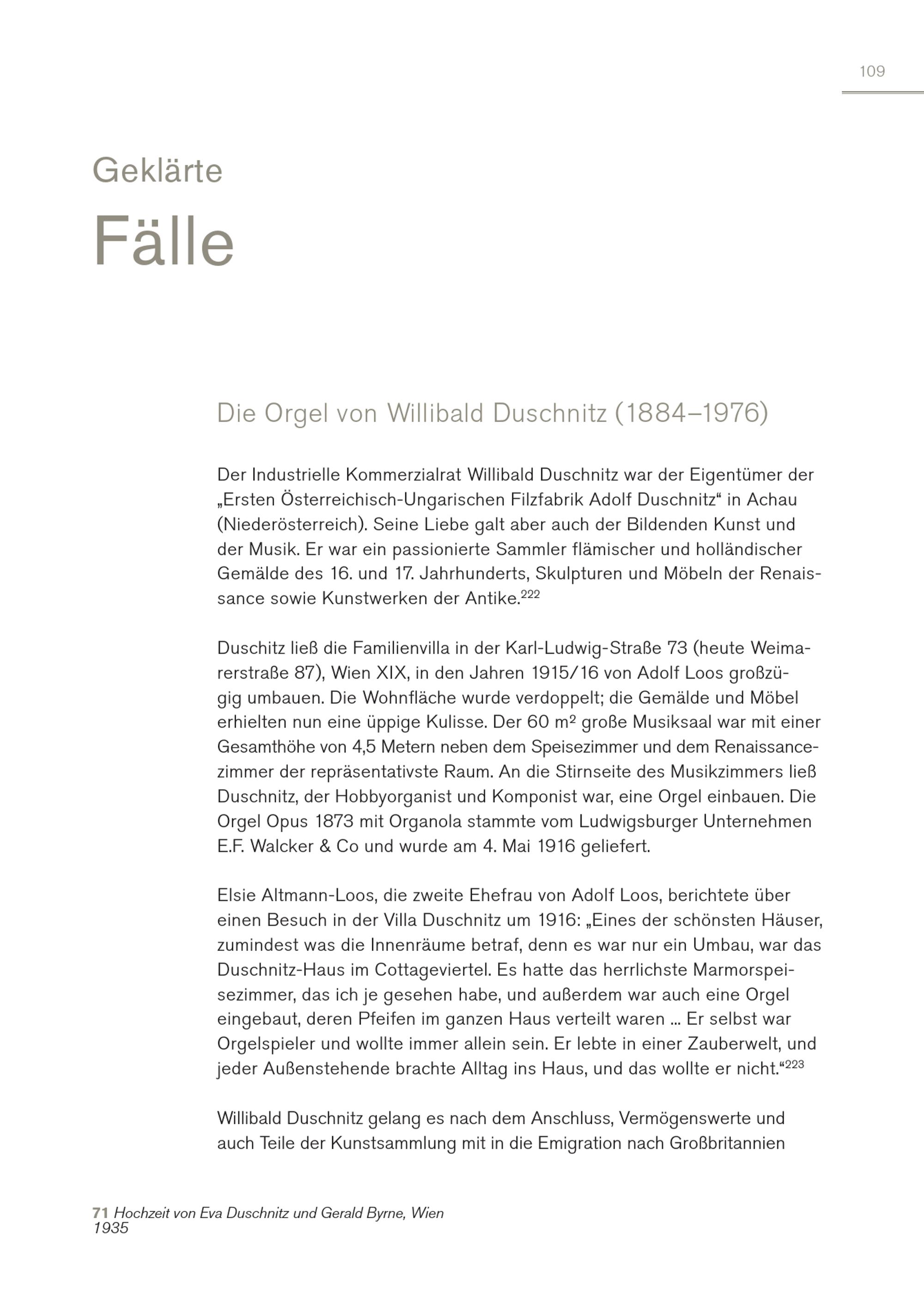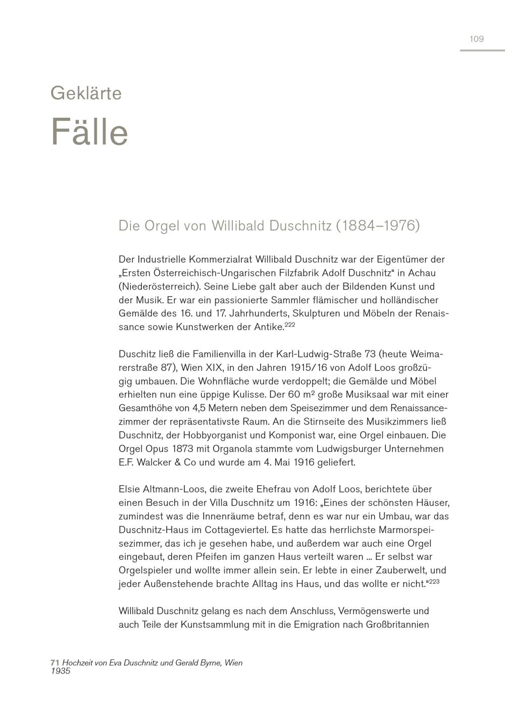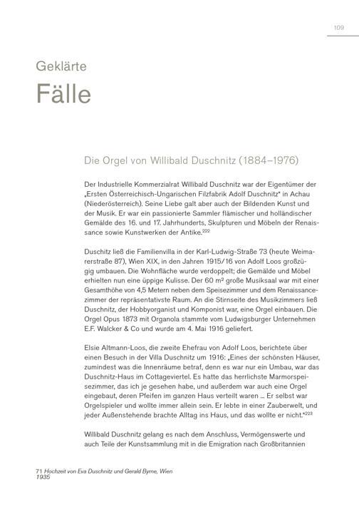 Geklärte Fälle 109 Die Orgel von Willibald Duschnitz(1884–1976) Der Industrielle Kommerzialrat Willibald Duschnitz war der Eigentümer der „Ersten Österreichisch-Ungarischen Filzfabrik Adolf Duschnitz“ in Achau (Niederösterreich). Seine Liebe galt aber auch der Bildenden Kunst und der Musik. Er war ein passionierte Sammler flämischer und holländischer Gemälde des 16. und 17. Jahrhunderts, Skulpturen und Möbeln der Renaissance sowie Kunstwerken der Antike. 222 Duschitz ließ die Familienvilla in der Karl-Ludwig-Straße 73(heute Weimarerstraße 87), Wien XIX, in den Jahren 1915/16 von Adolf Loos großzügig umbauen. Die Wohnfläche wurde verdoppelt; die Gemälde und Möbel erhielten nun eine üppige Kulisse. Der 60 m² große Musiksaal war mit einer Gesamthöhe von 4,5 Metern neben dem Speisezimmer und dem Renaissancezimmer der repräsentativste Raum. An die Stirnseite des Musikzimmers ließ Duschnitz, der Hobbyorganist und Komponist war, eine Orgel einbauen. Die Orgel Opus 1873 mit Organola stammte vom Ludwigsburger Unternehmen E.F. Walcker& Co und wurde am 4. Mai 1916 geliefert. Elsie Altmann-Loos, die zweite Ehefrau von Adolf Loos, berichtete über einen Besuch in der Villa Duschnitz um 1916:„Eines der schönsten Häuser, zumindest was die Innenräume betraf, denn es war nur ein Umbau, war das Duschnitz-Haus im Cottageviertel. Es hatte das herrlichste Marmorspeisezimmer, das ich je gesehen habe, und außerdem war auch eine Orgel eingebaut, deren Pfeifen im ganzen Haus verteilt waren... Er selbst war Orgelspieler und wollte immer allein sein. Er lebte in einer Zauberwelt, und jeder Außenstehende brachte Alltag ins Haus, und das wollte er nicht.“ 223 Willibald Duschnitz gelang es nach dem Anschluss, Vermögenswerte und auch Teile der Kunstsammlung mit in die Emigration nach Großbritannien 71 Hochzeit von Eva Duschnitz und Gerald Byrne, Wien 1935