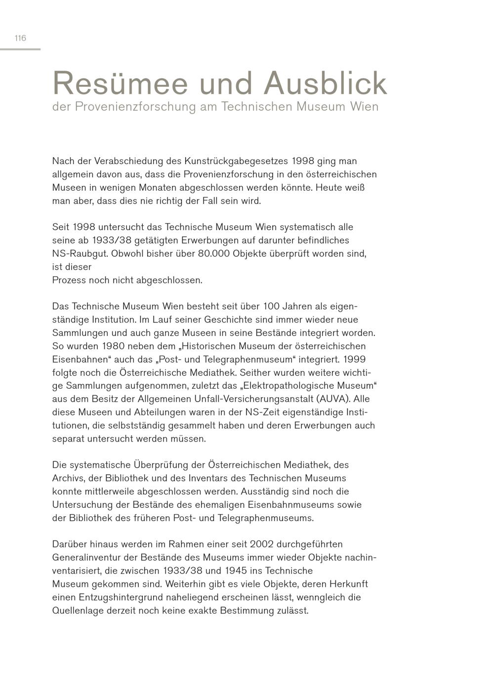 116 Resümee und Ausblick der Provenienzforschung am Technischen Museum Wien Nach der Verabschiedung des Kunstrückgabegesetzes 1998 ging man allgemein davon aus, dass die Provenienzforschung in den österreichischen Museen in wenigen Monaten abgeschlossen werden könnte. Heute weiß man aber, dass dies nie richtig der Fall sein wird. Seit 1998 untersucht das Technische Museum Wien systematisch alle seine ab 1933/38 getätigten Erwerbungen auf darunter befindliches NS-Raubgut. Obwohl bisher über 80.000 Objekte überprüft worden sind, ist dieser Prozess noch nicht abgeschlossen. Das Technische Museum Wien besteht seit über 100 Jahren als eigenständige Institution. Im Lauf seiner Geschichte sind immer wieder neue Sammlungen und auch ganze Museen in seine Bestände integriert worden. So wurden 1980 neben dem„Historischen Museum der österreichischen Eisenbahnen“ auch das„Post- und Telegraphenmuseum“ integriert. 1999 folgte noch die Österreichische Mediathek. Seither wurden weitere wichtige Sammlungen aufgenommen, zuletzt das„Elektropathologische Museum“ aus dem Besitz der Allgemeinen Unfall-Versicherungsanstalt(AUVA). Alle diese Museen und Abteilungen waren in der NS-Zeit eigenständige Institutionen, die selbstständig gesammelt haben und deren Erwerbungen auch separat untersucht werden müssen. Die systematische Überprüfung der Österreichischen Mediathek, des Archivs, der Bibliothek und des Inventars des Technischen Museums konnte mittlerweile abgeschlossen werden. Ausständig sind noch die Untersuchung der Bestände des ehemaligen Eisenbahnmuseums sowie der Bibliothek des früheren Post- und Telegraphenmuseums. Darüber hinaus werden im Rahmen einer seit 2002 durchgeführten Generalinventur der Bestände des Museums immer wieder Objekte nachinventarisiert, die zwischen 1933/38 und 1945 ins Technische Museum gekommen sind. Weiterhin gibt es viele Objekte, deren Herkunft einen Entzugshintergrund naheliegend erscheinen lässt, wenngleich die Quellenlage derzeit noch keine exakte Bestimmung zulässt.
