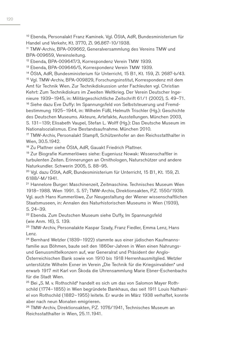120 10 Ebenda, Personalakt Franz Kaminek. Vgl. ÖStA, AdR, Bundesministerium für Handel und Verkehr, Kt. 3770, Zl. 96.867-10/1938. 11 TMW-Archiv, BPA-009662, Generalversammlung des Vereins TMW und BPA-009659, Vereinsleitung. 12 Ebenda, BPA-009647/3, Korrespondenz Verein TMW 1939. 13 Ebenda, BPA-009646/5, Korrespondenz Verein TMW 1939. 14 ÖStA, AdR, Bundesministerium für Unterricht, 15 B1, Kt. 159, Zl. 2687-b/43. 15 Vgl. TMW-Archiv, BPA-009829, Forschungsinstitut, Korrespondenz mit dem Amt für Technik Wien. Zur Technikdiskussion unter Fachleuten vgl. Christian Kehrt: Zum Technikdiskurs im Zweiten Weltkrieg. Der Verein Deutscher Ingenieure 1939–1945, in: Militärgeschichtliche Zeitschrift 61/1(2002), S. 49–71. 16 Siehe dazu Eve Duffy: Im Spannungsfeld von Selbststeuerung und Fremdbestimmung 1925–1944, in: Wilhelm Füßl, Helmuth Trischler(Hg.): Geschichte des Deutschen Museums. Akteure, Artefakte, Ausstellungen. München 2003, S. 131–139; Elisabeth Vaupel, Stefan L. Wolff(Hg.): Das Deutsche Museum im Nationalsozialismus. Eine Bestandsaufnahme. München 2010. 17 TMW-Archiv, Personalakt Stampfl, Schützenhofer an den Reichsstatthalter in Wien, 30.5.1942. 18 Zu Plattner siehe ÖStA, AdR, Gauakt Friedrich Plattner. 19 Zur Biografie Kummerlöwes siehe: Eugeniusz Nowak: Wissenschaftler in turbulenten Zeiten. Erinnerungen an Ornithologen, Naturschützer und andere Naturkundler. Schwerin 2005, S. 88–95. 20 Vgl. dazu ÖStA, AdR, Bundesministerium für Unterricht, 15 B1, Kt. 159, Zl. 6188/-M/1941. 21 Hannelore Burger: Maschinenzeit, Zeitmaschine. Technisches Museum Wien 1918–1988. Wien 1991. S. 57; TMW-Archiv, Direktionsakten, P.Z. 1550/1939. Vgl. auch Hans Kummerlöwe, Zur Neugestaltung der Wiener wissenschaftlichen Staatsmuseen, in: Annalen des Naturhistorischen Museums in Wien(1939), S. 24–39. 22 Ebenda. Zum Deutschen Museum siehe Duffy, Im Spannungsfeld (wie Anm. 16), S. 139. 23 TMW-Archiv, Personalakte Kaspar Szady, Franz Fiedler, Emma Lenz, Hans Lenz. 24 Bernhard Wetzler(1839–1922) stammte aus einer jüdischen Kaufmannsfamilie aus Böhmen, baute seit den 1860er-Jahren in Wien einen Nahrungsund Genussmittelkonzern auf, war Generalrat und Präsident der AngloÖsterreichischen Bank sowie von 1910 bis 1918 Herrenhausmitglied. Wetzler unterstützte Wilhelm Exner im Verein„Die Technik für die Kriegsinvaliden“ und erwarb 1917 mit Karl von Škoda die Uhrensammlung Marie Ebner-Eschenbachs für die Stadt Wien. 25 Bei„S. M. v. Rothschild“ handelt es sich um das von Salomon Mayer Rothschild(1774–1855) in Wien begründete Bankhaus, das seit 1911 Louis Nathaniel von Rothschild(1882–1955) leitete. Er wurde im März 1938 verhaftet, konnte aber nach neun Monaten emigrieren. 26 TMW-Archiv, Direktionsakten, P.Z. 1076/1941, Technisches Museum an Reichsstatthalter in Wien, 25.11.1941.