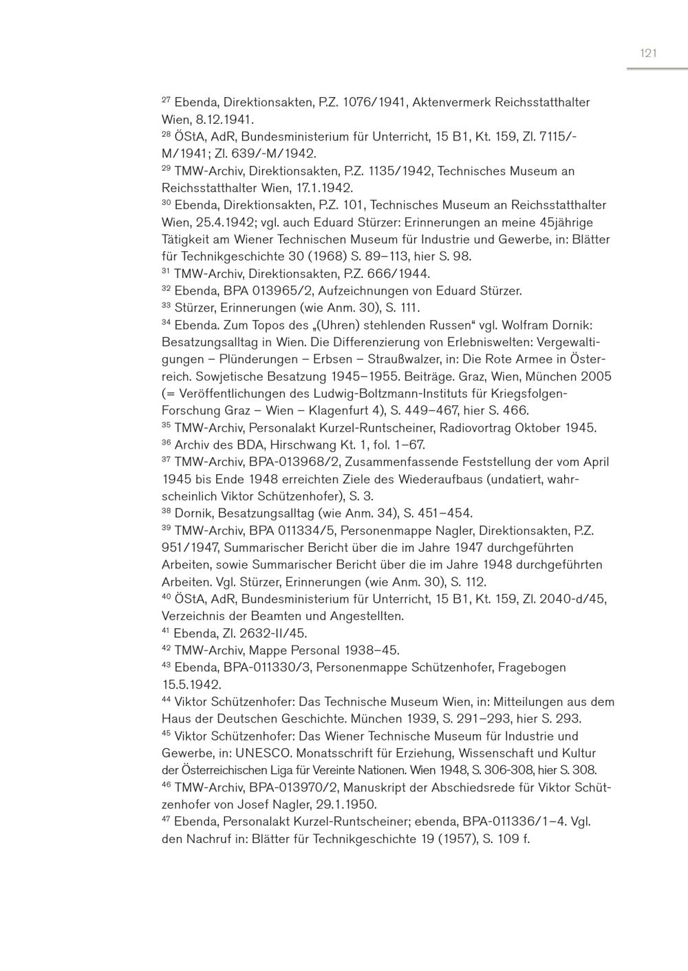 121 27 Ebenda, Direktionsakten, P.Z. 1076/1941, Aktenvermerk Reichsstatthalter Wien, 8.12.1941. 28 ÖStA, AdR, Bundesministerium für Unterricht, 15 B1, Kt. 159, Zl. 7115/M/1941; Zl. 639/-M/1942. 29 TMW-Archiv, Direktionsakten, P.Z. 1135/1942, Technisches Museum an Reichsstatthalter Wien, 17.1.1942. 30 Ebenda, Direktionsakten, P.Z. 101, Technisches Museum an Reichsstatthalter Wien, 25.4.1942; vgl. auch Eduard Stürzer: Erinnerungen an meine 45jährige Tätigkeit am Wiener Technischen Museum für Industrie und Gewerbe, in: Blätter für Technikgeschichte 30(1968) S. 89–113, hier S. 98. 31 TMW-Archiv, Direktionsakten, P.Z. 666/1944. 32 Ebenda, BPA 013965/2, Aufzeichnungen von Eduard Stürzer. 33 Stürzer, Erinnerungen(wie Anm. 30), S. 111. 34 Ebenda. Zum Topos des„(Uhren) stehlenden Russen“ vgl. Wolfram Dornik: Besatzungsalltag in Wien. Die Differenzierung von Erlebniswelten: Vergewaltigungen – Plünderungen – Erbsen – Straußwalzer, in: Die Rote Armee in Österreich. Sowjetische Besatzung 1945–1955. Beiträge. Graz, Wien, München 2005 (= Veröffentlichungen des Ludwig-Boltzmann-Instituts für KriegsfolgenForschung Graz – Wien – Klagenfurt 4), S. 449–467, hier S. 466. 35 TMW-Archiv, Personalakt Kurzel-Runtscheiner, Radiovortrag Oktober 1945. 36 Archiv des BDA, Hirschwang Kt. 1, fol. 1–67. 37 TMW-Archiv, BPA-013968/2, Zusammenfassende Feststellung der vom April 1945 bis Ende 1948 erreichten Ziele des Wiederaufbaus(undatiert, wahrscheinlich Viktor Schützenhofer), S. 3. 38 Dornik, Besatzungsalltag(wie Anm. 34), S. 451–454. 39 TMW-Archiv, BPA 011334/5, Personenmappe Nagler, Direktionsakten, P.Z. 951/1947, Summarischer Bericht über die im Jahre 1947 durchgeführten Arbeiten, sowie Summarischer Bericht über die im Jahre 1948 durchgeführten Arbeiten. Vgl. Stürzer, Erinnerungen(wie Anm. 30), S. 112. 40 ÖStA, AdR, Bundesministerium für Unterricht, 15 B1, Kt. 159, Zl. 2040-d/45, Verzeichnis der Beamten und Angestellten. 41 Ebenda, Zl. 2632-II/45. 42 TMW-Archiv, Mappe Personal 1938–45. 43 Ebenda, BPA-011330/3, Personenmappe Schützenhofer, Fragebogen 15.5.1942. 44 Viktor Schützenhofer: Das Technische Museum Wien, in: Mitteilungen aus dem Haus der Deutschen Geschichte. München 1939, S. 291–293, hier S. 293. 45 Viktor Schützenhofer: Das Wiener Technische Museum für Industrie und Gewerbe, in: UNESCO. Monatsschrift für Erziehung, Wissenschaft und Kultur der Österreichischen Liga für Vereinte Nationen. Wien 1948, S. 306-308, hier S. 308. 46 TMW-Archiv, BPA-013970/2, Manuskript der Abschiedsrede für Viktor Schützenhofer von Josef Nagler, 29.1.1950. 47 Ebenda, Personalakt Kurzel-Runtscheiner; ebenda, BPA-011336/1–4. Vgl. den Nachruf in: Blätter für Technikgeschichte 19(1957), S. 109 f.