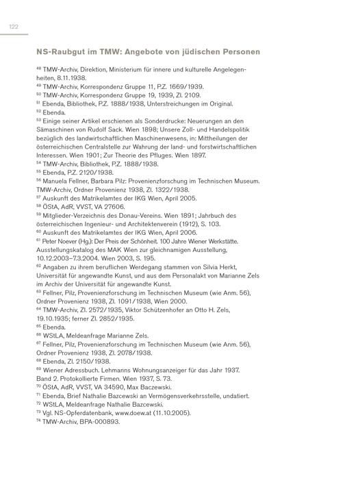 122 NS-Raubgut im TMW: Angebote von jüdischen Personen 48 TMW-Archiv, Direktion, Ministerium für innere und kulturelle Angelegenheiten, 8.11.1938. 49 TMW-Archiv, Korrespondenz Gruppe 11, P.Z. 1669/1939. 50 TMW-Archiv, Korrespondenz Gruppe 19, 1939, Zl. 2109. 51 Ebenda, Bibliothek, P.Z. 1888/1938, Unterstreichungen im Original. 52 Ebenda. 53 Einige seiner Artikel erschienen als Sonderdrucke: Neuerungen an den Sämaschinen von Rudolf Sack. Wien 1898; Unsere Zoll- und Handelspolitik bezüglich des landwirtschaftlichen Maschinenwesens, in: Mittheilungen der österreichischen Centralstelle zur Wahrung der land- und forstwirtschaftlichen Interessen. Wien 1901; Zur Theorie des Pfluges. Wien 1897. 54 TMW-Archiv, Bibliothek, P.Z. 1888/1938. 55 Ebenda, P.Z. 2120/1938. 56 Manuela Fellner, Barbara Pilz: Provenienzforschung im Technischen Museum. TMW-Archiv, Ordner Provenienz 1938, Zl. 1322/1938. 57 Auskunft des Matrikelamtes der IKG Wien, April 2005. 58 ÖStA, AdR, VVST, VA 27606. 59 Mitglieder-Verzeichnis des Donau-Vereins. Wien 1891; Jahrbuch des österreichischen Ingenieur- und Architektenverein(1912), S. 103. 60 Auskunft des Matrikelamtes der IKG Wien, April 2006. 61 Peter Noever(Hg.): Der Preis der Schönheit. 100 Jahre Wiener Werkstätte. Ausstellungskatalog des MAK Wien zur gleichnamigen Ausstellung, 10.12.2003–7.3.2004. Wien 2003, S. 195. 62 Angaben zu ihrem beruflichen Werdegang stammen von Silvia Herkt, Universität für angewandte Kunst, und aus dem Personalakt von Marianne Zels im Archiv der Universität für angewandte Kunst. 63 Fellner, Pilz, Provenienzforschung im Technischen Museum(wie Anm. 56), Ordner Provenienz 1938, Zl. 1091/1938, Wien 2000. 64 TMW-Archiv, Zl. 2572/1935, Viktor Schützenhofer an Otto H. Zels, 19.10.1935; ferner Zl. 2852/1935. 65 Ebenda. 66 WStLA, Meldeanfrage Marianne Zels. 67 Fellner, Pilz, Provenienzforschung im Technischen Museum(wie Anm. 56), Ordner Provenienz 1938, Zl. 2078/1938. 68 Ebenda, Zl. 2150/1938. 69 Wiener Adressbuch. Lehmanns Wohnungsanzeiger für das Jahr 1937. Band 2. Protokollierte Firmen. Wien 1937, S. 73. 70 ÖStA, AdR, VVST, VA 34590, Max Baczewski. 71 Ebenda, Brief Nathalie Bazcewski an Vermögensverkehrsstelle, undatiert. 72 WStLA, Meldeanfrage Nathalie Bazcewski. 73 Vgl. NS-Opferdatenbank, www.doew.at(11.10.2005). 74 TMW-Archiv, BPA-000893.