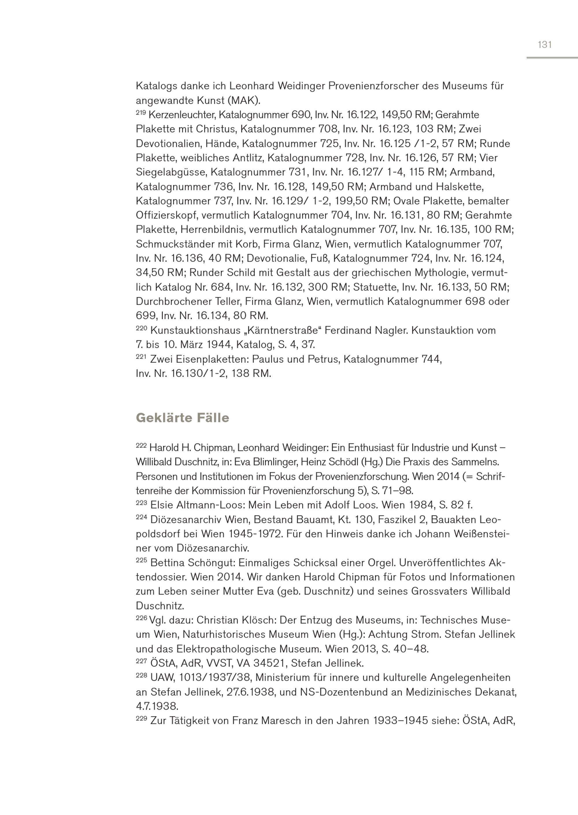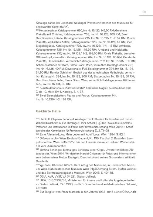 131 Katalogs danke ich Leonhard Weidinger Provenienzforscher des Museums für angewandte Kunst(MAK). 219 Kerzenleuchter, Katalognummer 690, Inv. Nr. 16.122, 149,50 RM; Gerahmte Plakette mit Christus, Katalognummer 708, Inv. Nr. 16.123, 103 RM; Zwei Devotionalien, Hände, Katalognummer 725, Inv. Nr. 16.125 /1-2, 57 RM; Runde Plakette, weibliches Antlitz, Katalognummer 728, Inv. Nr. 16.126, 57 RM; Vier Siegelabgüsse, Katalognummer 731, Inv. Nr. 16.127/ 1-4, 115 RM; Armband, Katalognummer 736, Inv. Nr. 16.128, 149,50 RM; Armband und Halskette, Katalognummer 737, Inv. Nr. 16.129/ 1-2, 199,50 RM; Ovale Plakette, bemalter Offizierskopf, vermutlich Katalognummer 704, Inv. Nr. 16.131, 80 RM; Gerahmte Plakette, Herrenbildnis, vermutlich Katalognummer 707, Inv. Nr. 16.135, 100 RM; Schmuckständer mit Korb, Firma Glanz, Wien, vermutlich Katalognummer 707, Inv. Nr. 16.136, 40 RM; Devotionalie, Fuß, Katalognummer 724, Inv. Nr. 16.124, 34,50 RM; Runder Schild mit Gestalt aus der griechischen Mythologie, vermutlich Katalog Nr. 684, Inv. Nr. 16.132, 300 RM; Statuette, Inv. Nr. 16.133, 50 RM; Durchbrochener Teller, Firma Glanz, Wien, vermutlich Katalognummer 698 oder 699, Inv. Nr. 16.134, 80 RM. 220 Kunstauktionshaus„Kärntnerstraße“ Ferdinand Nagler. Kunstauktion vom 7. bis 10. März 1944, Katalog, S. 4, 37. 221 Zwei Eisenplaketten: Paulus und Petrus, Katalognummer 744, Inv. Nr. 16.130/1-2, 138 RM. Geklärte Fälle 222 Harold H. Chipman, Leonhard Weidinger: Ein Enthusiast für Industrie und Kunst – Willibald Duschnitz, in: Eva Blimlinger, Heinz Schödl(Hg.) Die Praxis des Sammelns. Personen und Institutionen im Fokus der Provenienzforschung. Wien 2014(= Schriftenreihe der Kommission für Provenienzforschung 5), S. 71–98. 223 Elsie Altmann-Loos: Mein Leben mit Adolf Loos. Wien 1984, S. 82 f. 224 Diözesanarchiv Wien, Bestand Bauamt, Kt. 130, Faszikel 2, Bauakten Leopoldsdorf bei Wien 1945-1972. Für den Hinweis danke ich Johann Weißensteiner vom Diözesanarchiv. 225 Bettina Schöngut: Einmaliges Schicksal einer Orgel. Unveröffentlichtes Aktendossier. Wien 2014. Wir danken Harold Chipman für Fotos und Informationen zum Leben seiner Mutter Eva(geb. Duschnitz) und seines Grossvaters Willibald Duschnitz. 226 Vgl. dazu: Christian Klösch: Der Entzug des Museums, in: Technisches Museum Wien, Naturhistorisches Museum Wien(Hg.): Achtung Strom. Stefan Jellinek und das Elektropathologische Museum. Wien 2013, S. 40–48. 227 ÖStA, AdR, VVST, VA 34521, Stefan Jellinek. 228 UAW, 1013/1937/38, Ministerium für innere und kulturelle Angelegenheiten an Stefan Jellinek, 27.6.1938, und NS-Dozentenbund an Medizinisches Dekanat, 4.7.1938. 229 Zur Tätigkeit von Franz Maresch in den Jahren 1933–1945 siehe: ÖStA, AdR,