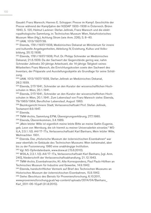 132 Gauakt: Franz Maresch; Hannes E. Schopper: Presse im Kampf. Geschichte der Presse während der Kampfjahre der NSDAP 1933–1938 in Österreich. Brünn 1940, S. 120, Helmut Lackner: Stefan Jellinek, Franz Maresch und die elektropathologische Sammlung, in: Technisches Museum Wien, Naturhistorisches Museum Wien(Hg.), Achtung Strom(wie Anm. 226), S. 8–40. 230 UAW, 1013/1937/38. 231 Ebenda, 1781/1937/1938, Medizinisches Dekanat an Ministerium für innere und kulturelle Angelegenheiten, Abteilung IV, Erziehung, Kultus und Volksbildung, 20.12.1938. 232 Ebenda, 1781/1937/1938, Prof. Dr. Philipp Schneider an Medizinisches Dekanat, 21.6.1939. Da der Sachwert der Gegenstände gering war, nahm Schneider Jellineks 30-jährige Arbeitszeit, die 14-jährige Tätigkeit seines Mitarbeiters Franz Maresch, die Einrichtungskosten sowie den Sachwert des Inventars, der Präparate und Ausstellungsobjekte als Grundlage für seine Schätzung. 233 UAW, 1013/1937/1938, Stefan Jellinek an Medizinisches Dekanat, 28.2.1939. 234 Ebenda, 217/1941, Schneider an den Kurator der wissenschaftlichen Hochschulen in Wien, 20.1.1941. 235 Ebenda, 217/1941, Schneider an den Kurator der wissenschaftlichen Hochschulen in Wien, 20.1.1941. Zum Lebenslauf von Franz Maresch siehe: Ebenda, 79/1963/1964, Beruflicher Lebenslauf, August 1963. 236 Bezirksgericht Innere Stadt, Verlassenschaftsakt Prof. Stefan Jellinek, Testament 8.9.1947. 237 Ebenda. 238 TMW-Archiv, Sammlung EPM, Übereignungserklärung, 27.7.1980. 239 Ebenda, Übereinkommen, 3.4.1989. 240 „Mein letzter Wille ist eigentlich meine letzte Bitte an meine Gattin Eugenie, geb. Leon von Wernburg, die ich hiermit zu meiner Universalerbin einsetze.“ WStLA, 2.3.1.1(I). A4/17-17a, Verlassenschaftsakt Karl Banhans, Mein letzter Wille, Weihnachten 1931. 241 Ebenda. Das„Historische Museum der österreichischen Eisenbahnen“ war zwar ebenfalls im Gebäude des Technischen Museums Wien beheimatet, aber bis zu der Fusionierung 1980 eine unabhängige Institution. 242 Vgl. NS-Opferdatenbank, www.doew.at(15.6.2010). 243 WStLA, 2.3.1.1(I). A4/17-17a, Verlassenschaftsakt Karl Banhans,[vgl. Anm. 240], Niederschrift der Verlassenschaftsabhandlung, 21.12.1943. 244 TMW-Archiv, Eisenbahnarchiv, Kt. Alte Korrespondenz, Paul Pauls-Höfken an Technisches Museum für Industrie und Gewerbe, 14.9.1942. 245 Ebenda, handschriftlicher Vermerk auf Brief des Technischen Museums an Historisches Museum der österreichischen Eisenbahnen, 15.9.1942. 246 Siehe: Beschluss des Beirats für Provenienzforschung, 6.10.2011, www.provenienzforschung.gv.at/wp-content/uploads/2014/04/Banhans_ Karl_2011-06-10.pdf(31.8.2015).