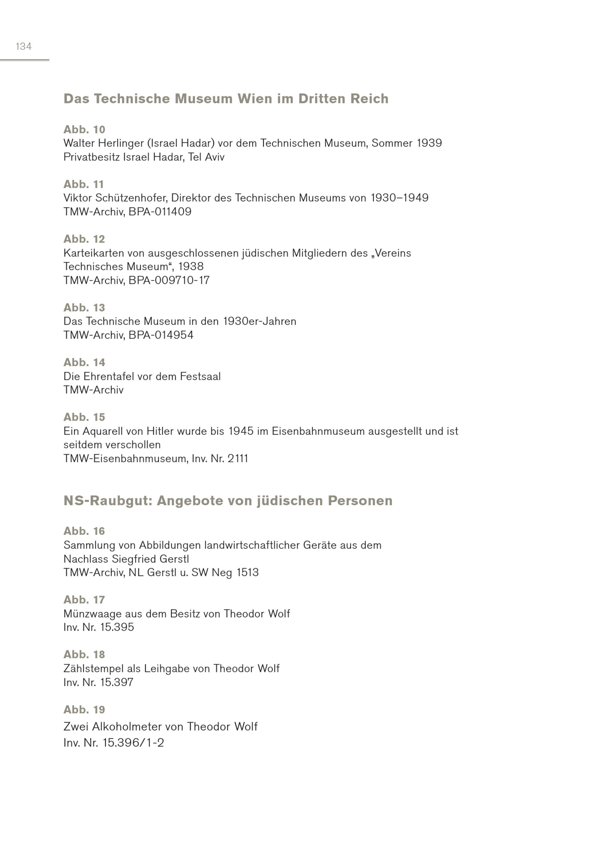 134 Das Technische Museum Wien im Dritten Reich Abb. 10 Walter Herlinger(Israel Hadar) vor dem Technischen Museum, Sommer 1939 Privatbesitz Israel Hadar, Tel Aviv Abb. 11 Viktor Schützenhofer, Direktor des Technischen Museums von 1930–1949 TMW-Archiv, BPA-011409 Abb. 12 Karteikarten von ausgeschlossenen jüdischen Mitgliedern des„Vereins Technisches Museum“, 1938 TMW-Archiv, BPA-009710-17 Abb. 13 Das Technische Museum in den 1930er-Jahren TMW-Archiv, BPA-014954 Abb. 14 Die Ehrentafel vor dem Festsaal TMW-Archiv Abb. 15 Ein Aquarell von Hitler wurde bis 1945 im Eisenbahnmuseum ausgestellt und ist seitdem verschollen TMW-Eisenbahnmuseum, Inv. Nr. 2111 NS-Raubgut: Angebote von jüdischen Personen Abb. 16 Sammlung von Abbildungen landwirtschaftlicher Geräte aus dem Nachlass Siegfried Gerstl TMW-Archiv, NL Gerstl u. SW Neg 1513 Abb. 17 Münzwaage aus dem Besitz von Theodor Wolf Inv. Nr. 15.395 Abb. 18 Zählstempel als Leihgabe von Theodor Wolf Inv. Nr. 15.397 Abb. 19 Zwei Alkoholmeter von Theodor Wolf Inv. Nr. 15.396/1-2