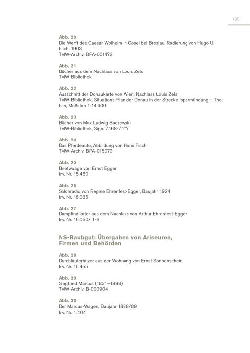 135 Abb. 20 Die Werft des Caesar Wolheim in Cosel bei Breslau, Radierung von Hugo Ulbrich, 1903 TMW-Archiv, BPA-001473 Abb. 21 Bücher aus dem Nachlass von Louis Zels TMW-Bibliothek Abb. 22 Ausschnitt der Donaukarte von Wien, Nachlass Louis Zels TMW-Bibliothek, Situations-Plan der Donau in der Strecke Ispermündung – Theben, Maßstab 1:14.400 Abb. 23 Bücher von Max Ludwig Baczewski TMW-Bibliothek, Sign. 7.168-7.177 Abb. 24 Das Pferdeauto, Abbildung von Hans Fischl TMW-Archiv, BPA-015073 Abb. 25 Briefwaage von Ernst Egger Inv. Nr. 15.460 Abb. 26 Salonradio von Regine Ehrenfest-Egger, Baujahr 1924 Inv. Nr. 16.085 Abb. 27 Dampfindikator aus dem Nachlass von Arthur Ehrenfest-Egger Inv. Nr. 16.060/ 1-3 NS-Raubgut: Übergaben von Ariseuren, Firmen und Behörden Abb. 28 Durchlauferhitzer aus der Wohnung von Ernst Sonnenschein Inv. Nr. 15.455 Abb. 29 Siegfried Marcus(1831–1898) TMW-Archiv, B-000904 Abb. 30 Der Marcus-Wagen, Baujahr 1888/89 Inv. Nr. 1.404