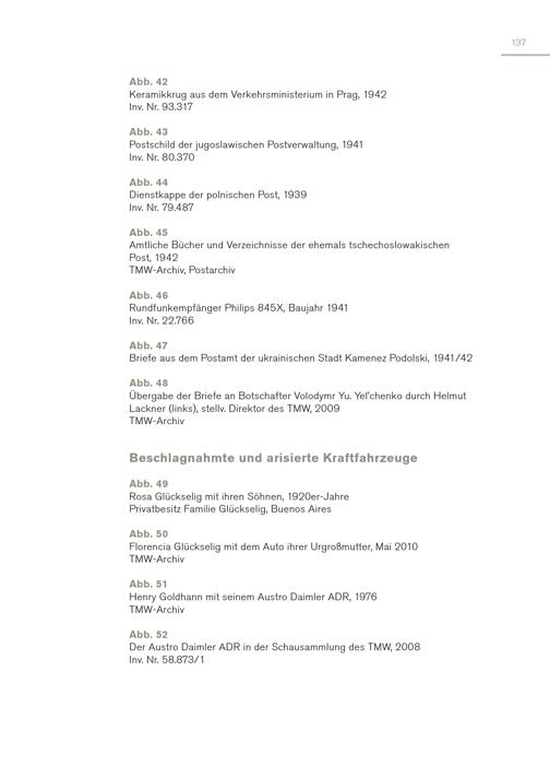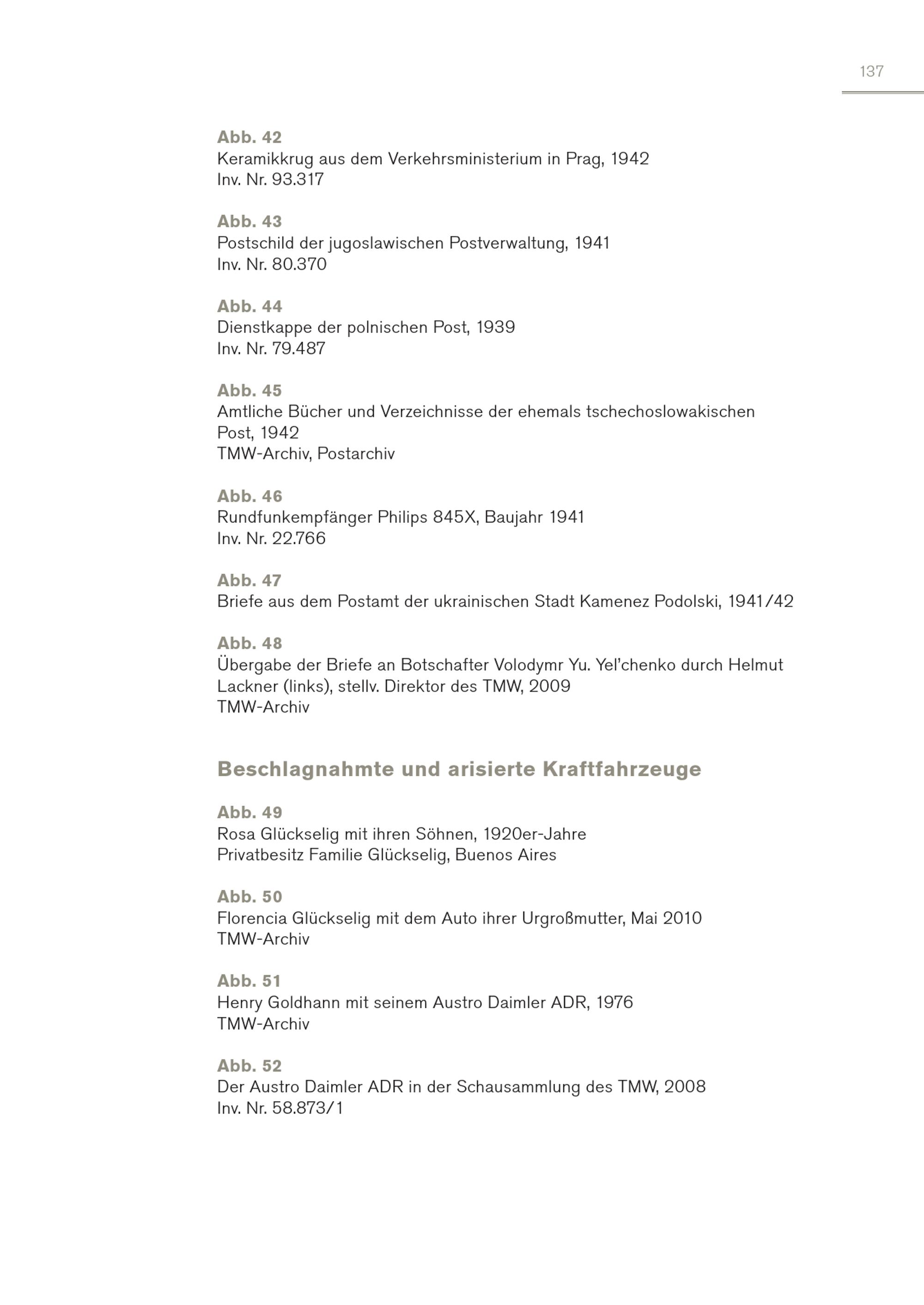 Abb. 42 Keramikkrug aus dem Verkehrsministerium in Prag, 1942 Inv. Nr. 93.317 Abb. 43 Postschild der jugoslawischen Postverwaltung, 1941 Inv. Nr. 80.370 Abb. 44 Dienstkappe der polnischen Post, 1939 Inv. Nr. 79.487 Abb. 45 Amtliche Bücher und Verzeichnisse der ehemals tschechoslowakischen Post, 1942 TMW-Archiv, Postarchiv Abb. 46 Rundfunkempfänger Philips 845X, Baujahr 1941 Inv. Nr. 22.766 Abb. 47 Briefe aus dem Postamt der ukrainischen Stadt Kamenez Podolski, 1941/42 Abb. 48 Übergabe der Briefe an Botschafter Volodymr Yu. Yel’chenko durch Helmut Lackner(links), stellv. Direktor des TMW, 2009 TMW-Archiv Beschlagnahmte und arisierte Kraftfahrzeuge Abb. 49 Rosa Glückselig mit ihren Söhnen, 1920er-Jahre Privatbesitz Familie Glückselig, Buenos Aires Abb. 50 Florencia Glückselig mit dem Auto ihrer Urgroßmutter, Mai 2010 TMW-Archiv Abb. 51 Henry Goldhann mit seinem Austro Daimler ADR, 1976 TMW-Archiv Abb. 52 Der Austro Daimler ADR in der Schausammlung des TMW, 2008 Inv. Nr. 58.873/1 137