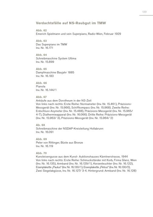 139 Verdachtsfälle auf NS-Raubgut im TMW Abb. 62 Emerich Spielmann und sein Superpiano, Radio-Wien, Februar 1929 Abb. 63 Das Superpiano im TMW Inv. Nr. 16.171 Abb. 64 Schreibmaschine System Ultima Inv. Nr. 15.899 Abb. 65 Dampfmaschine Baujahr 1885 Inv. Nr. 16.183 Abb. 66 Pianola Inv. Nr. 16.144/1 Abb. 67 Ankäufe aus dem Dorotheum in der NS-Zeit Von links nach rechts: Erste Reihe: Normameter(Inv. Nr. 15.461), PräzisionsMessgerät(Inv. Nr. 15.966), Schiffkompass(Inv. Nr. 15.968). Zweite Reihe: Erdschluss-Asymeter(Inv. Nr. 15.488), Präzisions-Messgerät(Inv. Nr. 15.965/ 4-7), Diathermieapparat(Inv. Nr. 16.066). Dritte Reihe: Präzisions-Messgerät (Inv. Nr. 15.963/ 3), Präzisions-Messgerät(Inv. Nr. 15.964/ 2) Ab. 68 Schreibmaschine der NSDAP-Kreisleitung Hollabrunn Inv. Nr. 16.091 Abb. 69 Peter von Rittinger, Büste aus Bronze Inv. Nr. 16.119 Abb. 70 Kunsteisengusse aus dem Kunst- Auktionshauses Kärntnerstrasse, 1944 Von links nach rechts: Erste Reihe: Schmuckständer mit Korb, Firma Glanz, Wien (Inv. Nr. 16.135), Armband(Inv. Nr. 16.129/1), Kerzenleuchter(Inv. Nr. 16.122), Eisenplakette„Paulus“(Inv. Nr. 16.130/1), Eisenplakette„Petrus“(Inv. Nr. 16.130/2), Zwei Siegelabgüsse, Inv. Nr. 16.127/ 3-4. Hintergrund: Armband(Inv. Nr. 16.128)