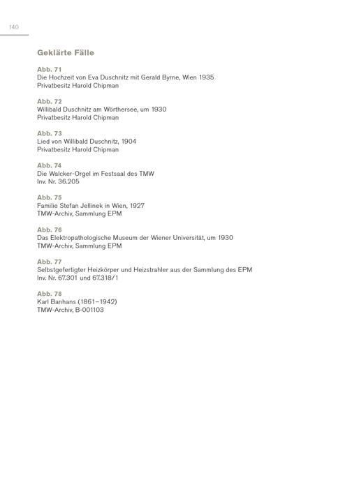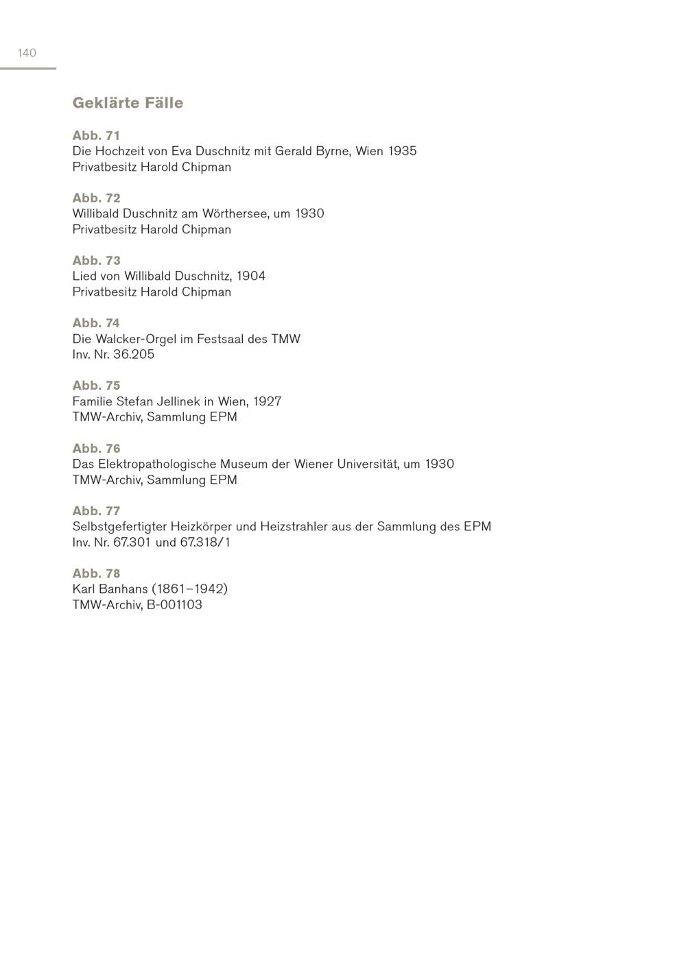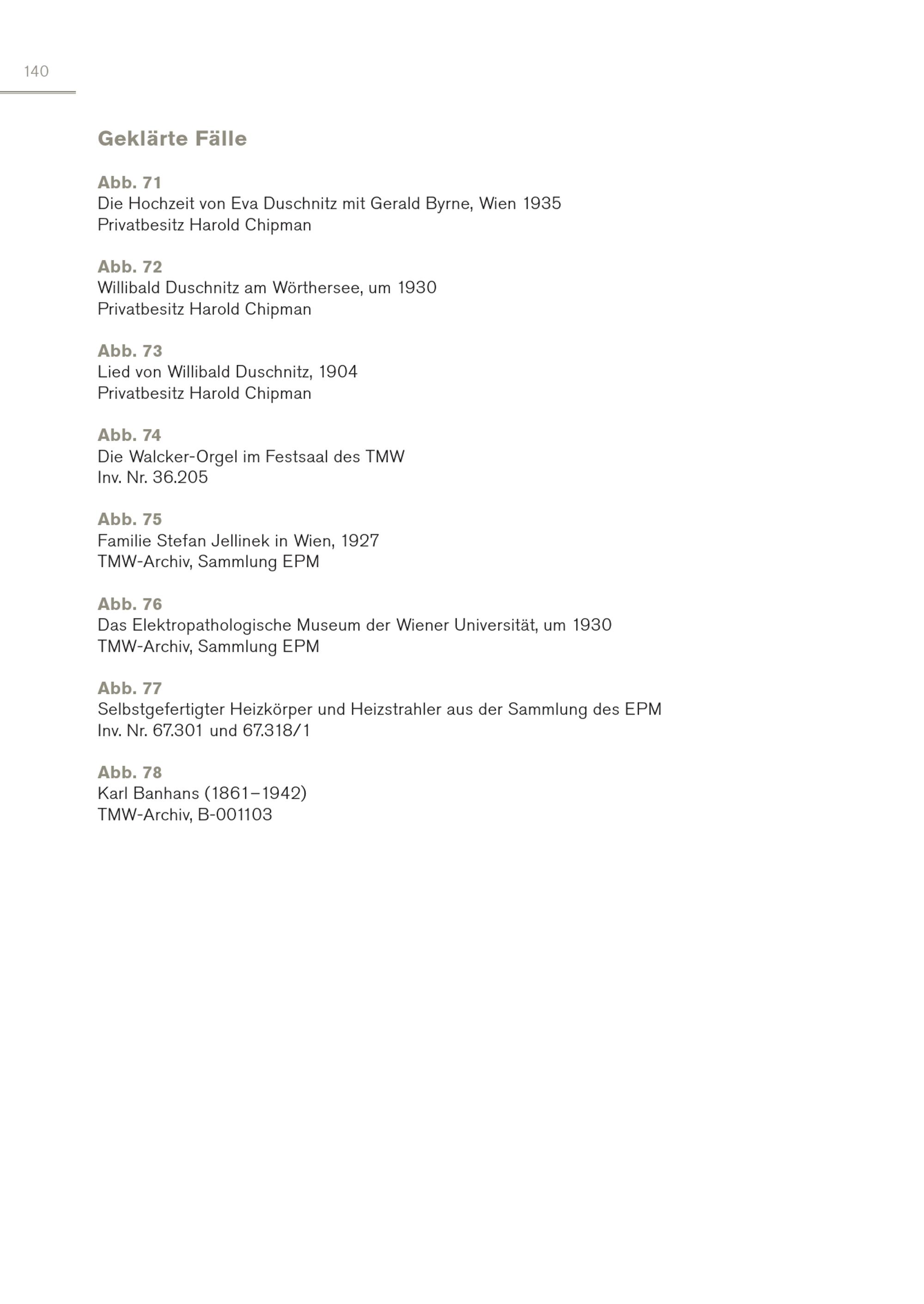140 Geklärte Fälle Abb. 71 Die Hochzeit von Eva Duschnitz mit Gerald Byrne, Wien 1935 Privatbesitz Harold Chipman Abb. 72 Willibald Duschnitz am Wörthersee, um 1930 Privatbesitz Harold Chipman Abb. 73 Lied von Willibald Duschnitz, 1904 Privatbesitz Harold Chipman Abb. 74 Die Walcker-Orgel im Festsaal des TMW Inv. Nr. 36.205 Abb. 75 Familie Stefan Jellinek in Wien, 1927 TMW-Archiv, Sammlung EPM Abb. 76 Das Elektropathologische Museum der Wiener Universität, um 1930 TMW-Archiv, Sammlung EPM Abb. 77 Selbstgefertigter Heizkörper und Heizstrahler aus der Sammlung des EPM Inv. Nr. 67.301 und 67.318/1 Abb. 78 Karl Banhans(1861–1942) TMW-Archiv, B-001103