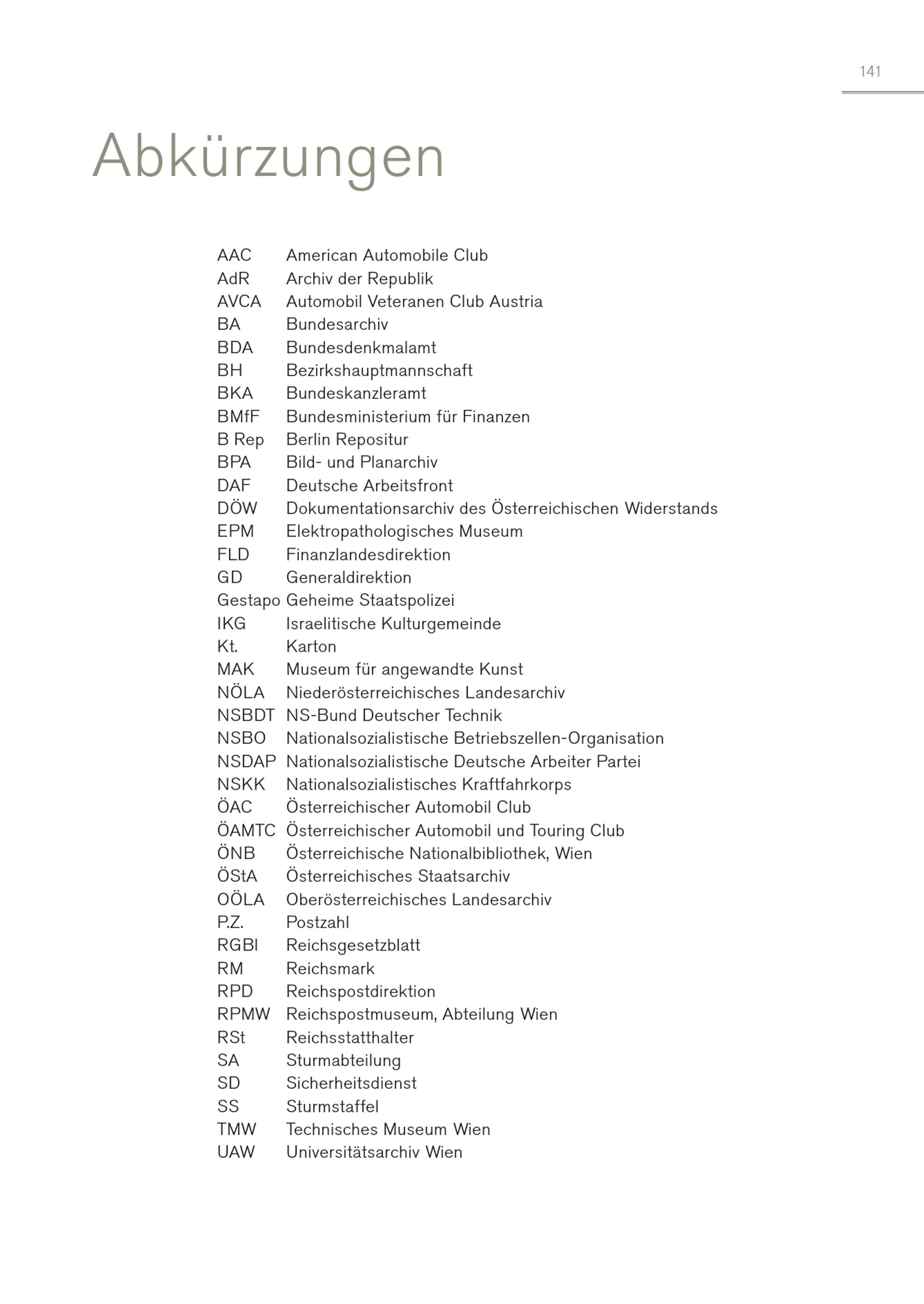 Abkürzungen AAC American Automobile Club AdR Archiv der Republik AVCA Automobil Veteranen Club Austria BA Bundesarchiv BDA Bundesdenkmalamt BH Bezirkshauptmannschaft BKA Bundeskanzleramt BMfF Bundesministerium für Finanzen B Rep Berlin Repositur BPA Bild- und Planarchiv DAF Deutsche Arbeitsfront DÖW Dokumentationsarchiv des Österreichischen Widerstands EPM Elektropathologisches Museum FLD Finanzlandesdirektion GD Generaldirektion Gestapo Geheime Staatspolizei IKG Israelitische Kulturgemeinde Kt. Karton MAK Museum für angewandte Kunst NÖLA Niederösterreichisches Landesarchiv NSBDT NS-Bund Deutscher Technik NSBO Nationalsozialistische Betriebszellen-Organisation NSDAP Nationalsozialistische Deutsche Arbeiter Partei NSKK Nationalsozialistisches Kraftfahrkorps ÖAC Österreichischer Automobil Club ÖAMTC Österreichischer Automobil und Touring Club ÖNB Österreichische Nationalbibliothek, Wien ÖStA Österreichisches Staatsarchiv OÖLA Oberösterreichisches Landesarchiv P.Z. Postzahl RGBl Reichsgesetzblatt RM Reichsmark RPD Reichspostdirektion RPMW Reichspostmuseum, Abteilung Wien RSt Reichsstatthalter SA Sturmabteilung SD Sicherheitsdienst SS Sturmstaffel TMW Technisches Museum Wien UAW Universitätsarchiv Wien 141