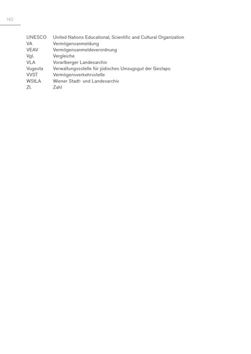 142 UNESCO United Nations Educational, Scientific and Cultural Organization VA Vermögensanmeldung VEAV Vermögensanmeldeverordnung Vgl. Vergleiche VLA Vorarlberger Landesarchiv Vugesta Verwaltungssstelle für jüdisches Umzugsgut der Gestapo VVST Vermögensverkehrsstelle WStLA Wiener Stadt- und Landesarchiv Zl. Zahl