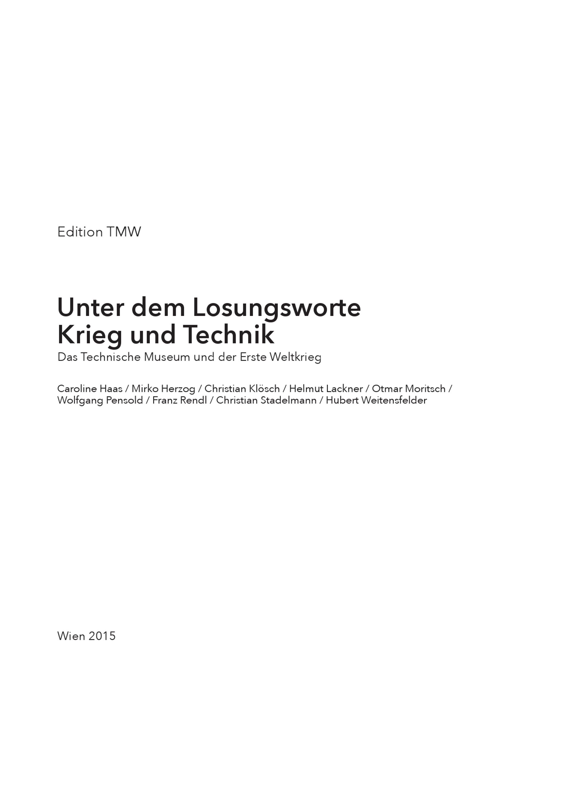 Edition TMW Unter dem Losungsworte Krieg und Technik Das Technische Museum und der Erste Weltkrieg Caroline Haas/ Mirko Herzog/ Christian Klösch/ Helmut Lackner/ Otmar Moritsch/ Wolfgang Pensold/ Franz Rendl/ Christian Stadelmann/ Hubert Weitensfelder Wien 2015