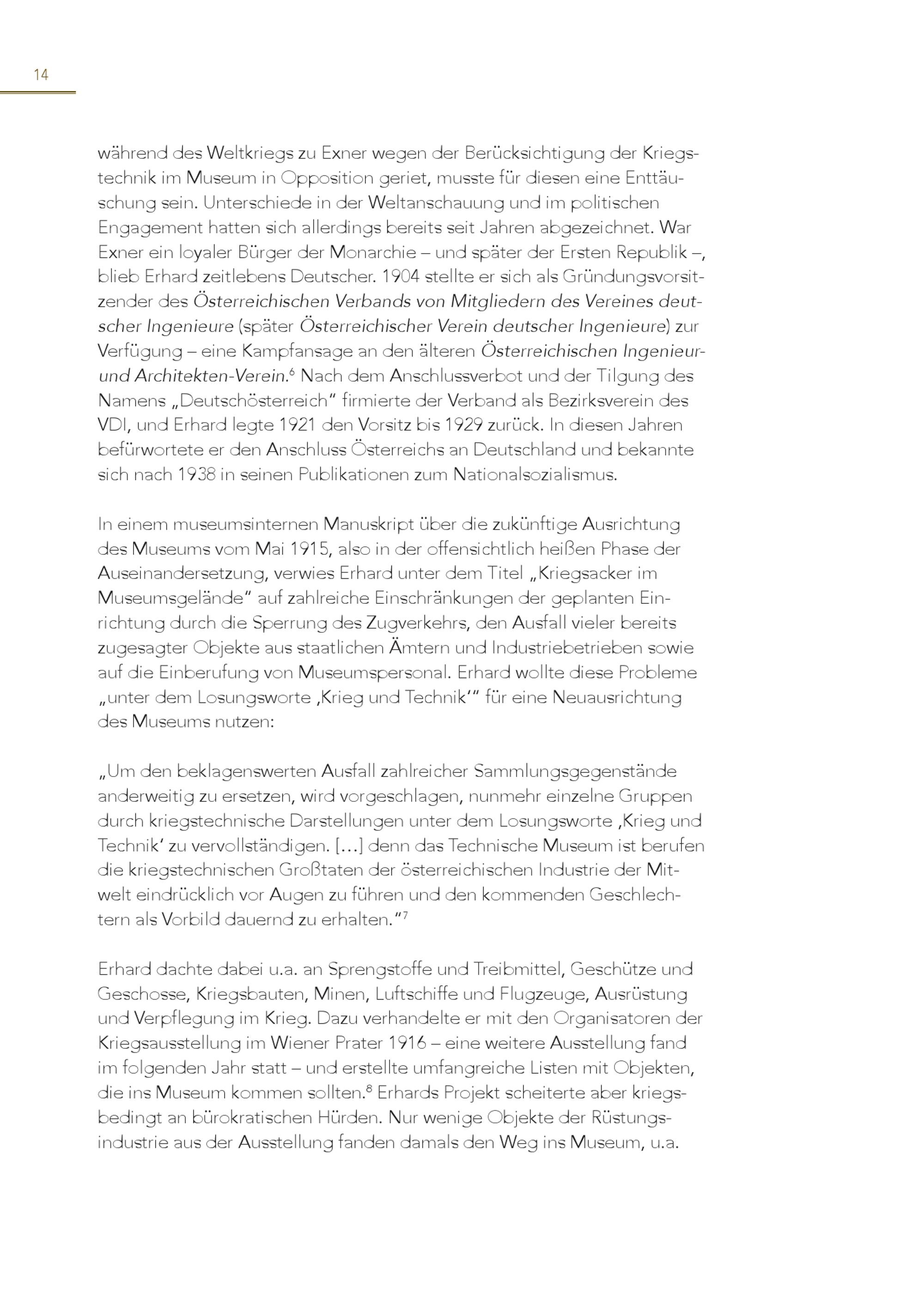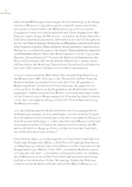 14 während des Weltkriegs zu Exner wegen der Berücksichtigung der Kriegstechnik im Museum in Opposition geriet, musste für diesen eine Enttäuschung sein. Unterschiede in der Weltanschauung und im politischen Engagement hatten sich allerdings bereits seit Jahren abgezeichnet. War Exner ein loyaler Bürger der Monarchie – und später der Ersten Republik –, blieb Erhard zeitlebens Deutscher. 1904 stellte er sich als Gründungsvorsitzender des Österreichischen Verbands von Mitgliedern des Vereines deutscher Ingenieure(später Österreichischer Verein deutscher Ingenieure) zur Verfügung – eine Kampfansage an den älteren Österreichischen Ingenieurund Architekten-Verein. 6 Nach dem Anschlussverbot und der Tilgung des Namens„Deutschösterreich“ firmierte der Verband als Bezirksverein des VDI, und Erhard legte 1921 den Vorsitz bis 1929 zurück. In diesen Jahren befürwortete er den Anschluss Österreichs an Deutschland und bekannte sich nach 1938 in seinen Publikationen zum Nationalsozialismus. In einem museumsinternen Manuskript über die zukünftige Ausrichtung des Museums vom Mai 1915, also in der offensichtlich heißen Phase der Auseinandersetzung, verwies Erhard unter dem Titel„Kriegsacker im Museumsgelände“ auf zahlreiche Einschränkungen der geplanten Einrichtung durch die Sperrung des Zugverkehrs, den Ausfall vieler bereits zugesagter Objekte aus staatlichen Ämtern und Industriebetrieben sowie auf die Einberufung von Museumspersonal. Erhard wollte diese Probleme „unter dem Losungsworte ‚Krieg und Technik‘“ für eine Neuausrichtung des Museums nutzen: „Um den beklagenswerten Ausfall zahlreicher Sammlungsgegenstände anderweitig zu ersetzen, wird vorgeschlagen, nunmehr einzelne Gruppen durch kriegstechnische Darstellungen unter dem Losungsworte ‚Krieg und Technik‘ zu vervollständigen.[…] denn das Technische Museum ist berufen die kriegstechnischen Großtaten der österreichischen Industrie der Mitwelt eindrücklich vor Augen zu führen und den kommenden Geschlechtern als Vorbild dauernd zu erhalten.“ 7 Erhard dachte dabei u.a. an Sprengstoffe und Treibmittel, Geschütze und Geschosse, Kriegsbauten, Minen, Luftschiffe und Flugzeuge, Ausrüstung und Verpflegung im Krieg. Dazu verhandelte er mit den Organisatoren der Kriegsausstellung im Wiener Prater 1916 – eine weitere Ausstellung fand im folgenden Jahr statt – und erstellte umfangreiche Listen mit Objekten, die ins Museum kommen sollten. 8 Erhards Projekt scheiterte aber kriegsbedingt an bürokratischen Hürden. Nur wenige Objekte der Rüstungsindustrie aus der Ausstellung fanden damals den Weg ins Museum, u.a.