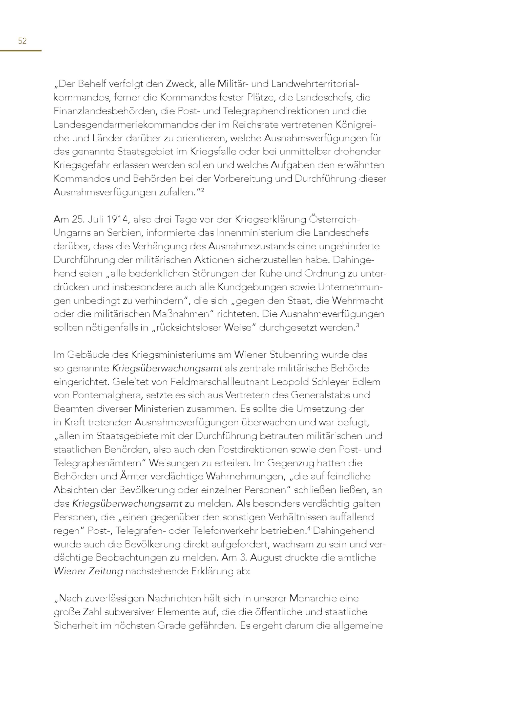 52 „Der Behelf verfolgt den Zweck, alle Militär- und Landwehrterritorialkommandos, ferner die Kommandos fester Plätze, die Landeschefs, die Finanzlandesbehörden, die Post- und Telegraphendirektionen und die Landesgendarmeriekommandos der im Reichsrate vertretenen Königreiche und Länder darüber zu orientieren, welche Ausnahmsverfügungen für das genannte Staatsgebiet im Kriegsfalle oder bei unmittelbar drohender Kriegsgefahr erlassen werden sollen und welche Aufgaben den erwähnten Kommandos und Behörden bei der Vorbereitung und Durchführung dieser Ausnahmsverfügungen zufallen.“ 2 Am 25. Juli 1914, also drei Tage vor der Kriegserklärung ÖsterreichUngarns an Serbien, informierte das Innenministerium die Landeschefs darüber, dass die Verhängung des Ausnahmezustands eine ungehinderte Durchführung der militärischen Aktionen sicherzustellen habe. Dahingehend seien„alle bedenklichen Störungen der Ruhe und Ordnung zu unterdrücken und insbesondere auch alle Kundgebungen sowie Unternehmungen unbedingt zu verhindern“, die sich„gegen den Staat, die Wehrmacht oder die militärischen Maßnahmen“ richteten. Die Ausnahmeverfügungen sollten nötigenfalls in„rücksichtsloser Weise“ durchgesetzt werden. 3 Im Gebäude des Kriegsministeriums am Wiener Stubenring wurde das so genannte Kriegsüberwachungsamt als zentrale militärische Behörde eingerichtet. Geleitet von Feldmarschallleutnant Leopold Schleyer Edlem von Pontemalghera, setzte es sich aus Vertretern des Generalstabs und Beamten diverser Ministerien zusammen. Es sollte die Umsetzung der in Kraft tretenden Ausnahmeverfügungen überwachen und war befugt, „allen im Staatsgebiete mit der Durchführung betrauten militärischen und staatlichen Behörden, also auch den Postdirektionen sowie den Post- und Telegraphenämtern“ Weisungen zu erteilen. Im Gegenzug hatten die Behörden und Ämter verdächtige Wahrnehmungen,„die auf feindliche Absichten der Bevölkerung oder einzelner Personen“ schließen ließen, an das Kriegsüberwachungsamt zu melden. Als besonders verdächtig galten Personen, die„einen gegenüber den sonstigen Verhältnissen auffallend regen“ Post-, Telegrafen- oder Telefonverkehr betrieben. 4 Dahingehend wurde auch die Bevölkerung direkt aufgefordert, wachsam zu sein und verdächtige Beobachtungen zu melden. Am 3. August druckte die amtliche Wiener Zeitung nachstehende Erklärung ab: „Nach zuverlässigen Nachrichten hält sich in unserer Monarchie eine große Zahl subversiver Elemente auf, die die öffentliche und staatliche Sicherheit im höchsten Grade gefährden. Es ergeht darum die allgemeine