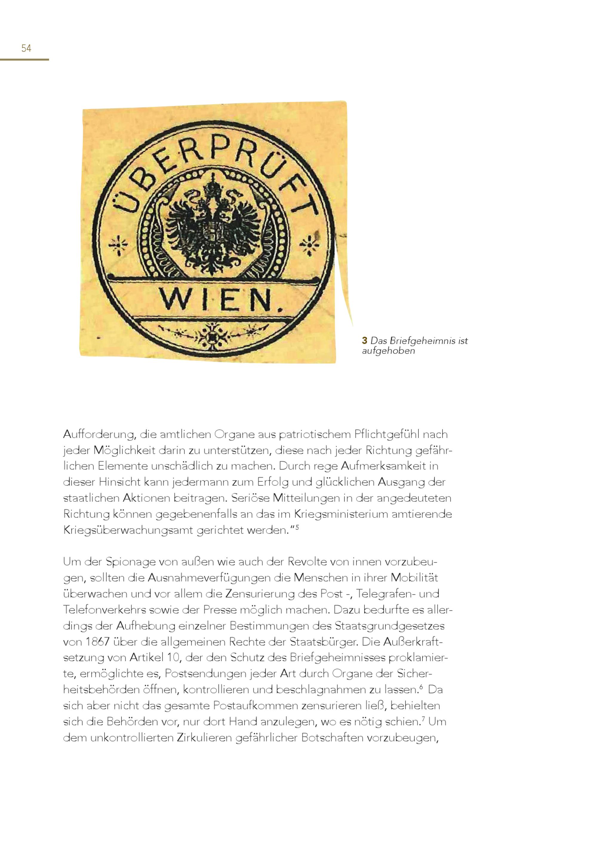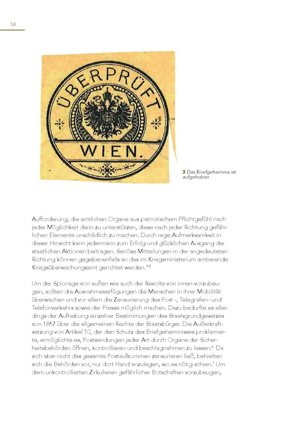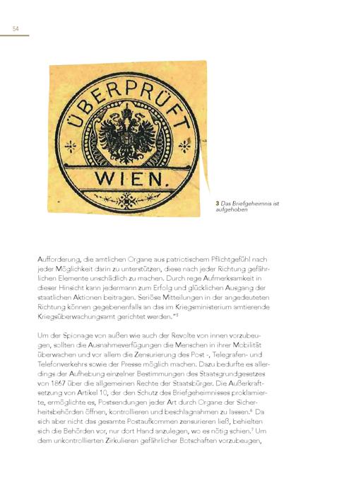 54 3 auDfgaeshBorbieefngeheimnis ist Aufforderung, die amtlichen Organe aus patriotischem Pflichtgefühl nach jeder Möglichkeit darin zu unterstützen, diese nach jeder Richtung gefährlichen Elemente unschädlich zu machen. Durch rege Aufmerksamkeit in dieser Hinsicht kann jedermann zum Erfolg und glücklichen Ausgang der staatlichen Aktionen beitragen. Seriöse Mitteilungen in der angedeuteten Richtung können gegebenenfalls an das im Kriegsministerium amtierende Kriegsüberwachungsamt gerichtet werden.“ 5 Um der Spionage von außen wie auch der Revolte von innen vorzubeugen, sollten die Ausnahmeverfügungen die Menschen in ihrer Mobilität überwachen und vor allem die Zensurierung des Post-, Telegrafen- und Telefonverkehrs sowie der Presse möglich machen. Dazu bedurfte es allerdings der Aufhebung einzelner Bestimmungen des Staatsgrundgesetzes von 1867 über die allgemeinen Rechte der Staatsbürger. Die Außerkraftsetzung von Artikel 10, der den Schutz des Briefgeheimnisses proklamierte, ermöglichte es, Postsendungen jeder Art durch Organe der Sicherheitsbehörden öffnen, kontrollieren und beschlagnahmen zu lassen. 6 Da sich aber nicht das gesamte Postaufkommen zensurieren ließ, behielten sich die Behörden vor, nur dort Hand anzulegen, wo es nötig schien. 7 Um dem unkontrollierten Zirkulieren gefährlicher Botschaften vorzubeugen,