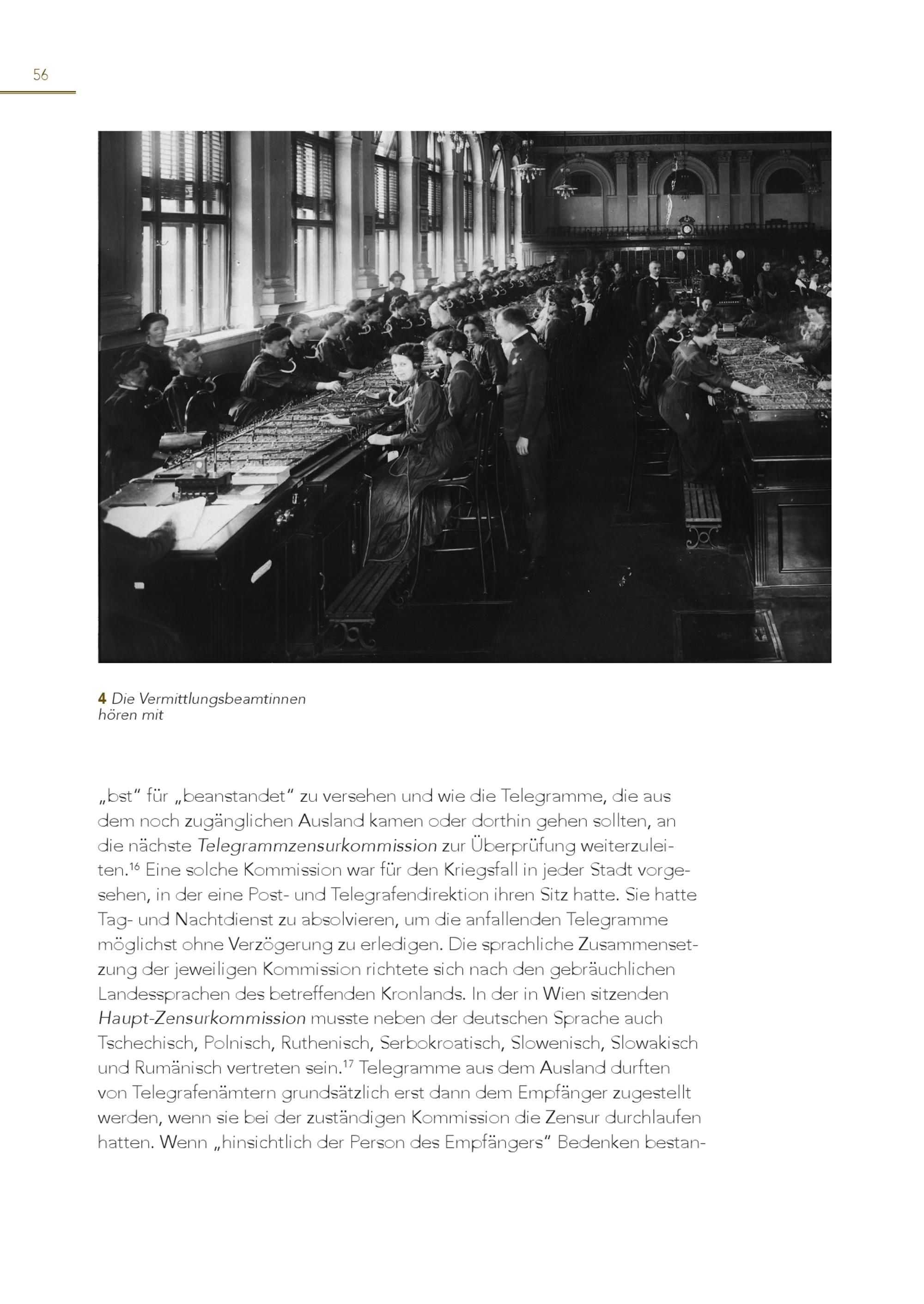 56 4 höDreien Vmeirtmittlungsbeamtinnen „bst“ für„beanstandet“ zu versehen und wie die Telegramme, die aus dem noch zugänglichen Ausland kamen oder dorthin gehen sollten, an die nächste Telegrammzensurkommission zur Überprüfung weiterzuleiten. 16 Eine solche Kommission war für den Kriegsfall in jeder Stadt vorgesehen, in der eine Post- und Telegrafendirektion ihren Sitz hatte. Sie hatte Tag- und Nachtdienst zu absolvieren, um die anfallenden Telegramme möglichst ohne Verzögerung zu erledigen. Die sprachliche Zusammensetzung der jeweiligen Kommission richtete sich nach den gebräuchlichen Landessprachen des betreffenden Kronlands. In der in Wien sitzenden Haupt-Zensurkommission musste neben der deutschen Sprache auch Tschechisch, Polnisch, Ruthenisch, Serbokroatisch, Slowenisch, Slowakisch und Rumänisch vertreten sein. 17 Telegramme aus dem Ausland durften von Telegrafenämtern grundsätzlich erst dann dem Empfänger zugestellt werden, wenn sie bei der zuständigen Kommission die Zensur durchlaufen hatten. Wenn„hinsichtlich der Person des Empfängers“ Bedenken bestan-