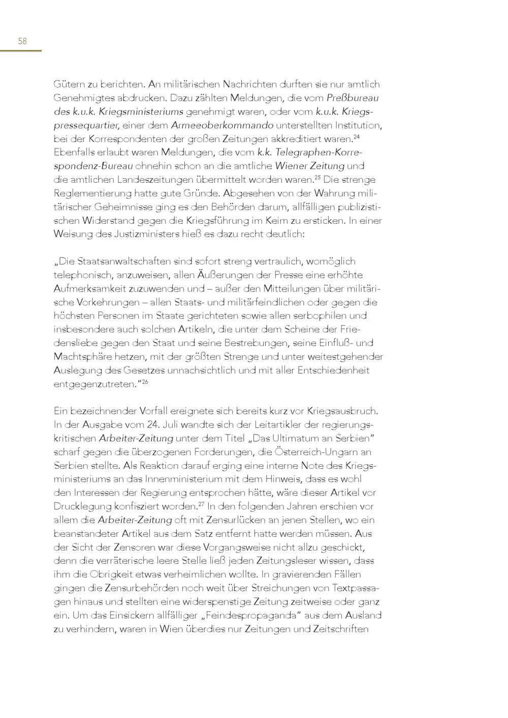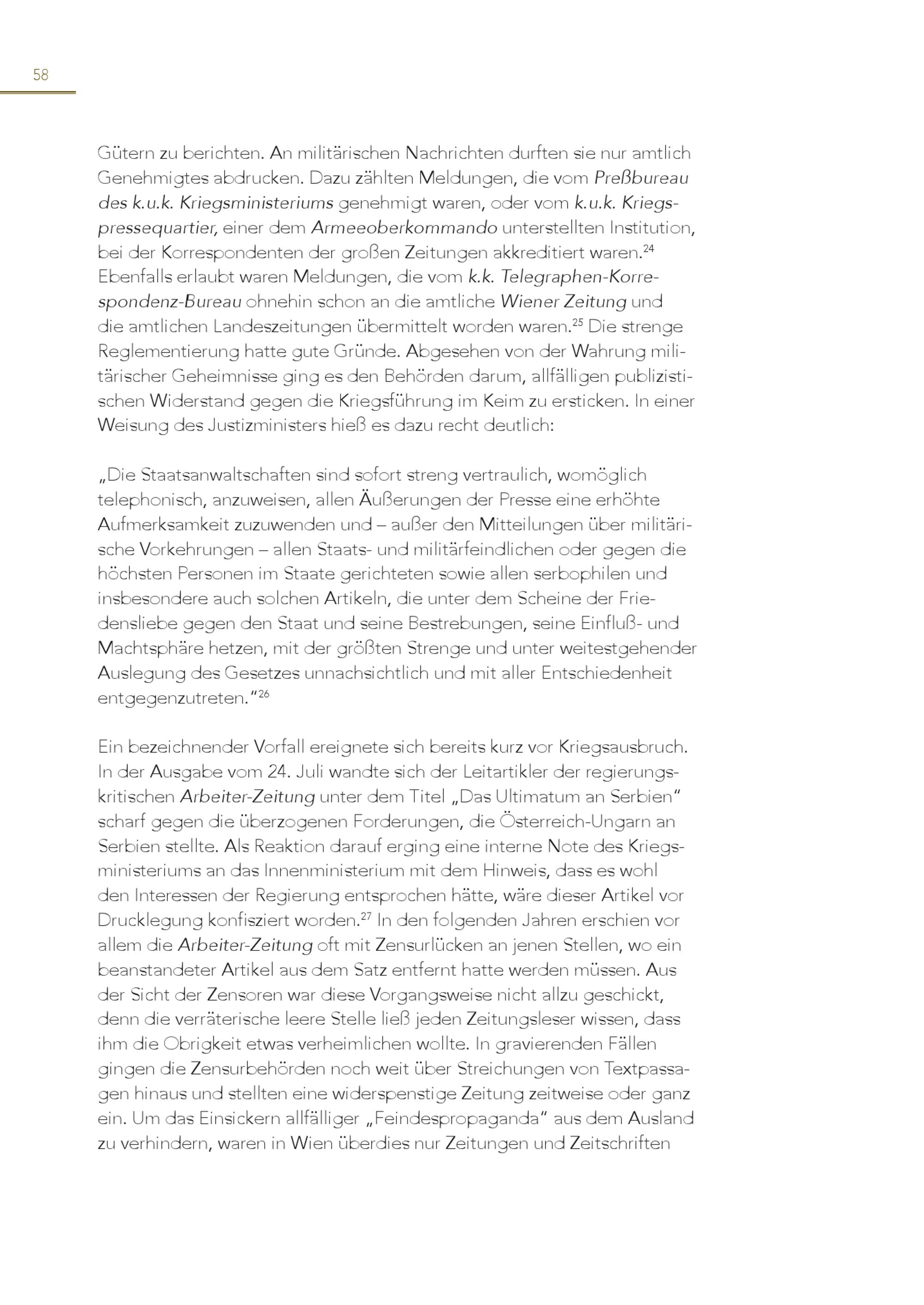 58 Gütern zu berichten. An militärischen Nachrichten durften sie nur amtlich Genehmigtes abdrucken. Dazu zählten Meldungen, die vom Preßbureau des k.u.k. Kriegsministeriums genehmigt waren, oder vom k.u.k. Kriegspressequartier, einer dem Armeeoberkommando unterstellten Institution, bei der Korrespondenten der großen Zeitungen akkreditiert waren. 24 Ebenfalls erlaubt waren Meldungen, die vom k.k. Telegraphen-Korrespondenz-Bureau ohnehin schon an die amtliche Wiener Zeitung und die amtlichen Landeszeitungen übermittelt worden waren. 25 Die strenge Reglementierung hatte gute Gründe. Abgesehen von der Wahrung militärischer Geheimnisse ging es den Behörden darum, allfälligen publizistischen Widerstand gegen die Kriegsführung im Keim zu ersticken. In einer Weisung des Justizministers hieß es dazu recht deutlich: „Die Staatsanwaltschaften sind sofort streng vertraulich, womöglich telephonisch, anzuweisen, allen Äußerungen der Presse eine erhöhte Aufmerksamkeit zuzuwenden und – außer den Mitteilungen über militärische Vorkehrungen – allen Staats- und militärfeindlichen oder gegen die höchsten Personen im Staate gerichteten sowie allen serbophilen und insbesondere auch solchen Artikeln, die unter dem Scheine der Friedensliebe gegen den Staat und seine Bestrebungen, seine Einfluß- und Machtsphäre hetzen, mit der größten Strenge und unter weitestgehender Auslegung des Gesetzes unnachsichtlich und mit aller Entschiedenheit entgegenzutreten.“ 26 Ein bezeichnender Vorfall ereignete sich bereits kurz vor Kriegsausbruch. In der Ausgabe vom 24. Juli wandte sich der Leitartikler der regierungskritischen Arbeiter-Zeitung unter dem Titel„Das Ultimatum an Serbien“ scharf gegen die überzogenen Forderungen, die Österreich-Ungarn an Serbien stellte. Als Reaktion darauf erging eine interne Note des Kriegsministeriums an das Innenministerium mit dem Hinweis, dass es wohl den Interessen der Regierung entsprochen hätte, wäre dieser Artikel vor Drucklegung konfisziert worden. 27 In den folgenden Jahren erschien vor allem die Arbeiter-Zeitung oft mit Zensurlücken an jenen Stellen, wo ein beanstandeter Artikel aus dem Satz entfernt hatte werden müssen. Aus der Sicht der Zensoren war diese Vorgangsweise nicht allzu geschickt, denn die verräterische leere Stelle ließ jeden Zeitungsleser wissen, dass ihm die Obrigkeit etwas verheimlichen wollte. In gravierenden Fällen gingen die Zensurbehörden noch weit über Streichungen von Textpassagen hinaus und stellten eine widerspenstige Zeitung zeitweise oder ganz ein. Um das Einsickern allfälliger„Feindespropaganda“ aus dem Ausland zu verhindern, waren in Wien überdies nur Zeitungen und Zeitschriften