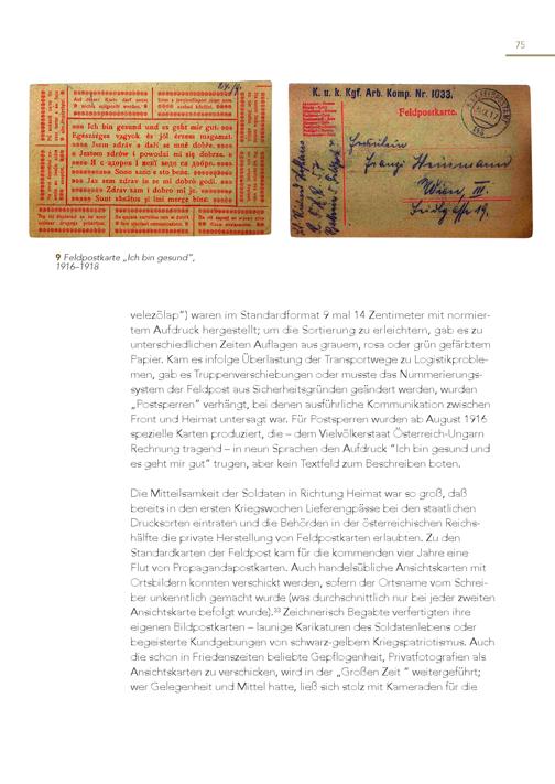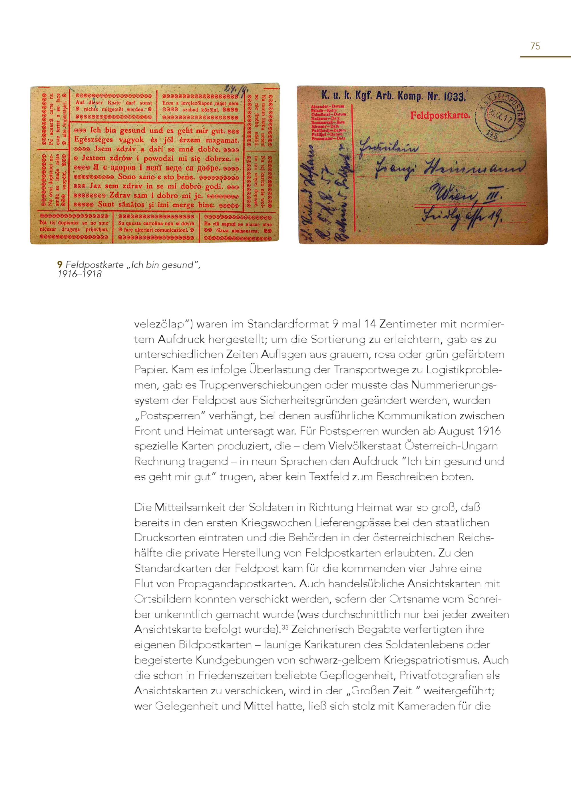 75 9 19F1e6l–d1p9o1s8tkarte „ Ich bin gesund”, velezölap“) waren im Standardformat 9 mal 14 Zentimeter mit normier tem Aufdruck hergestellt; um die Sortierung zu erleichtern, gab es zu unterschiedlichen Zeiten Auflagen aus grauem, rosa oder grün gefärbtem Papier. Kam es infolge Überlastung der Transportwege zu Logistikproblemen, gab es Truppenverschiebungen oder musste das Nummerierungs system der Feldpost aus Sicherheitsgründen geändert werden, wurden „Postsperren” verhängt, bei denen ausführliche Kommunikation zwischen Front und Heimat untersagt war. Für Postsperren wurden ab August 1916 spezielle Karten produziert, die – dem Vielvölkerstaat Österreich-Ungarn Rechnung tragend – in neun Sprachen den Aufdruck“Ich bin gesund und es geht mir gut” trugen, aber kein Textfeld zum Beschreiben boten. Die Mitteilsamkeit der Soldaten in Richtung Heimat war so groß, daß bereits in den ersten Kriegswochen Lieferengpässe bei den staatlichen Drucksorten eintraten und die Behörden in der österreichischen Reichs hälfte die private Herstellung von Feldpostkarten erlaubten. Zu den Standardkarten der Feldpost kam für die kommenden vier Jahre eine Flut von Propagandapostkarten. Auch handelsübliche Ansichtskarten mit Ortsbildern konnten verschickt werden, sofern der Ortsname vom Schreiber unkenntlich gemacht wurde(was durchschnittlich nur bei jeder zweiten Ansichtskarte befolgt wurde). 33 Zeichnerisch Begabte verfertigten ihre eigenen Bildpostkarten – launige Karikaturen des Soldatenlebens oder begeisterte Kundgebungen von schwarz-gelbem Kriegspatriotismus. Auch die schon in Friedenszeiten beliebte Gepflogenheit, Privatfotografien als Ansichtskarten zu verschicken, wird in der„Großen Zeit“ weitergeführt; wer Gelegenheit und Mittel hatte, ließ sich stolz mit Kameraden für die