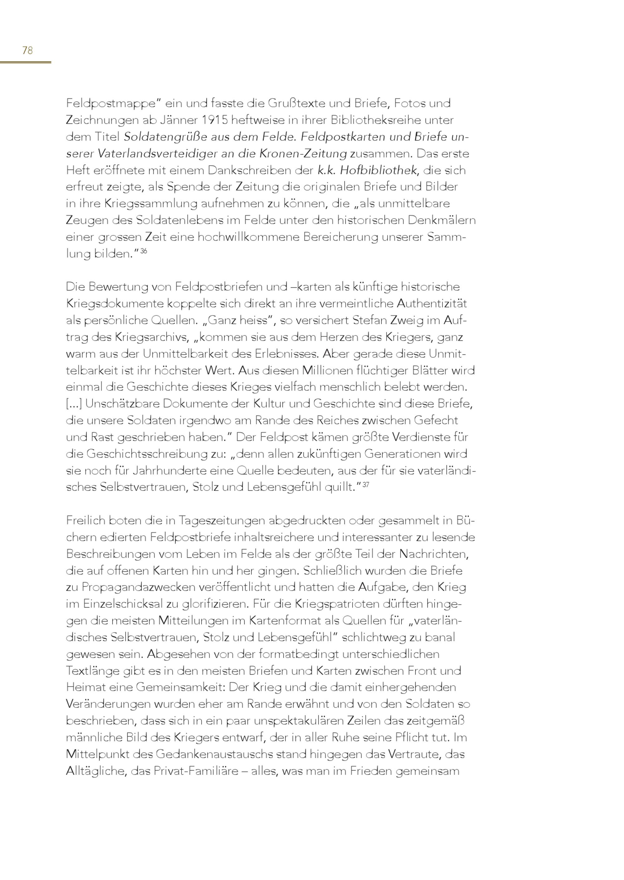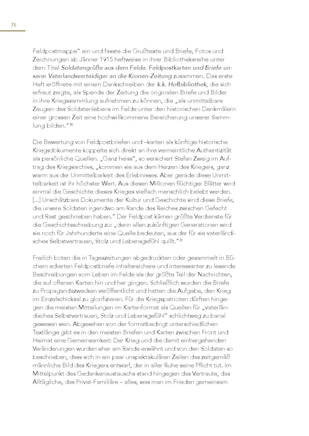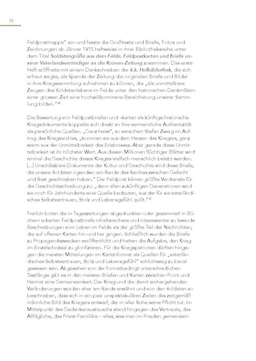 78 Feldpostmappe” ein und fasste die Grußtexte und Briefe, Fotos und Zeichnungen ab Jänner 1915 heftweise in ihrer Bibliotheksreihe unter dem Titel Soldatengrüße aus dem Felde. Feldpostkarten und Briefe unserer Vaterlandsverteidiger an die Kronen-Zeitung zusammen. Das erste Heft eröffnete mit einem Dankschreiben der k.k. Hofbibliothek, die sich erfreut zeigte, als Spende der Zeitung die originalen Briefe und Bilder in ihre Kriegssammlung aufnehmen zu können, die„als unmittelbare Zeugen des Soldatenlebens im Felde unter den historischen Denkmälern einer grossen Zeit eine hochwillkommene Bereicherung unserer Sammlung bilden.” 36 Die Bewertung von Feldpostbriefen und –karten als künftige historische Kriegsdokumente koppelte sich direkt an ihre vermeintliche Authentizität als persönliche Quellen.„Ganz heiss”, so versichert Stefan Zweig im Auftrag des Kriegsarchivs,„kommen sie aus dem Herzen des Kriegers, ganz warm aus der Unmittelbarkeit des Erlebnisses. Aber gerade diese Unmittelbarkeit ist ihr höchster Wert. Aus diesen Millionen flüchtiger Blätter wird einmal die Geschichte dieses Krieges vielfach menschlich belebt werden. [...] Unschätzbare Dokumente der Kultur und Geschichte sind diese Briefe, die unsere Soldaten irgendwo am Rande des Reiches zwischen Gefecht und Rast geschrieben haben.” Der Feldpost kämen größte Verdienste für die Geschichtsschreibung zu:„denn allen zukünftigen Generationen wird sie noch für Jahrhunderte eine Quelle bedeuten, aus der für sie vaterländisches Selbstvertrauen, Stolz und Lebensgefühl quillt.” 37 Freilich boten die in Tageszeitungen abgedruckten oder gesammelt in Bü chern edierten Feldpostbriefe inhaltsreichere und interessanter zu lesende Beschreibungen vom Leben im Felde als der größte Teil der Nachrichten, die auf offenen Karten hin und her gingen. Schließlich wurden die Briefe zu Propagandazwecken veröffentlicht und hatten die Aufgabe, den Krieg im Einzelschicksal zu glorifizieren. Für die Kriegspatrioten dürften hinge gen die meisten Mitteilungen im Kartenformat als Quellen für„vaterländisches Selbstvertrauen, Stolz und Lebensgefühl” schlichtweg zu banal gewesen sein. Abgesehen von der formatbedingt unterschiedlichen Textlänge gibt es in den meisten Briefen und Karten zwischen Front und Heimat eine Gemeinsamkeit: Der Krieg und die damit einhergehenden Veränderungen wurden eher am Rande erwähnt und von den Soldaten so beschrieben, dass sich in ein paar unspektakulären Zeilen das zeitgemäß männliche Bild des Kriegers entwarf, der in aller Ruhe seine Pflicht tut. Im Mittelpunkt des Gedankenaustauschs stand hingegen das Vertraute, das Alltägliche, das Privat-Familiäre – alles, was man im Frieden gemeinsam